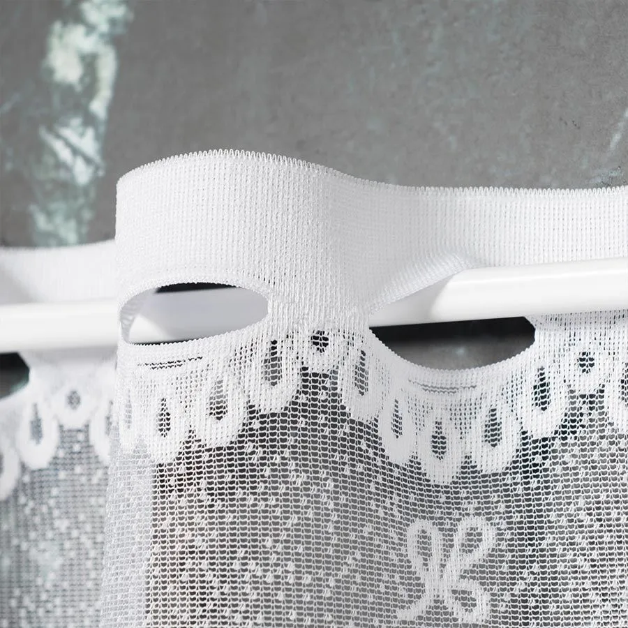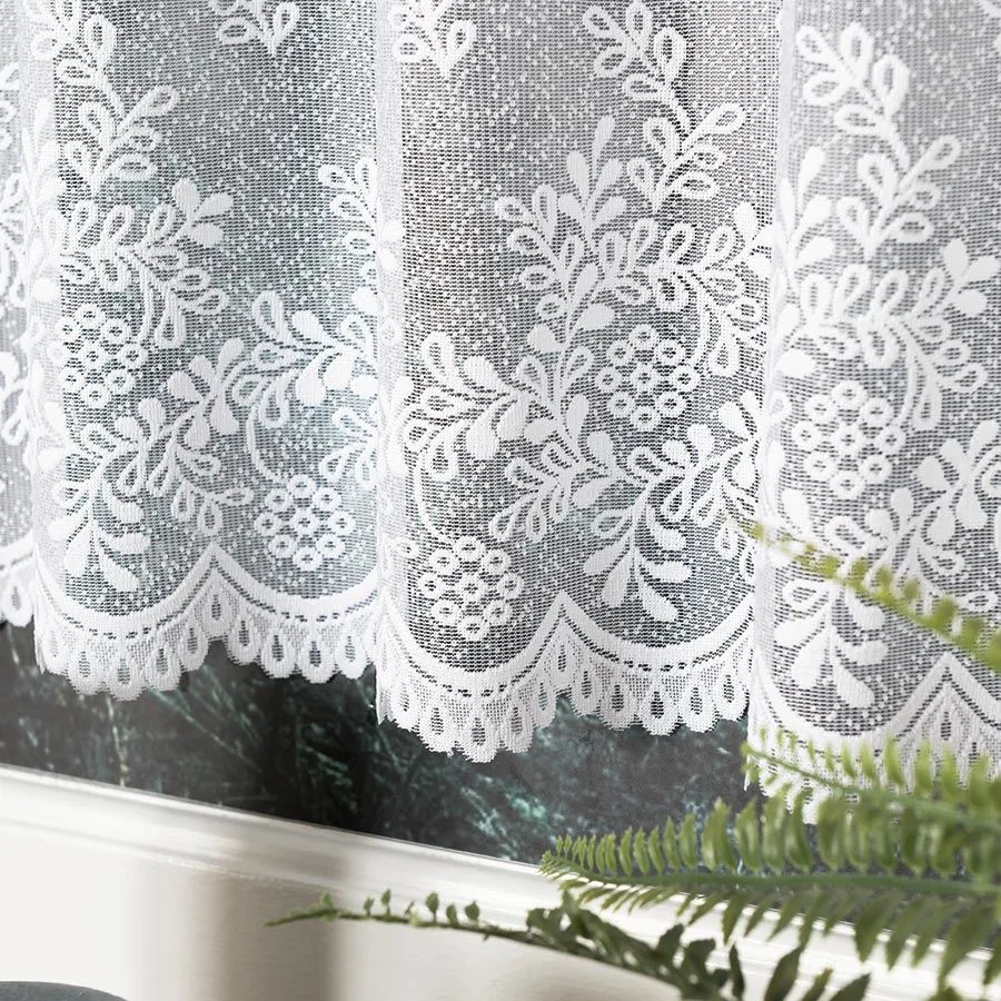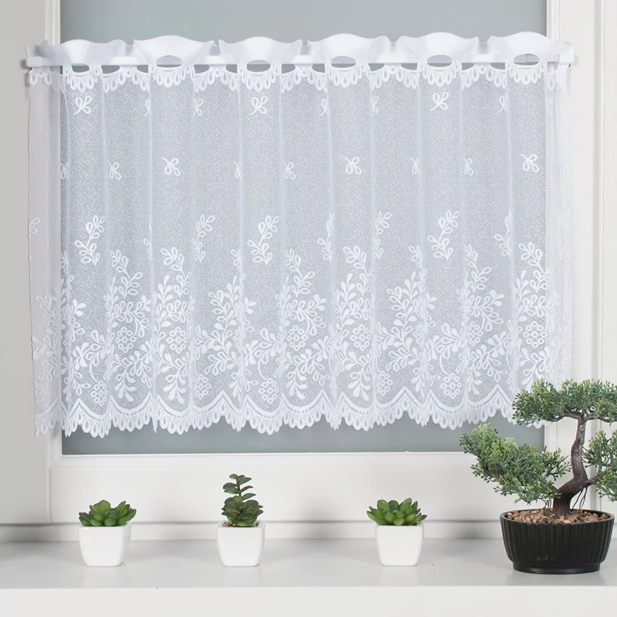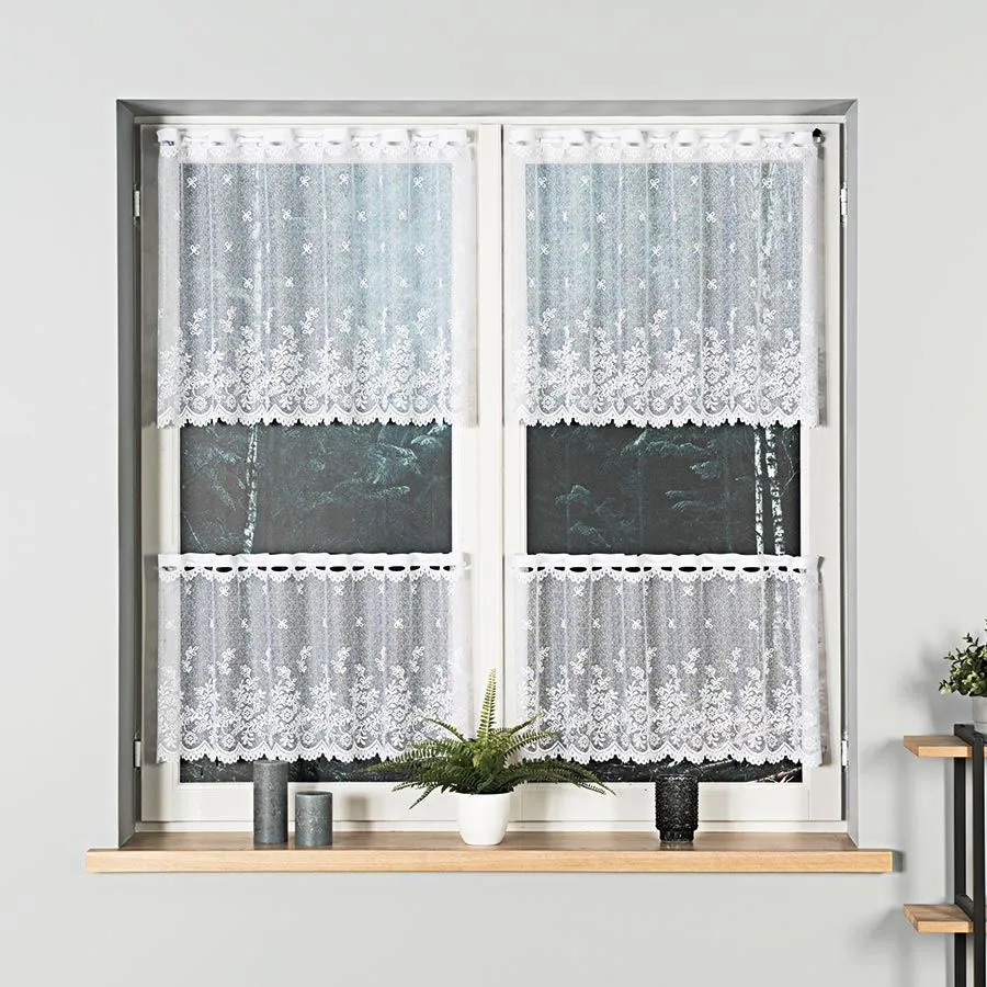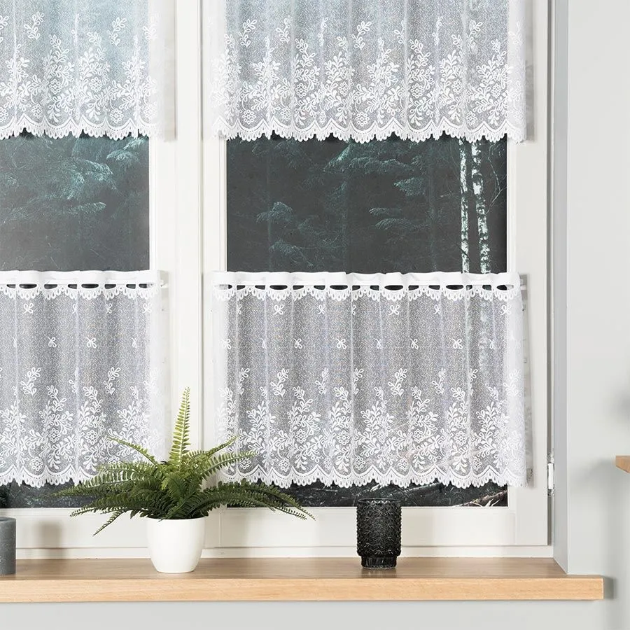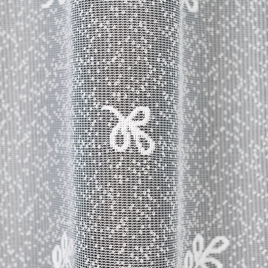 Firanka żakardowa dostępna w metrażu, kolor: biały, motyw: rośliny/kwiaty, wiele wysokości do wyboru, szerokość dowolna, dzięki czemu dopasujesz ją dokładnie do swojego okna. Firankę możesz zamówić z usługą szycia w naszej profesjonalnej szwalni - wybierz wykończenie, podaj wymiary, a otrzymasz uszytą i gotową do zawieszenia firankę. Najwyższa jakość przędzy żakardowej idealnie wkomponuje się w aranżację wnętrz nowoczesnych jak i tych urządzonych w klasycznym stylu. Firanka pięknie się układa, nie wymaga prasowania i można ją prać w pralce w niskiej temperaturze. Cechuje ją dobra przepuszczalność powietrza i promieni słonecznych.