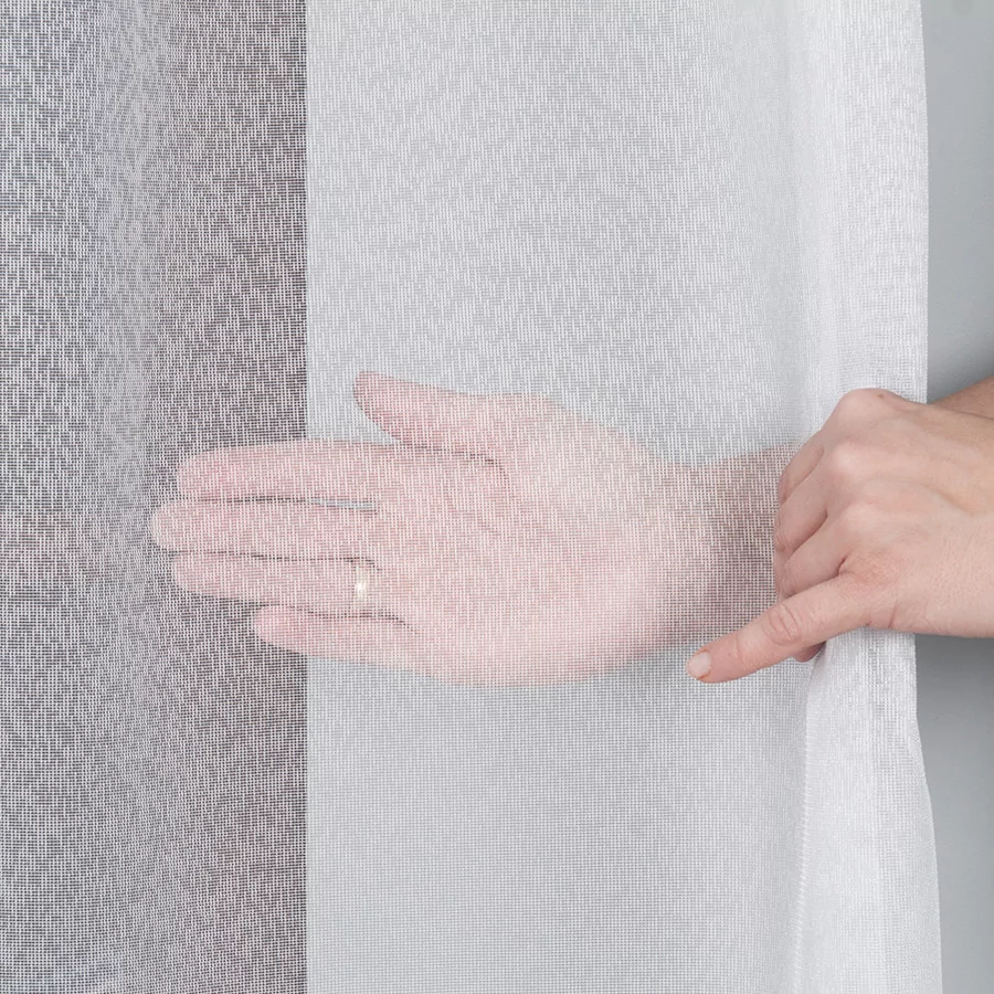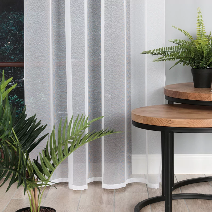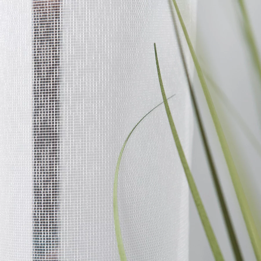 Firana wykonana została na cienkim, delikatnym, siatkowym podkładzie, zwanym markizetą. Tkaninę cechuje niezwykła lekkość i zwiewność. Pomimo swojej prostej formy jest niebywale efektowną tkaniną. Pięknie się układa, można ją prać w pralce w niskiej temperaturze i nie wymaga prasowania.