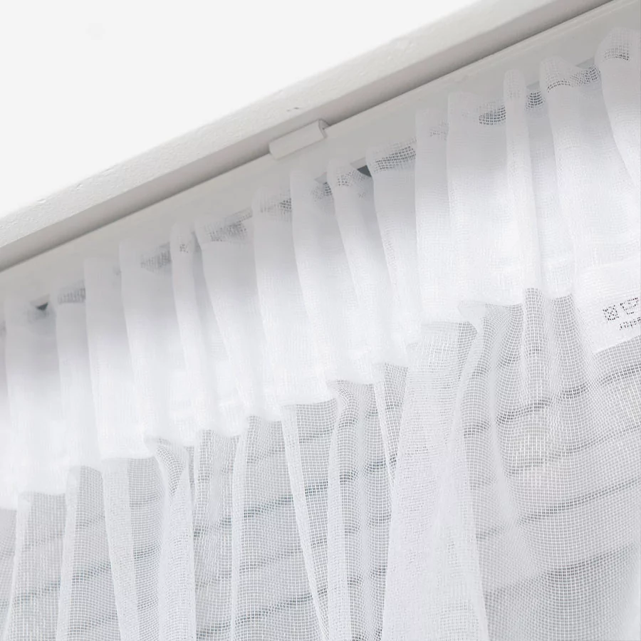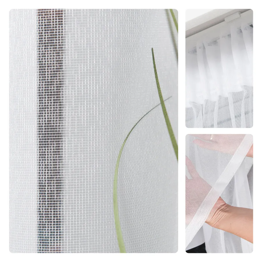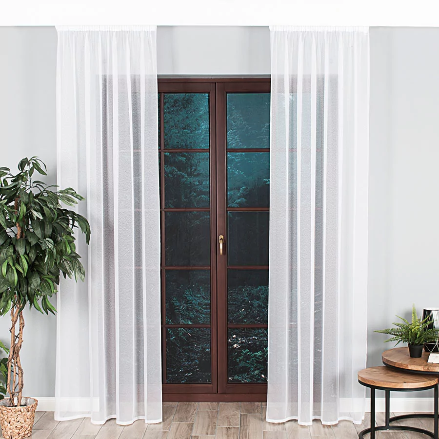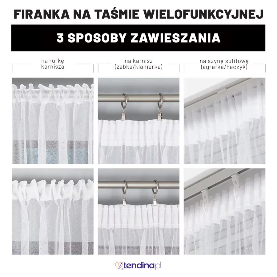 Gotowa do zawieszenia firanka MALLA. Wykończona taśmą marszczącą, którą możesz powiesić na różne sposoby. Zastosowana wielofunkcyjna taśma marszcząca pozwala na zawieszenie zasłony na rurkę (ukryte szelki), na karnisz (żabka, klamerka) lub na szynę (haczyk, agrafka).