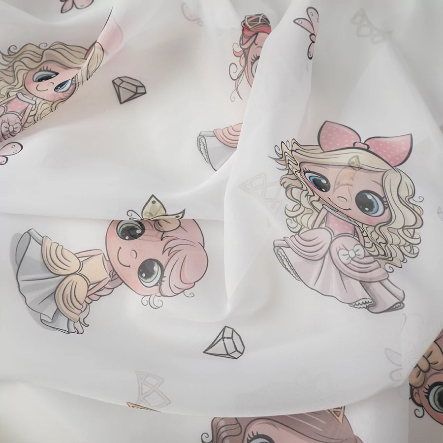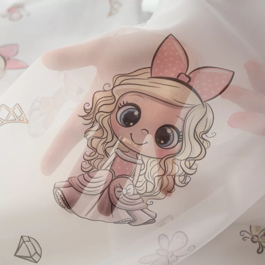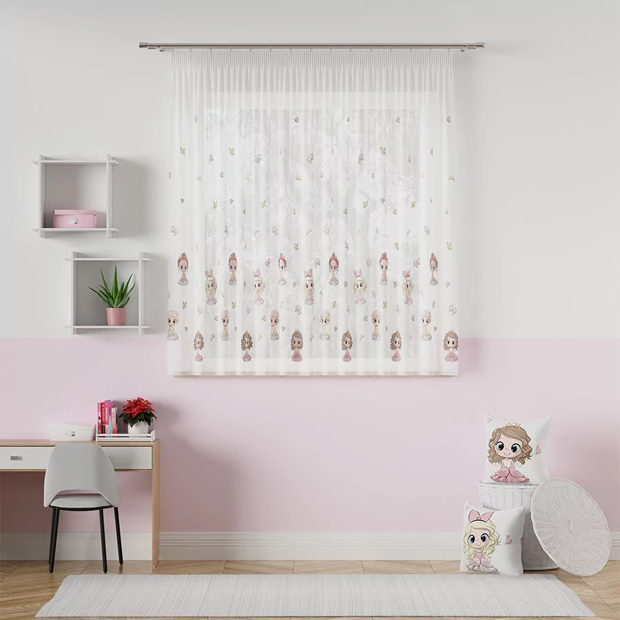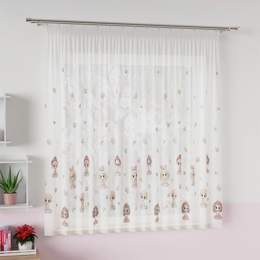 Firanka woalowa drukowana PRINCESS wykonana z najwyższej jakości materiału, zdobiona dziecięcym motywem. Idealna propozycja na aranżację okienną w pokoju małych księżniczek. Firankę możesz zamówić z usługą szycia w naszej profesjonalnej szwalni - wybierz taśmę lub przelotki, podaj wymiary, a otrzymasz uszytą i gotową do zawieszenia firankę. Fantazyjna dzianina, zwana też woalem, to niezwykle lekki, delikatnie połyskujący materiał, który znakomicie się układa – wszystko to sprawia, że tkanina doskonale nadaje się do szycia lambrekinów czy firanek. Tkanina w uniwersalnym, białym kolorze z kolorowym motywem wprowadzi do dziecięcego pokoju odrobinę magicznego świata bajek.