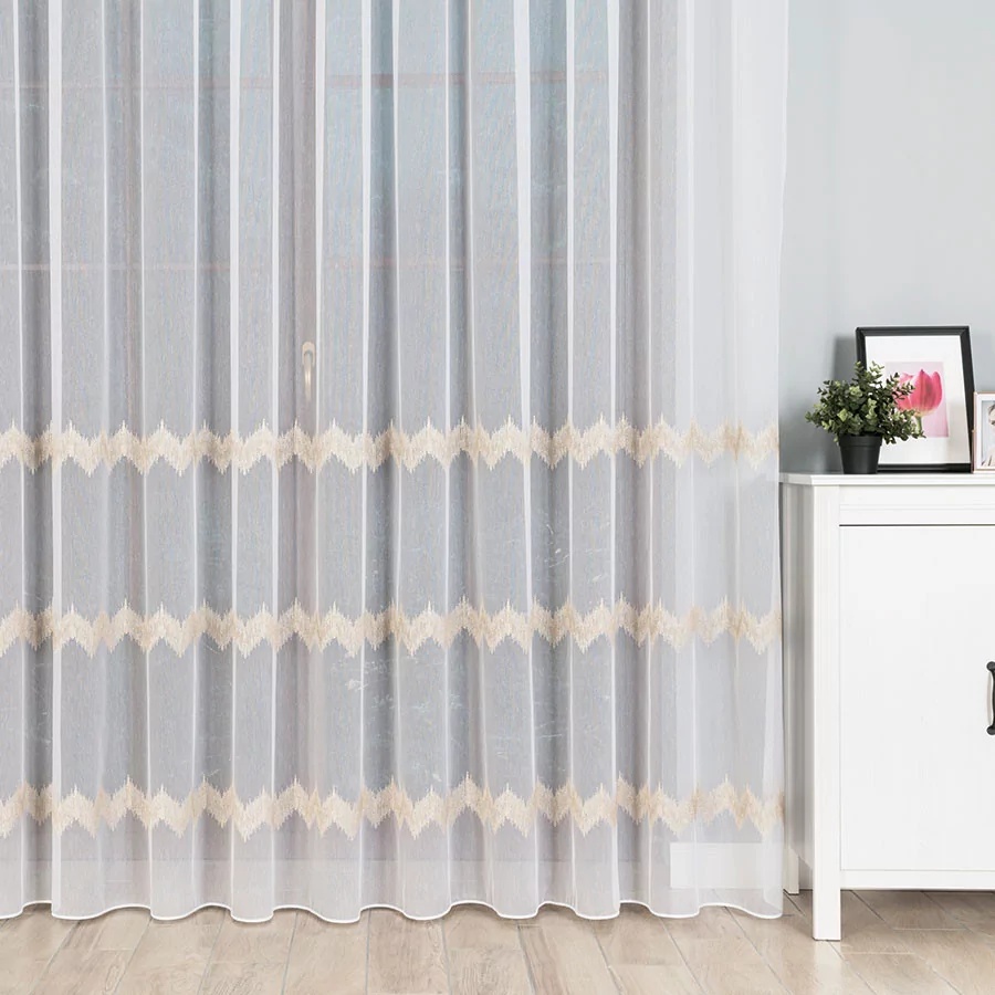 Niezwykle efektowna biała firanka, zdobiona przepięknym haftem w kolorze błyszczącym białym, szarym ze srebrnym, lub złotym. Dostępna w metrażu. Firankę możesz zamówić z usługą szycia w naszej profesjonalnej szwalni - wybierz taśmę lub przelotki, podaj wymiary, a otrzymasz uszytą i gotową do zawieszenia firankę. Firanki haftowane, w zależności od wzoru, będą doskonałą dekoracją okna w każdym pomieszczeniu. Haft kojarzy się zwykle z luksusem i elegancją, ale różnorodne formy haftu będą doskonale komponować się w modernistycznych wnętrzach. Siateczka, na której wyhaftowany jest wzór tej firanki doskonale przepuszcza powietrze i wpuszcza do pomieszczenia dużo promieni słonecznych. Firanka doskonale się układa i z pewnością będzie idealną ozdobą Twojego okna.