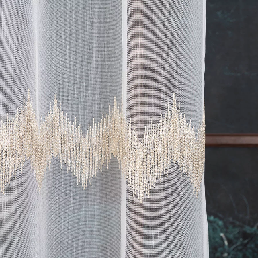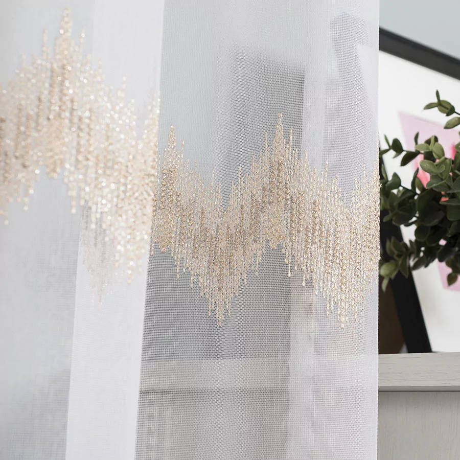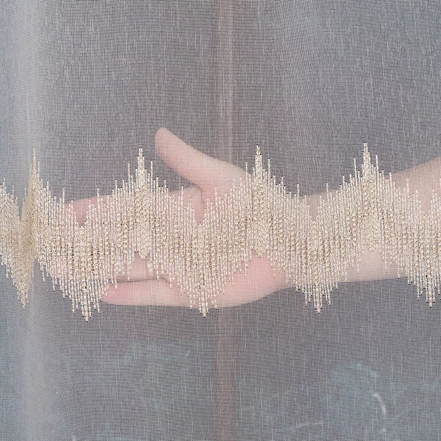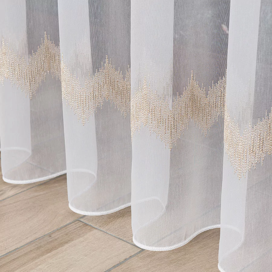 Niezwykle efektowna biała firanka, zdobiona przepięknym haftem w kolorze błyszczącym białym, szarym ze srebrnym, lub złotym. Dostępna w metrażu. Firankę możesz zamówić z usługą szycia w naszej profesjonalnej szwalni - wybierz taśmę lub przelotki, podaj wymiary, a otrzymasz uszytą i gotową do zawieszenia firankę.