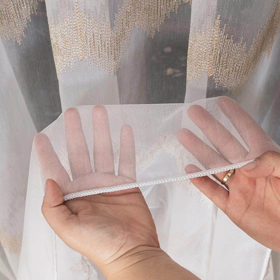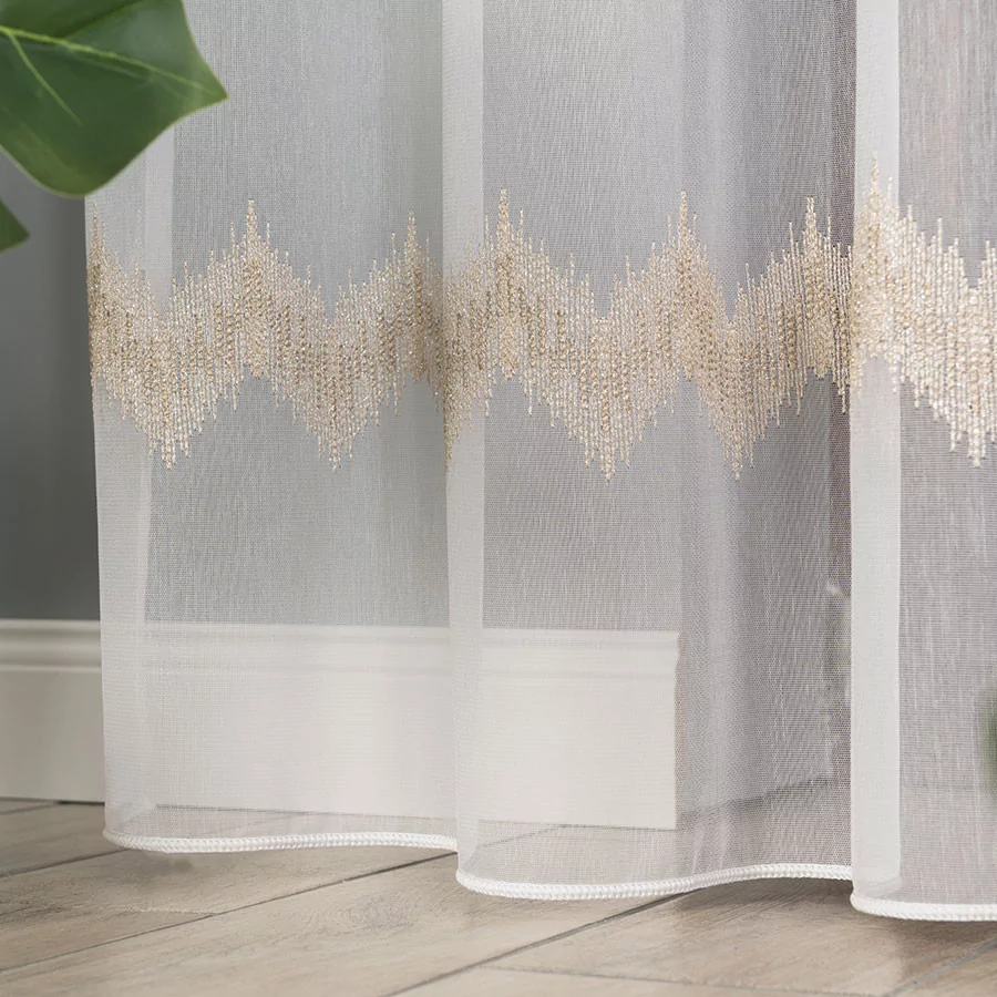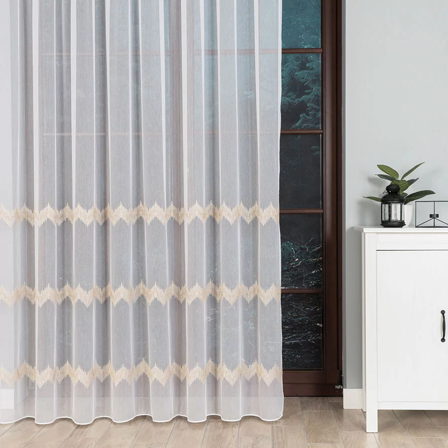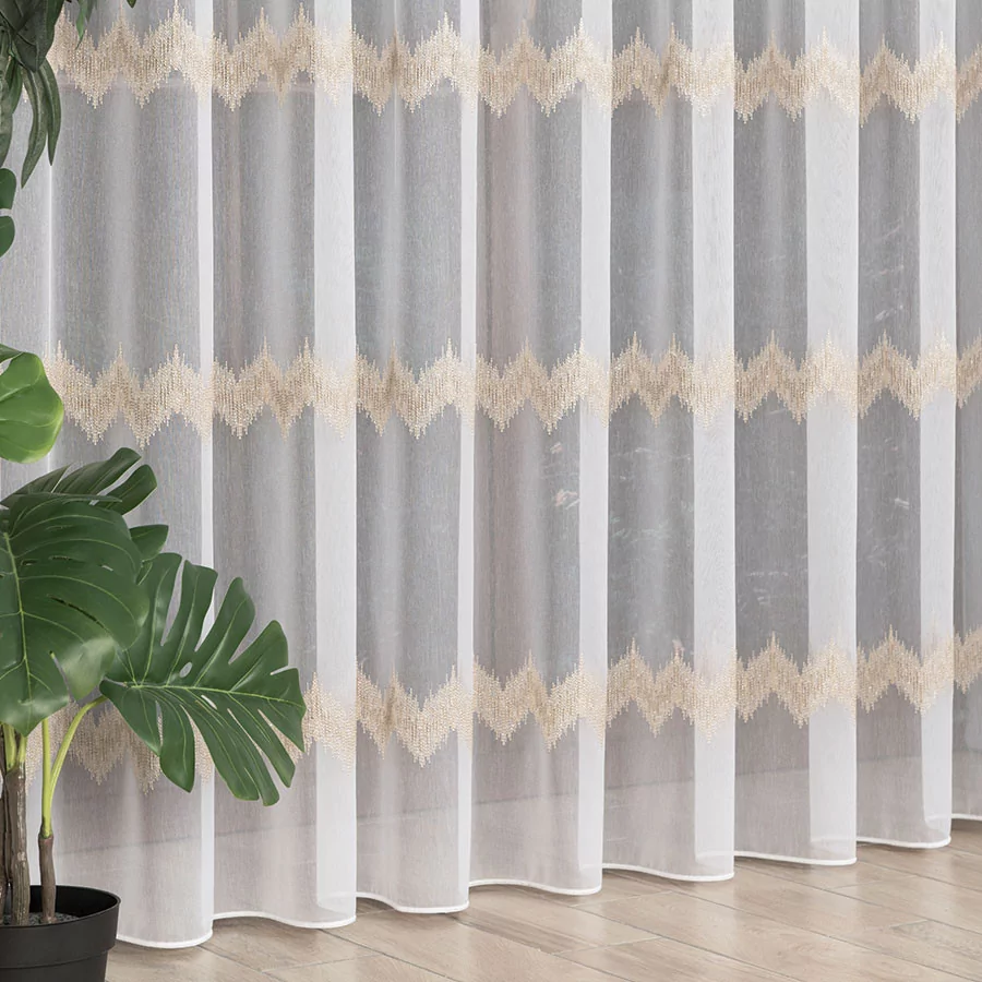 Firankę możemy skrócić i uszyć na dowolną szerokość, dzięki czemu bez problemu dopasujemy ją do Twoich potrzeb i różnych wymiarów okien. Możesz wybrać taśmę lub przelotki i zamówić obszytą, gotową do zawieszenia firankę.