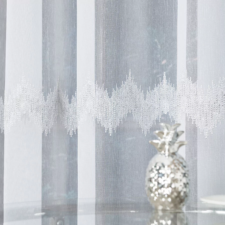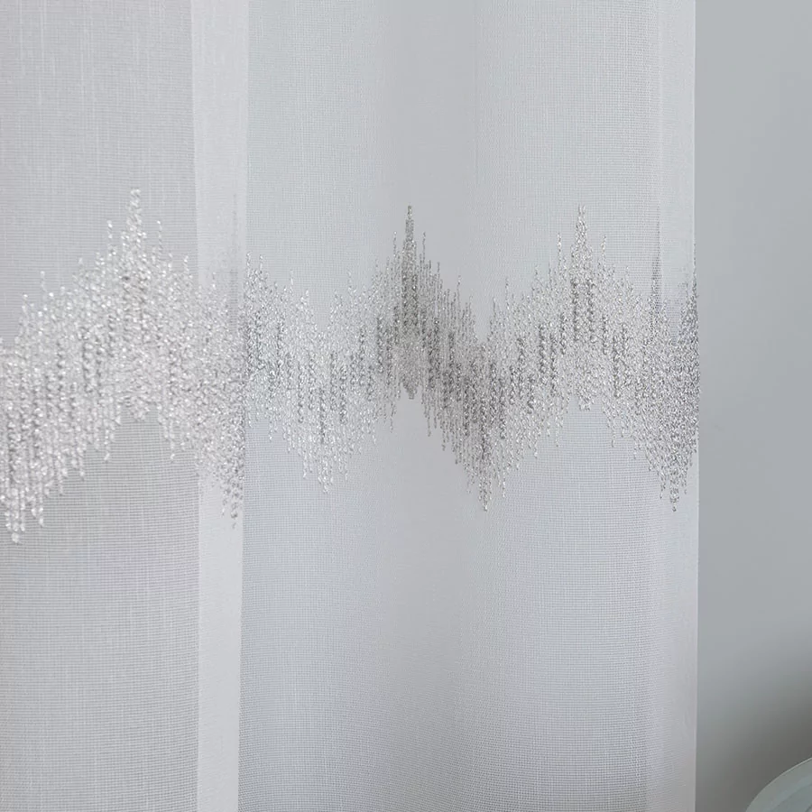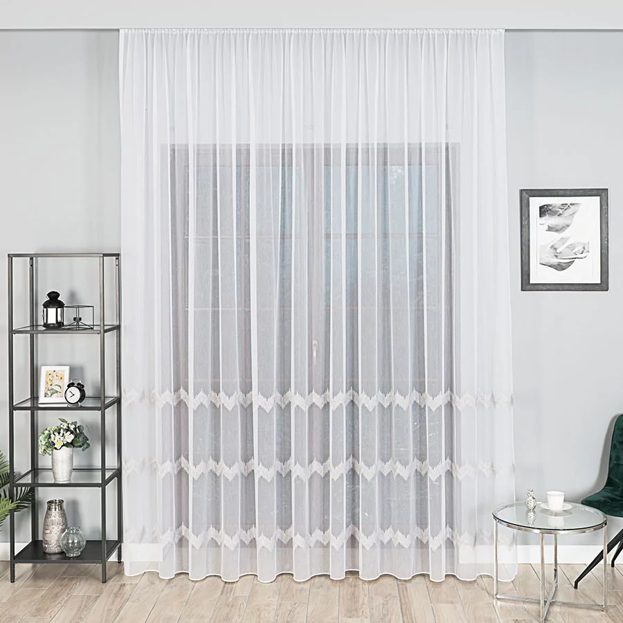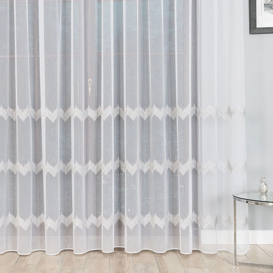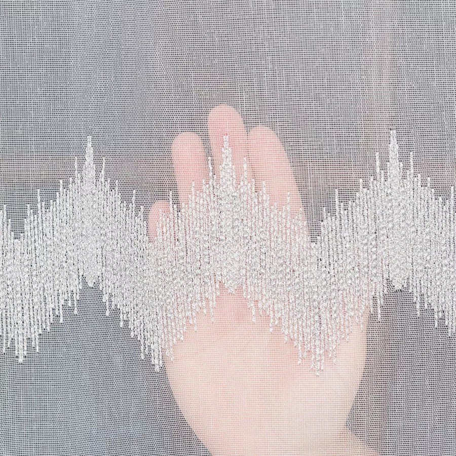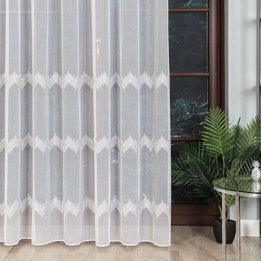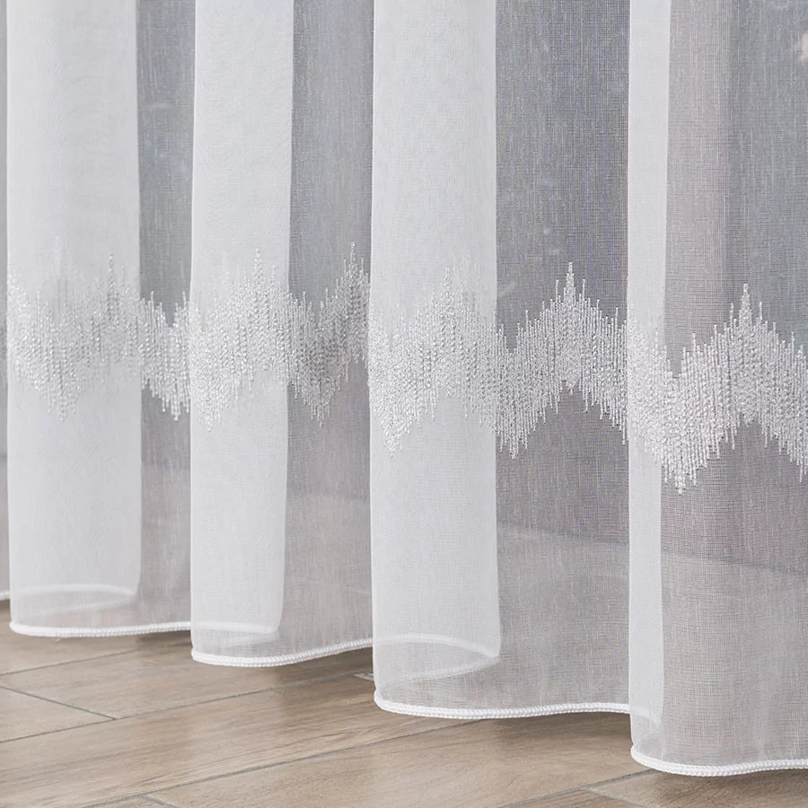 Niezwykle efektowna biała firanka, zdobiona przepięknym haftem w kolorze błyszczącym białym, szarym ze srebrnym, lub złotym. Dostępna w metrażu. Firankę możesz zamówić z usługą szycia w naszej profesjonalnej szwalni - wybierz taśmę lub przelotki, podaj wymiary, a otrzymasz uszytą i gotową do zawieszenia firankę. Firanki haftowane, w zależności od wzoru, będą doskonałą dekoracją okna w każdym pomieszczeniu. Haft kojarzy się zwykle z luksusem i elegancją, ale różnorodne formy haftu będą doskonale komponować się w modernistycznych wnętrzach. Siateczka, na której wyhaftowany jest wzór tej firanki doskonale przepuszcza powietrze i wpuszcza do pomieszczenia dużo promieni słonecznych. Firanka doskonale się układa i z pewnością będzie idealną ozdobą Twojego okna.