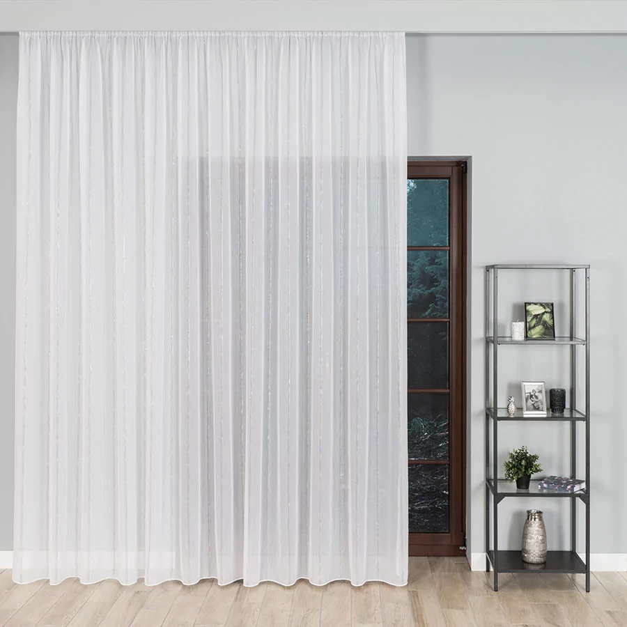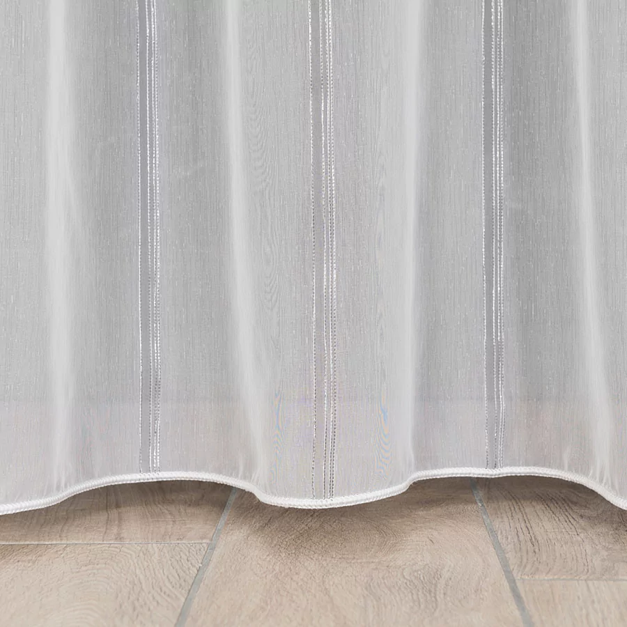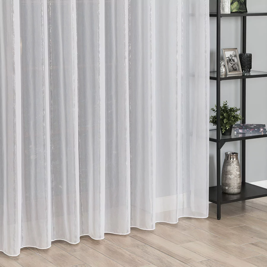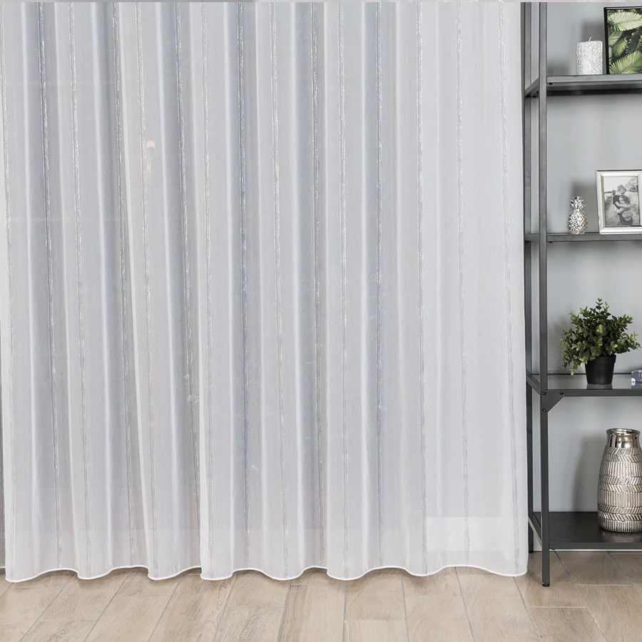 Firanka metrażowa, wykonana na delikatnej, białej dzianinie fantazyjnej. Lekki i pięknie układający się materiał, zdobiony białymi, szarymi, beżowymi lub czarnymi pasami z dodatkiem srebrnej nitki, idealnie wpasuje się zarówno w nowoczesne, jak i klasyczne wnętrze.