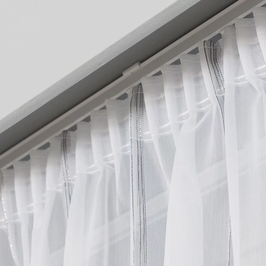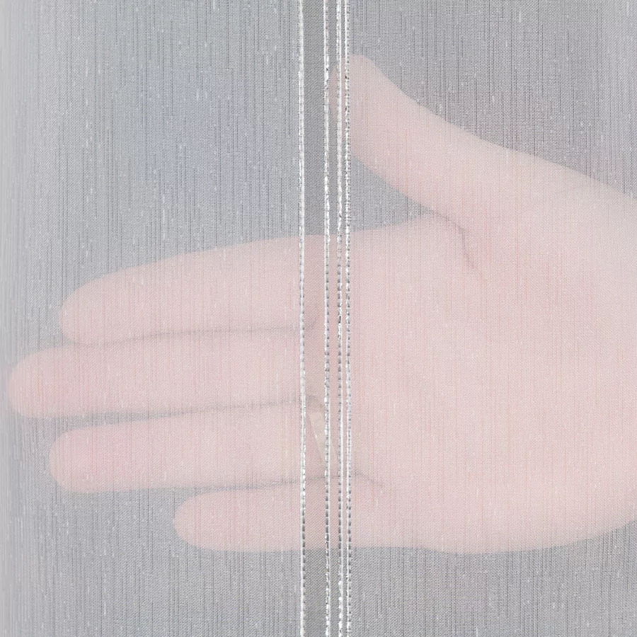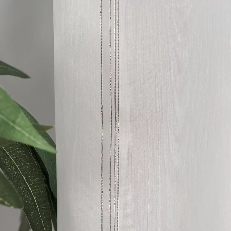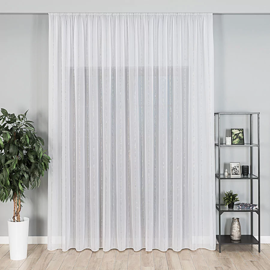 Firanka metrażowa, wykonana na delikatnej, białej dzianinie fantazyjnej. Lekki i pięknie układający się materiał, zdobiony białymi, szarymi, beżowymi lub czarnymi pasami z dodatkiem srebrnej nitki, idealnie wpasuje się zarówno w nowoczesne, jak i klasyczne wnętrze.
