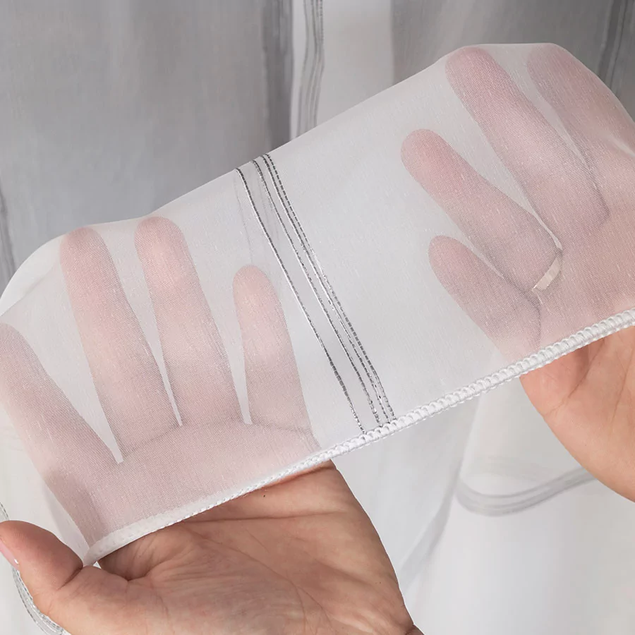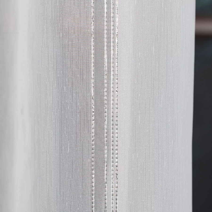 Firanka metrażowa, wykonana na delikatnej, białej dzianinie fantazyjnej. Lekki i pięknie układający się materiał, zdobiony białymi, szarymi, beżowymi lub czarnymi pasami z dodatkiem srebrnej nitki, idealnie wpasuje się zarówno w nowoczesne, jak i klasyczne wnętrze. Materiał ten jest łatwy w użytkowaniu a jego zagęszczony splot świetnie uchroni przed słońcem i wiatrem jednocześnie nie tracąc na swej niezwykłej lekkości i zwiewności. Tak prosty i minimalistyczny wzór doda subtelności i przytulności wnętrzom.