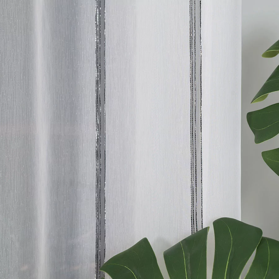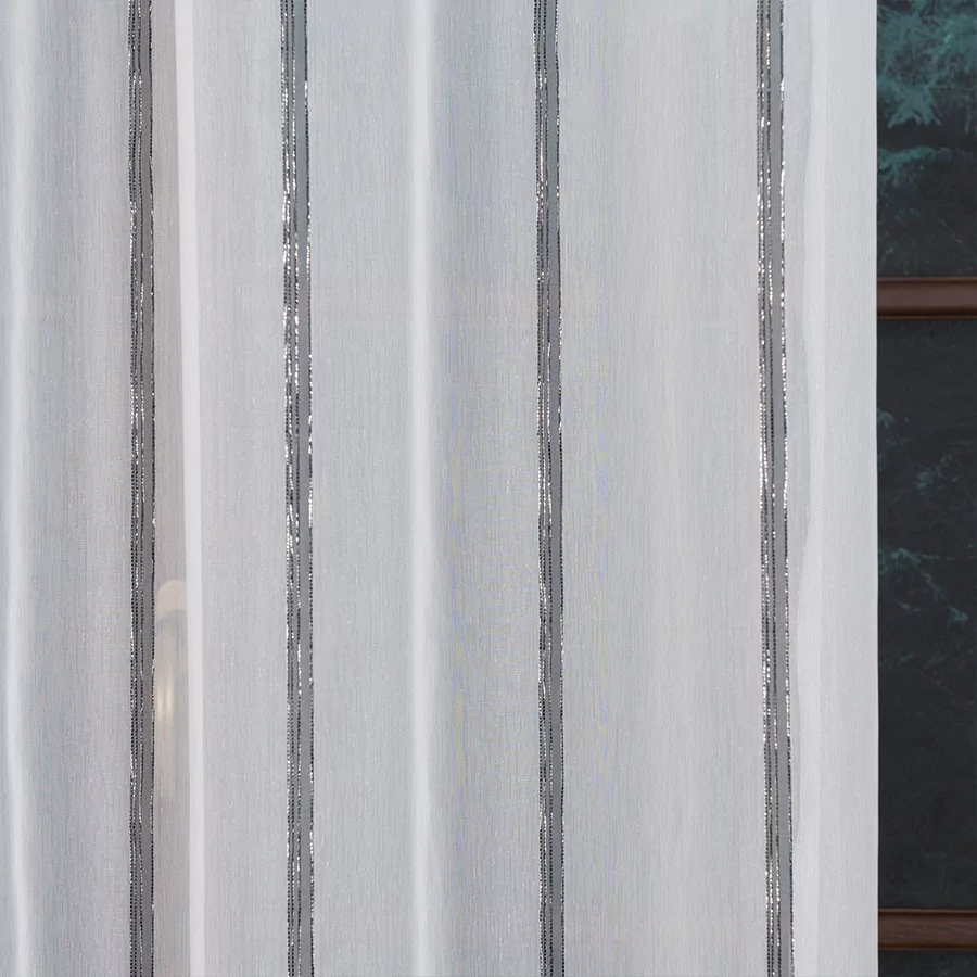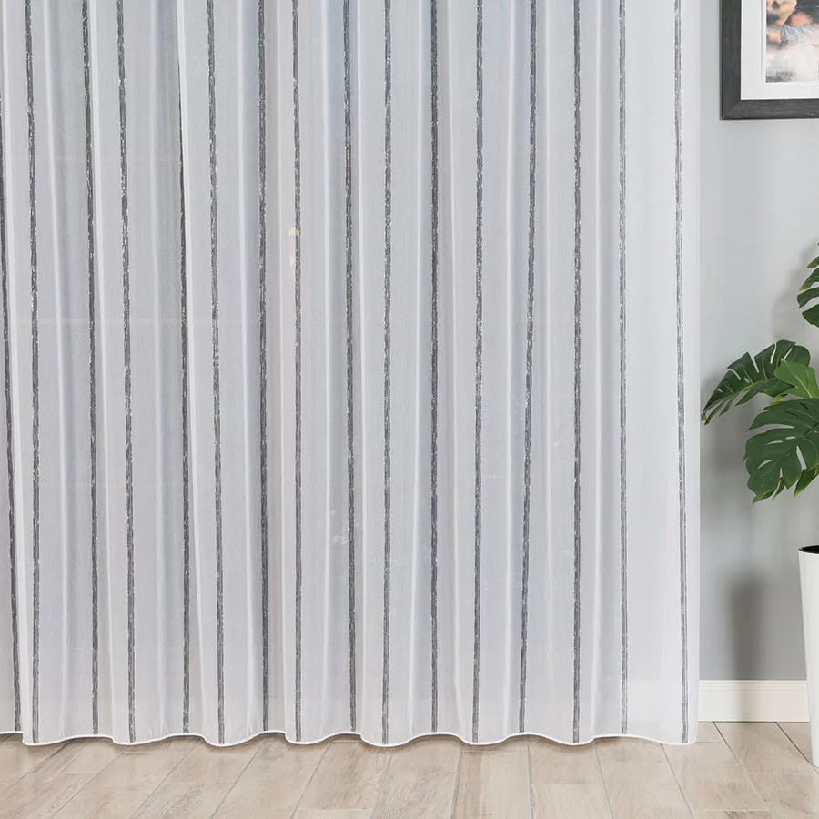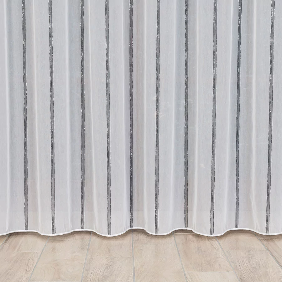 Firanka metrażowa, wykonana na delikatnej, białej dzianinie fantazyjnej. Lekki i pięknie układający się materiał, zdobiony białymi, szarymi, beżowymi lub czarnymi pasami z dodatkiem srebrnej nitki, idealnie wpasuje się zarówno w nowoczesne, jak i klasyczne wnętrze. Materiał ten jest łatwy w użytkowaniu a jego zagęszczony splot świetnie uchroni przed słońcem i wiatrem jednocześnie nie tracąc na swej niezwykłej lekkości i zwiewności. Tak prosty i minimalistyczny wzór doda subtelności i przytulności wnętrzom.