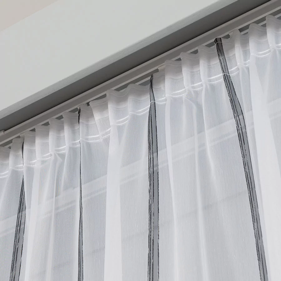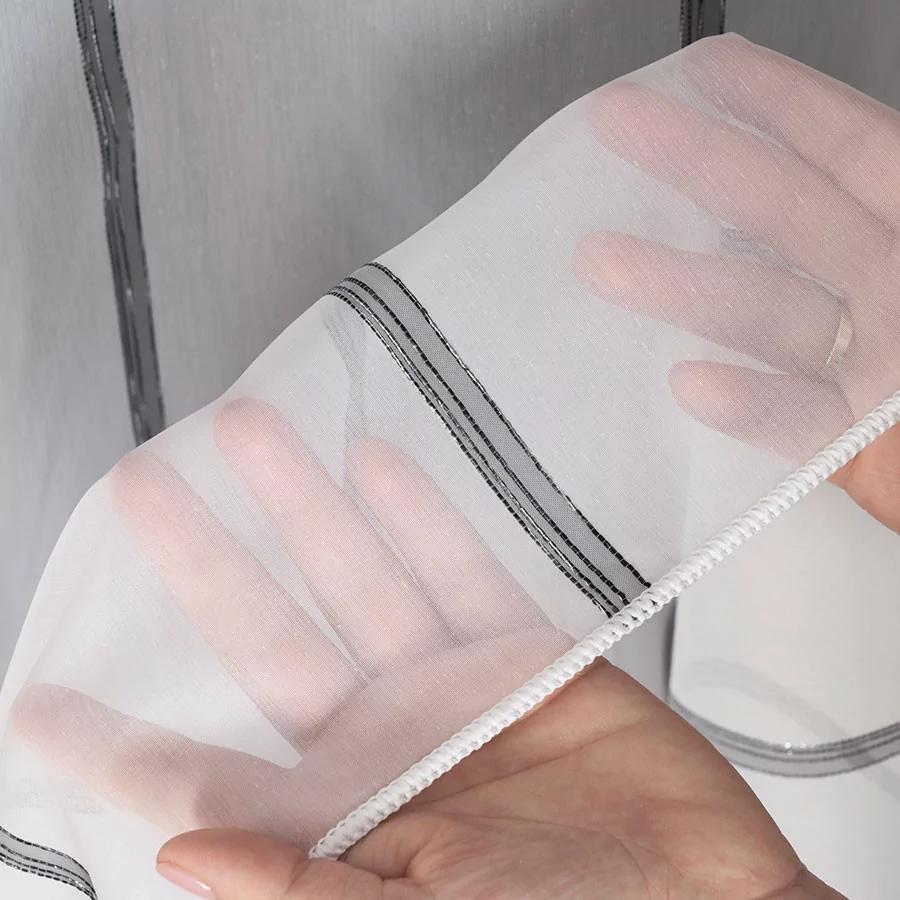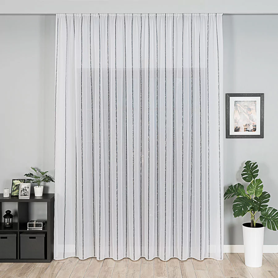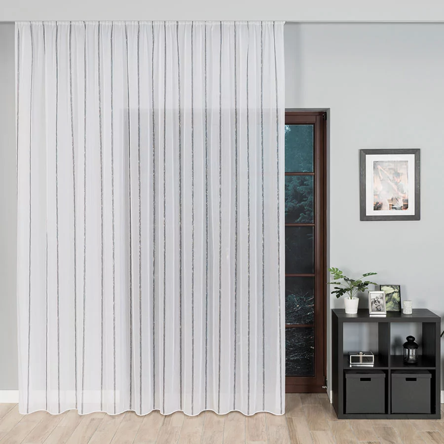 Firanka metrażowa, wykonana na delikatnej, białej dzianinie fantazyjnej. Lekki i pięknie układający się materiał, zdobiony białymi, szarymi, beżowymi lub czarnymi pasami z dodatkiem srebrnej nitki, idealnie wpasuje się zarówno w nowoczesne, jak i klasyczne wnętrze. Materiał ten jest łatwy w użytkowaniu a jego zagęszczony splot świetnie uchroni przed słońcem i wiatrem jednocześnie nie tracąc na swej niezwykłej lekkości i zwiewności. Tak prosty i minimalistyczny wzór doda subtelności i przytulności wnętrzom.