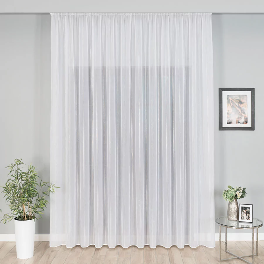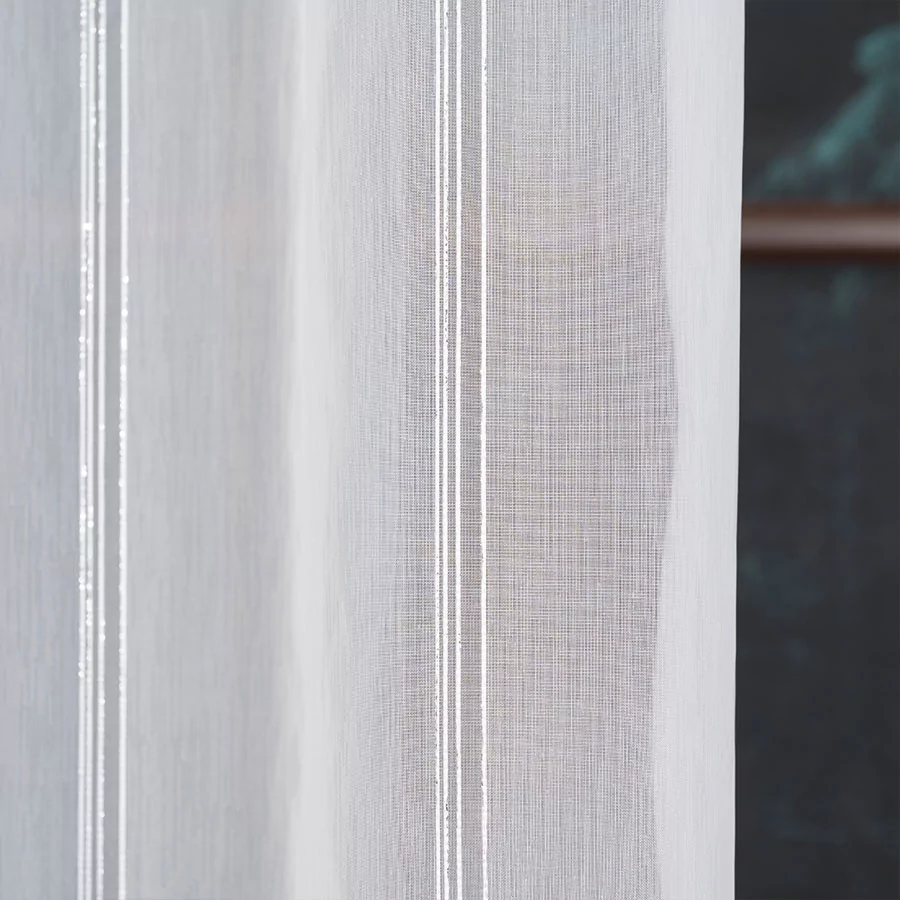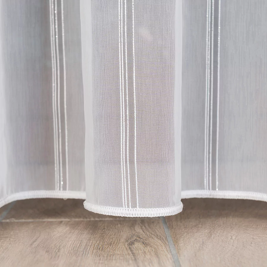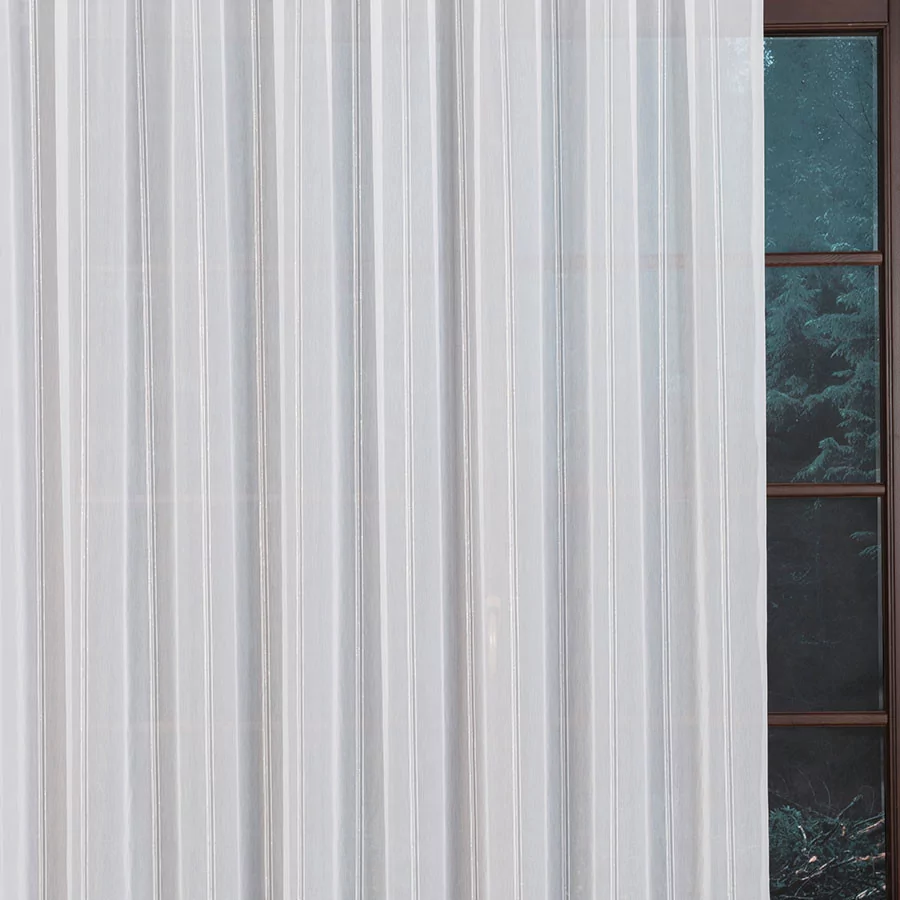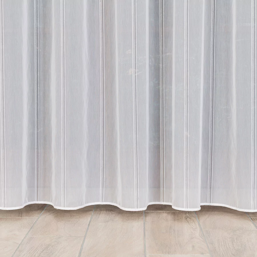 Firanka metrażowa, wykonana na delikatnej, białej dzianinie fantazyjnej. Lekki i pięknie układający się materiał, zdobiony białymi, szarymi, beżowymi lub czarnymi pasami z dodatkiem srebrnej nitki, idealnie wpasuje się zarówno w nowoczesne, jak i klasyczne wnętrze. Materiał ten jest łatwy w użytkowaniu a jego zagęszczony splot świetnie uchroni przed słońcem i wiatrem jednocześnie nie tracąc na swej niezwykłej lekkości i zwiewności. Tak prosty i minimalistyczny wzór doda subtelności i przytulności wnętrzom.