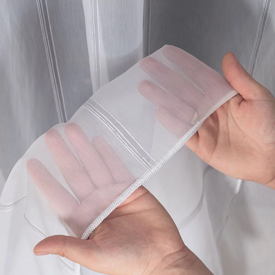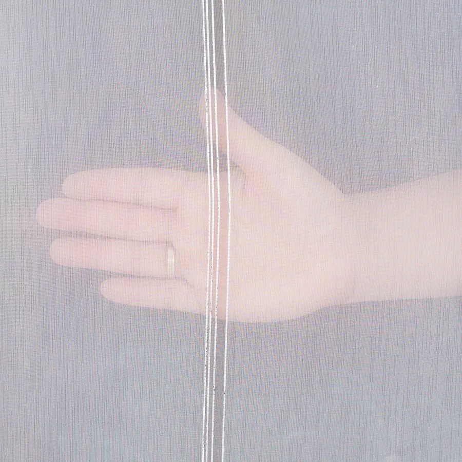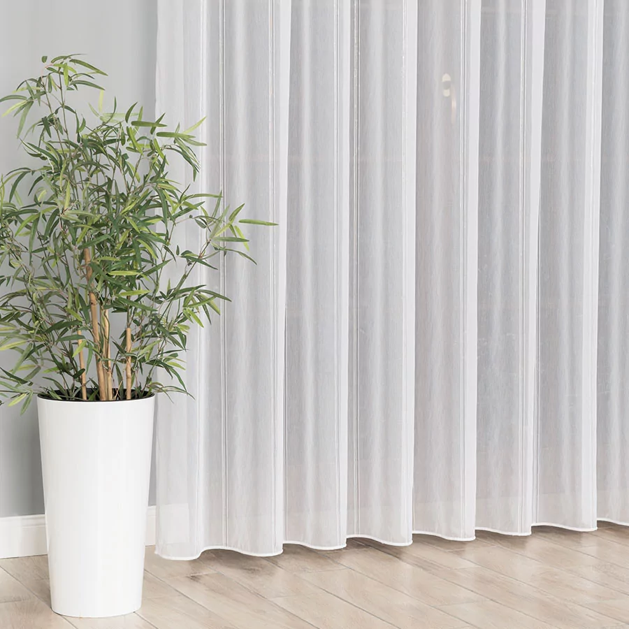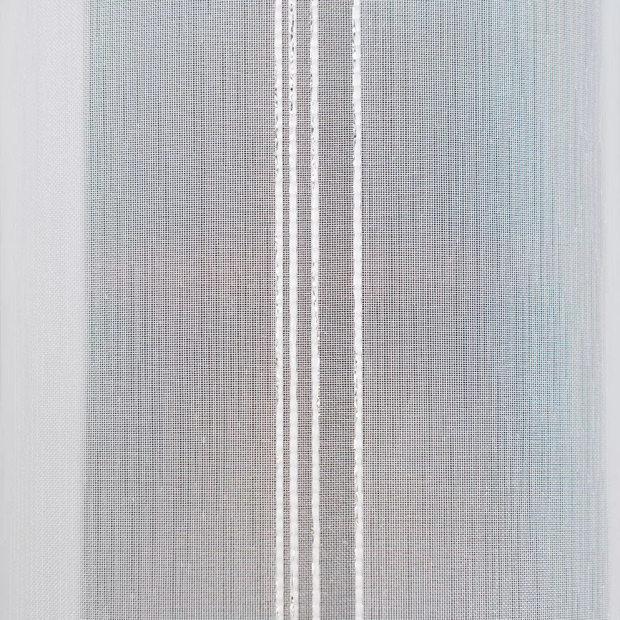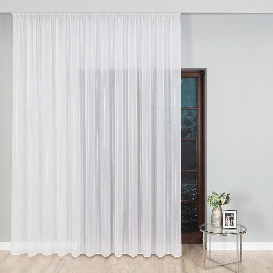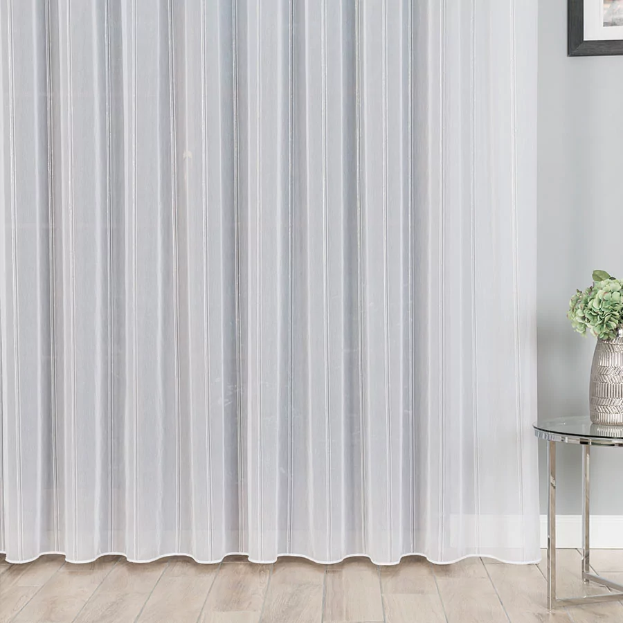 Firanka metrażowa, wykonana na delikatnej, białej dzianinie fantazyjnej. Lekki i pięknie układający się materiał, zdobiony białymi, szarymi, beżowymi lub czarnymi pasami z dodatkiem srebrnej nitki, idealnie wpasuje się zarówno w nowoczesne, jak i klasyczne wnętrze. Materiał ten jest łatwy w użytkowaniu a jego zagęszczony splot świetnie uchroni przed słońcem i wiatrem jednocześnie nie tracąc na swej niezwykłej lekkości i zwiewności. Tak prosty i minimalistyczny wzór doda subtelności i przytulności wnętrzom.