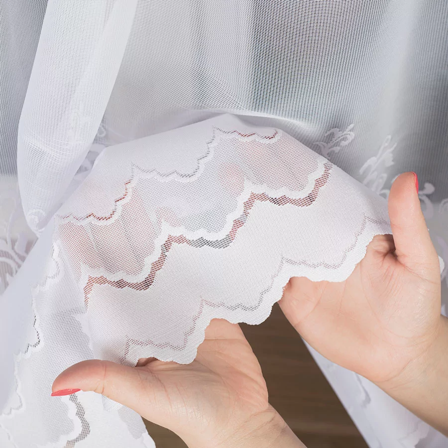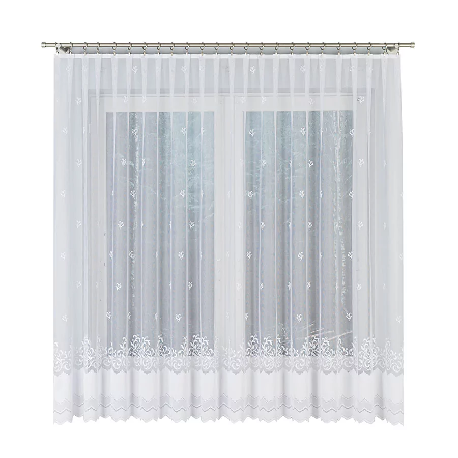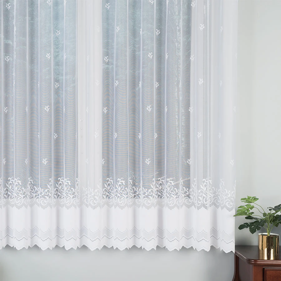 Firanka żakardowa dostępna w metrażu, w kolorze białym z pięknym ornamentem w dolnej części firany i delikatnymi elementami rzuconymi w górnej części firany. Kilka wysokości do wyboru, szerokość dowolna, dzięki czemu dopasujesz ją dokładnie do swojego okna. Firankę możesz zamówić z usługą szycia w naszej profesjonalnej szwalni - wybierz wykończenie, podaj wymiary, a otrzymasz uszytą i gotową do zawieszenia firankę. Wzór wykonany z najwyższej jakość przędzy żakardowej idealnie wkomponuje się w aranżację wnętrz nowoczesnych jak i tych urządzonych w klasycznym stylu. Firanka pięknie się układa, nie wymaga prasowania i można go prać w pralce w niskiej temperaturze. Cechuje ją dobra przepuszczalność powietrza i promieni słonecznych. Firankę możesz zamówić z usługą szycia w naszej profesjonalnej szwalni - wybierz wykończenie, podaj wymiary, a otrzymasz uszytą i gotową do zawieszenia firankę.