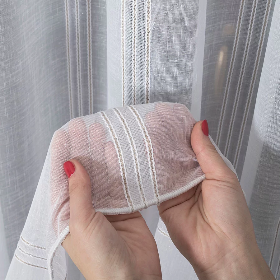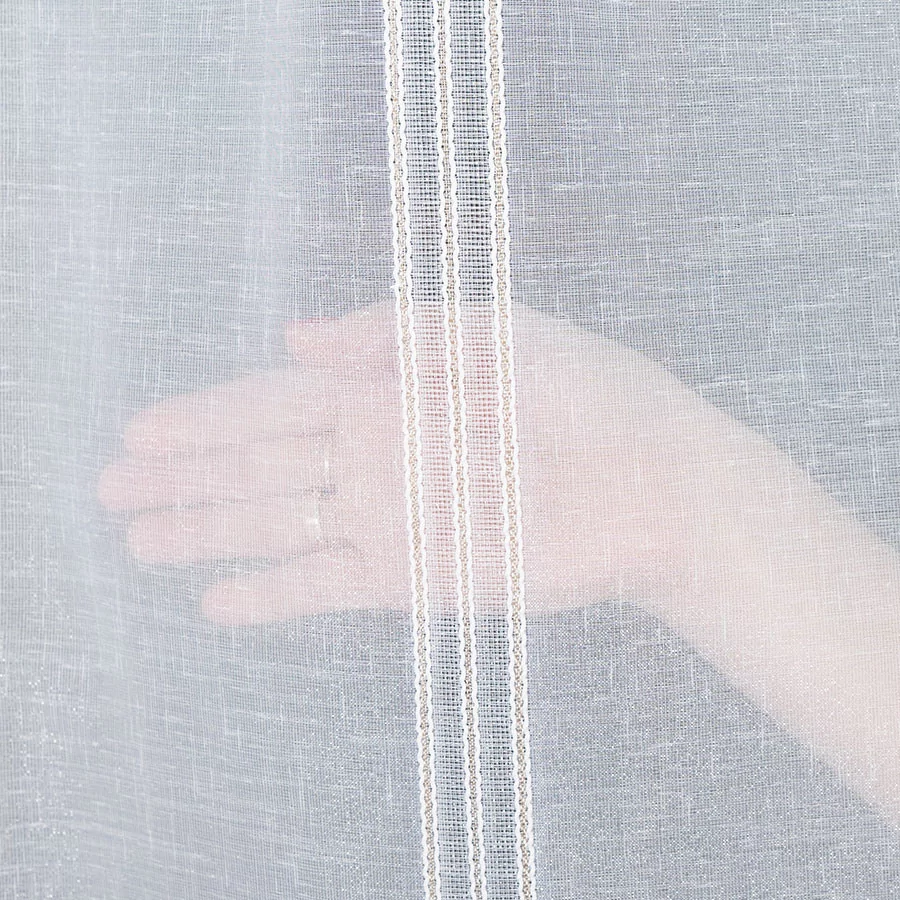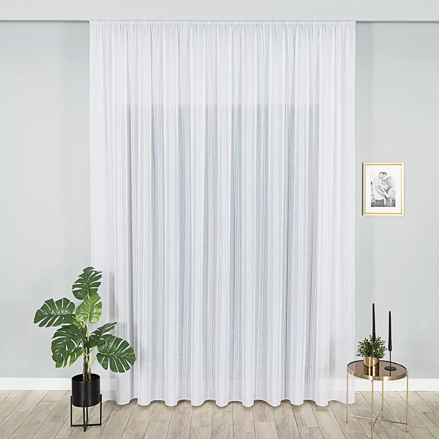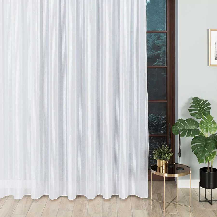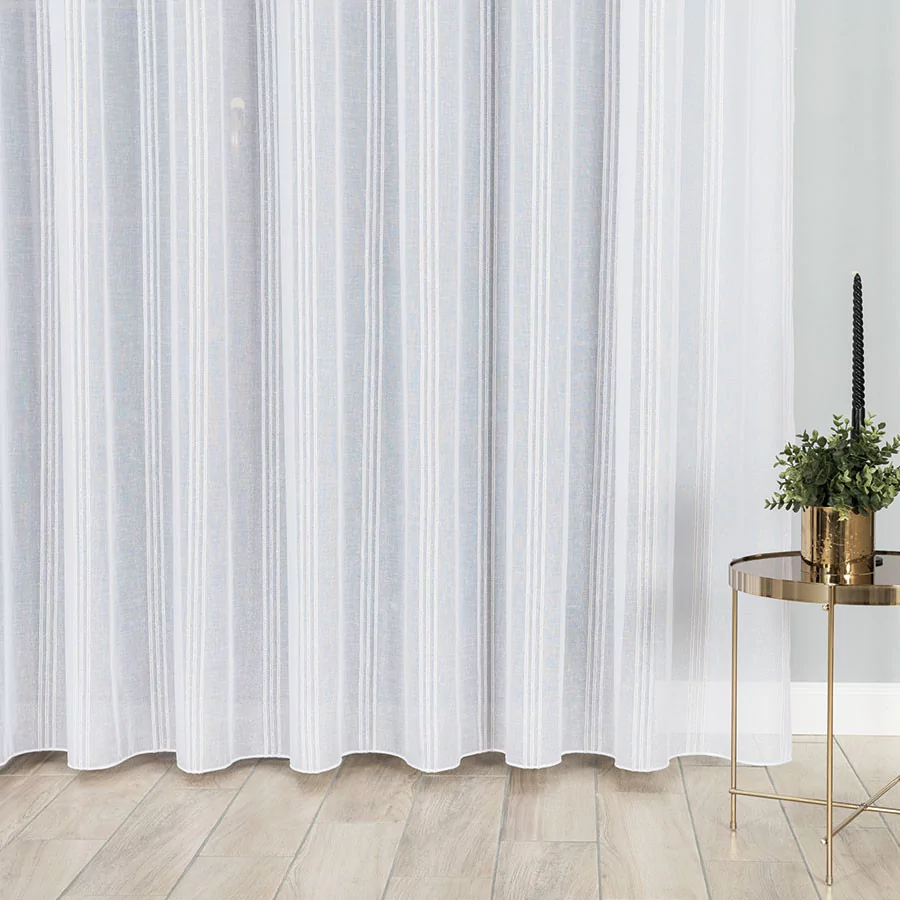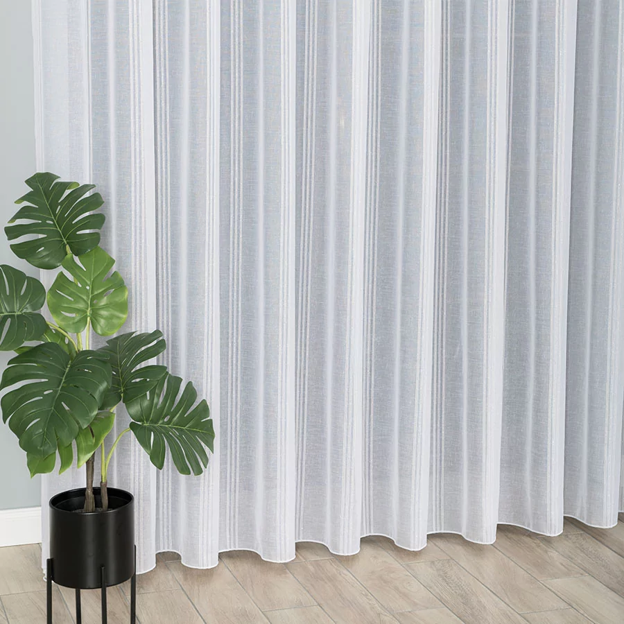 Pięknie układająca się firanka metrażowa zdobiona pionowymi pasami w różnych kolorach do wyboru. Umiarkowanie przepuszcza powietrze i promienie słoneczne.  Idealna propozycja na zwieńczenie procesów aranżacyjnych w pokojach dziennych i salonach. Zagęszczony splot fantazyjnej dzianiny ozdobiony jest pionowymi pasami. Tak prosty i minimalistyczny wzór doda subtelności i przytulności wnętrzom. Firankę możesz zamówić z usługą szycia w naszej profesjonalnej szwalni - wybierz wykończenie, podaj wymiary, a otrzymasz uszytą i gotową do zawieszenia firankę.