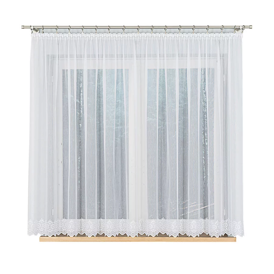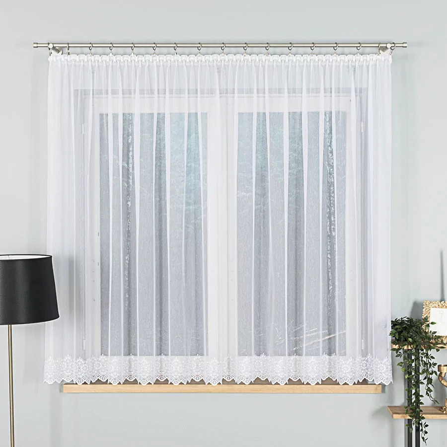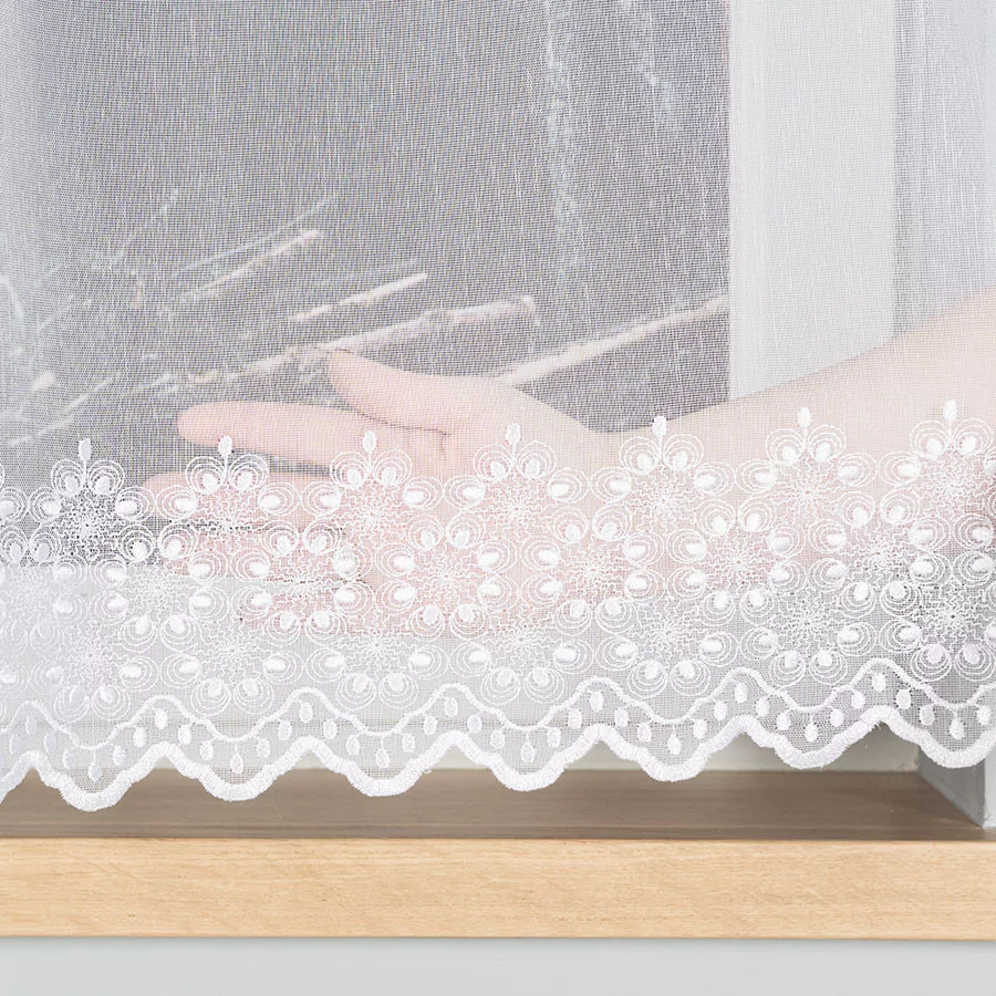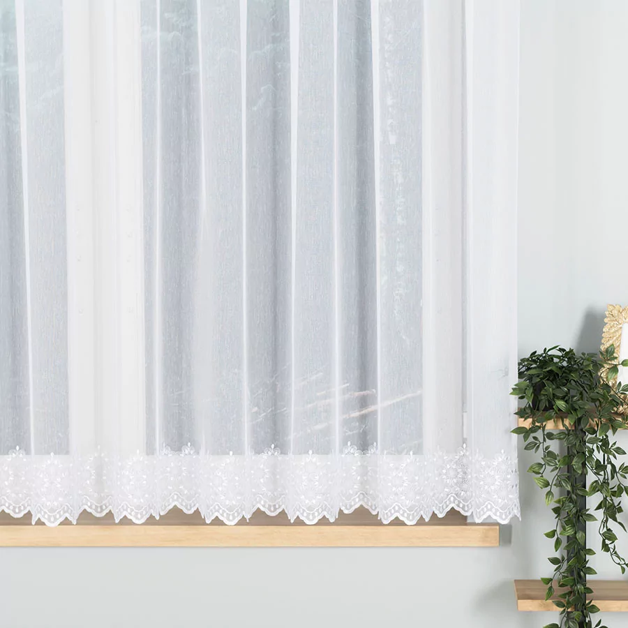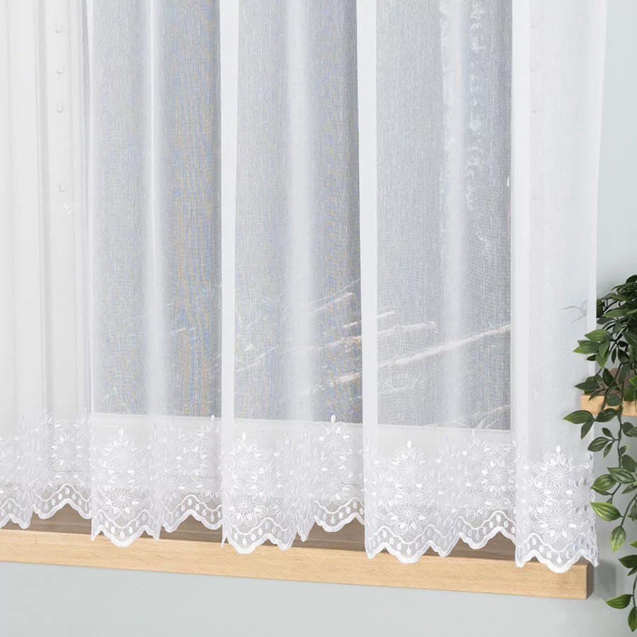 Firanka haftowana, dostępna w metrażu w kolorze białym. Firankę możesz zamówić z usługą szycia w naszej profesjonalnej szwalni - wybierz taśmę lub przelotki, podaj wymiary, a otrzymasz uszytą i gotową do zawieszenia firankę.