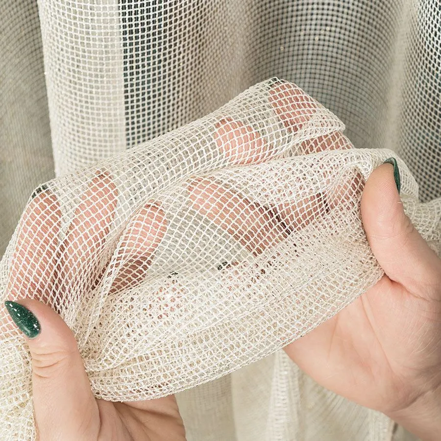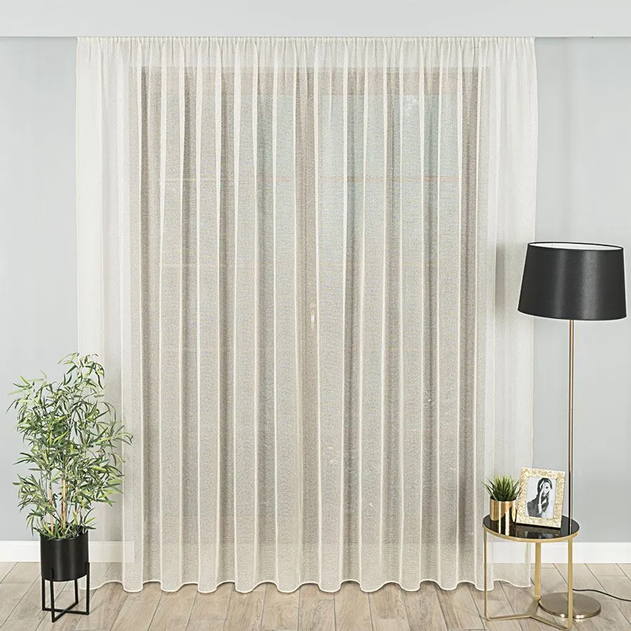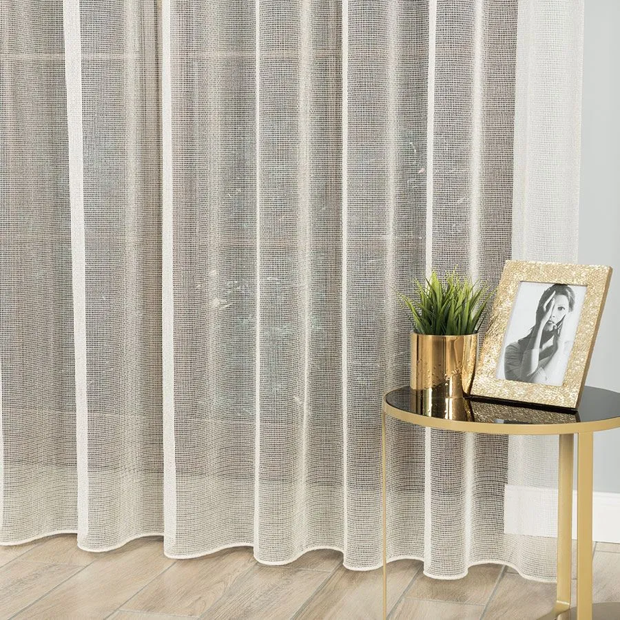 Gładka firanka metrażowa. Dostępna w kolorze białym ze srebrną nitką lub w kremowym ze złotą nitką. Najwyższa jakość przędzy fantazyjnej idealnie wkomponuje się w aranżację wnętrz nowoczesnych jak i tych urządzonych w klasycznym stylu. Firanka pięknie się układa. Cechuje ją dobra przepuszczalność powietrza i promieni słonecznych.