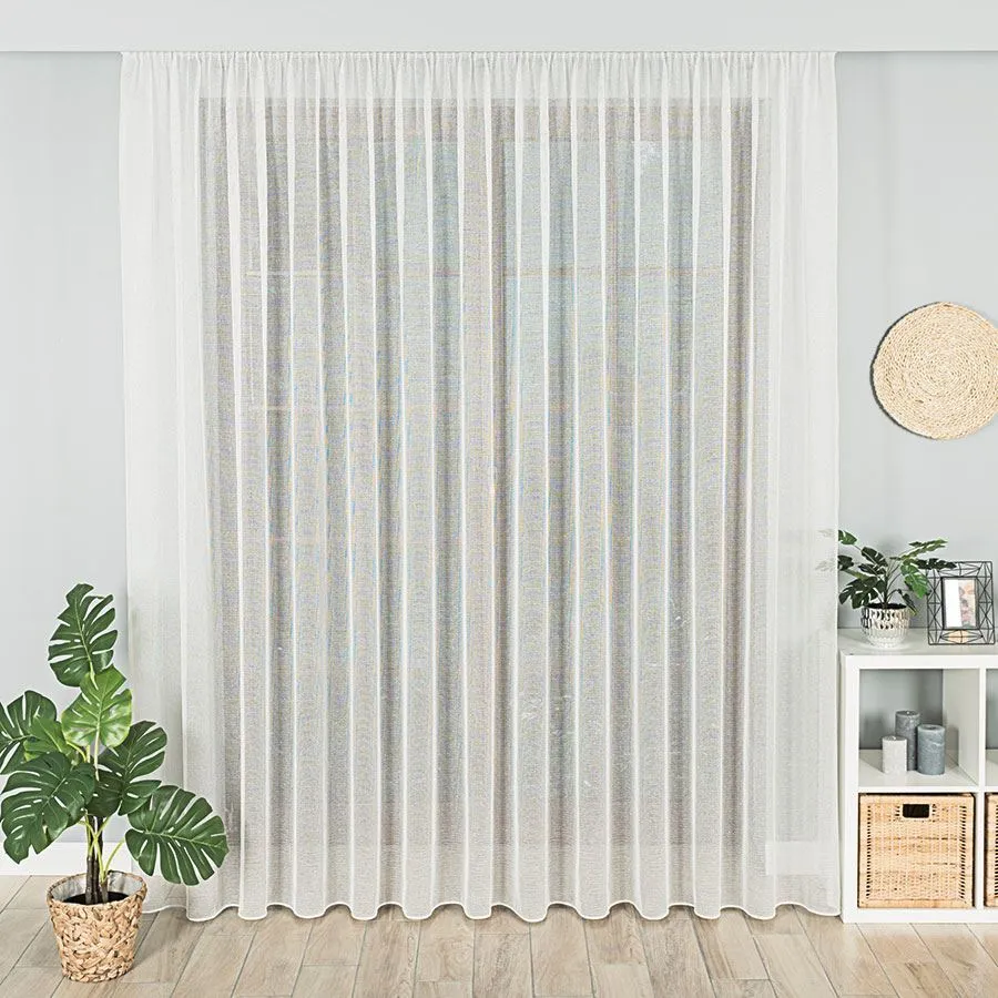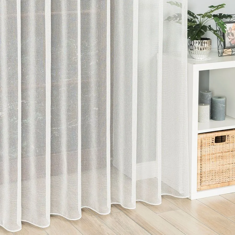 Gładka firanka metrażowa. Dostępna w kolorze białym ze srebrną nitką lub w kremowym ze złotą nitką. Najwyższa jakość przędzy fantazyjnej idealnie wkomponuje się w aranżację wnętrz nowoczesnych jak i tych urządzonych w klasycznym stylu. Firanka pięknie się układa. Cechuje ją dobra przepuszczalność powietrza i promieni słonecznych.