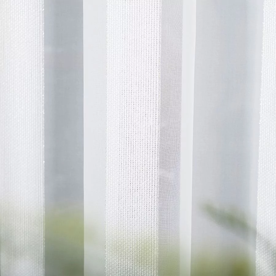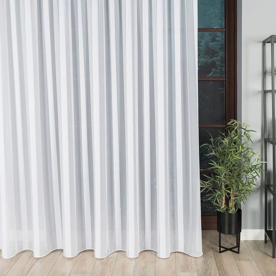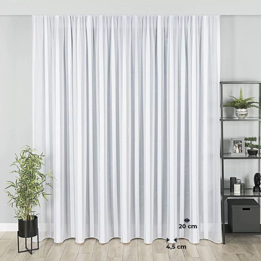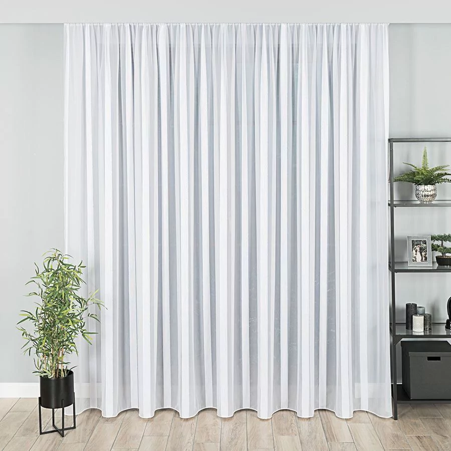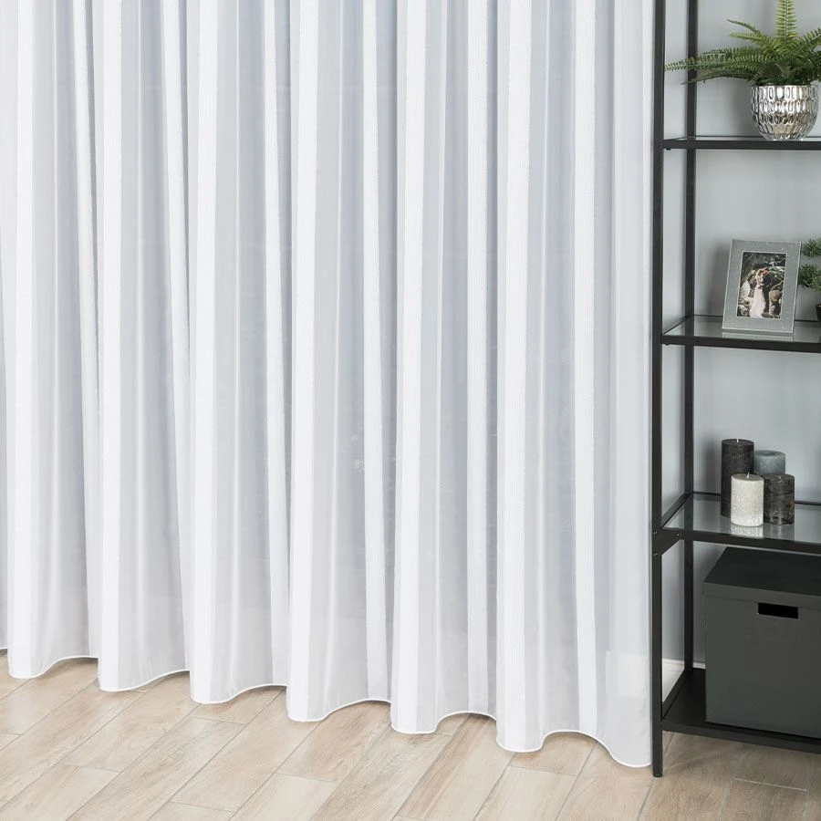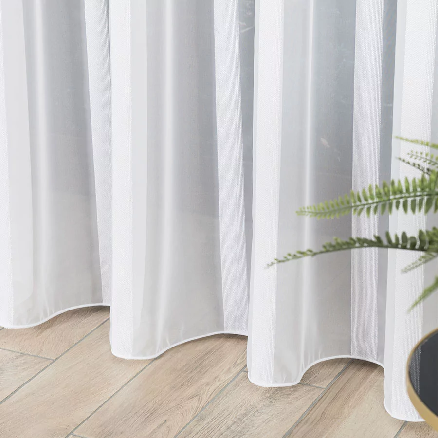 Pięknie układająca się firanka metrażowa zdobiona pionowymi pasami. Umiarkowanie przepuszcza powietrze i promienie słoneczne. Idealna propozycja na zwieńczenie procesów aranżacyjnych w pokojach dziennych i salonach. Zagęszczony splot lekkiej i lejącej dzianiny fantazyjnej ozdobiony jest pionowymi pasami. Tak prosty i minimalistyczny wzór doda subtelności i przytulności wnętrzom. Firankę możesz zamówić z usługą szycia w naszej profesjonalnej szwalni - wybierz wykończenie, podaj wymiary, a otrzymasz uszytą i gotową do zawieszenia firankę.