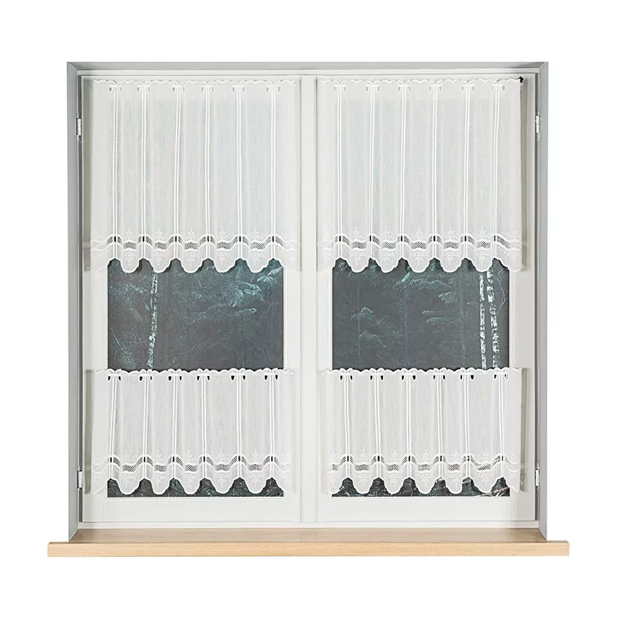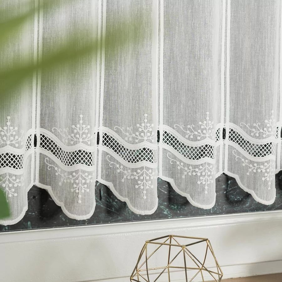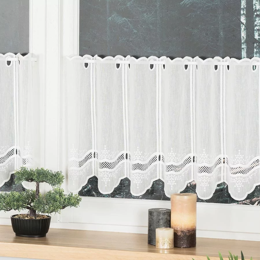 Zazdrostka panelowa z haftowaną aplikacją. Dostępna w metrażu w kolorze białym i naturalnym i w trzech wysokościach.