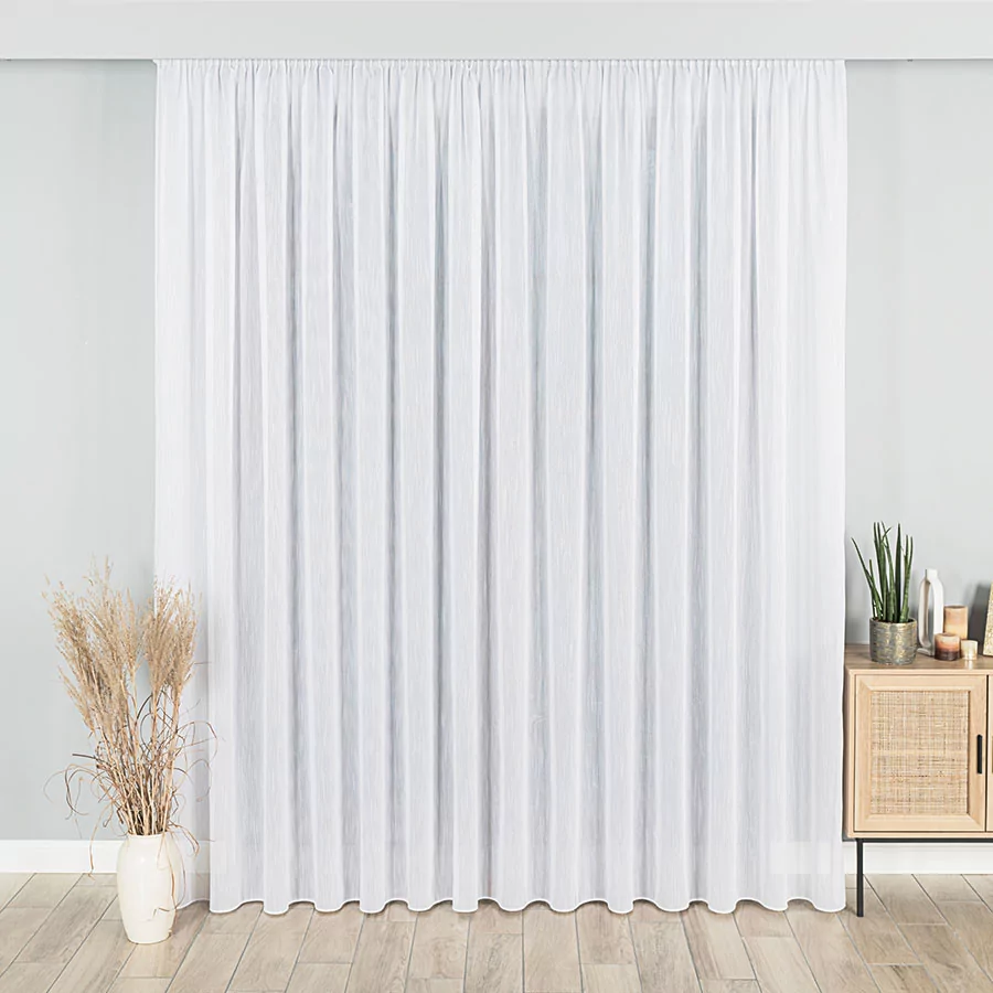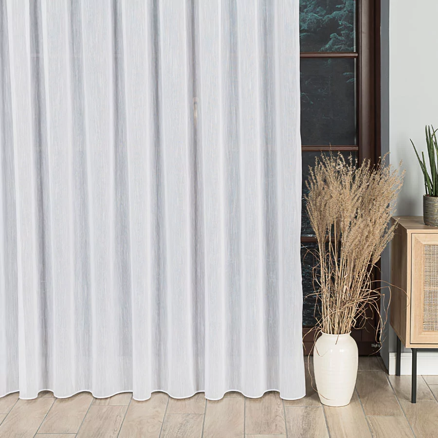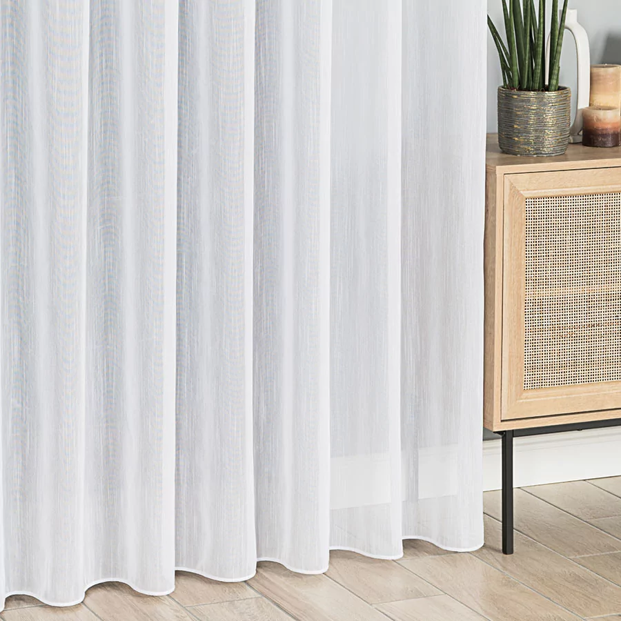 Pięknie układająca się firanka metrażowa z efektem deszczyku. Bardzo dobrze przepuszcza powietrze i promienie słoneczne. Idealna propozycja na zwieńczenie procesów aranżacyjnych w pokojach dziennych i salonach. Zagęszczony splot delikatnego, siateczkowego podkładu ozdobiony jest subtelnym efektem "deszczyku". Tak prosty i minimalistyczny wzór doda subtelności i przytulności wnętrzom. Firankę możesz zamówić z usługą szycia w naszej profesjonalnej szwalni - wybierz wykończenie, podaj wymiary, a otrzymasz uszytą i gotową do zawieszenia firankę.