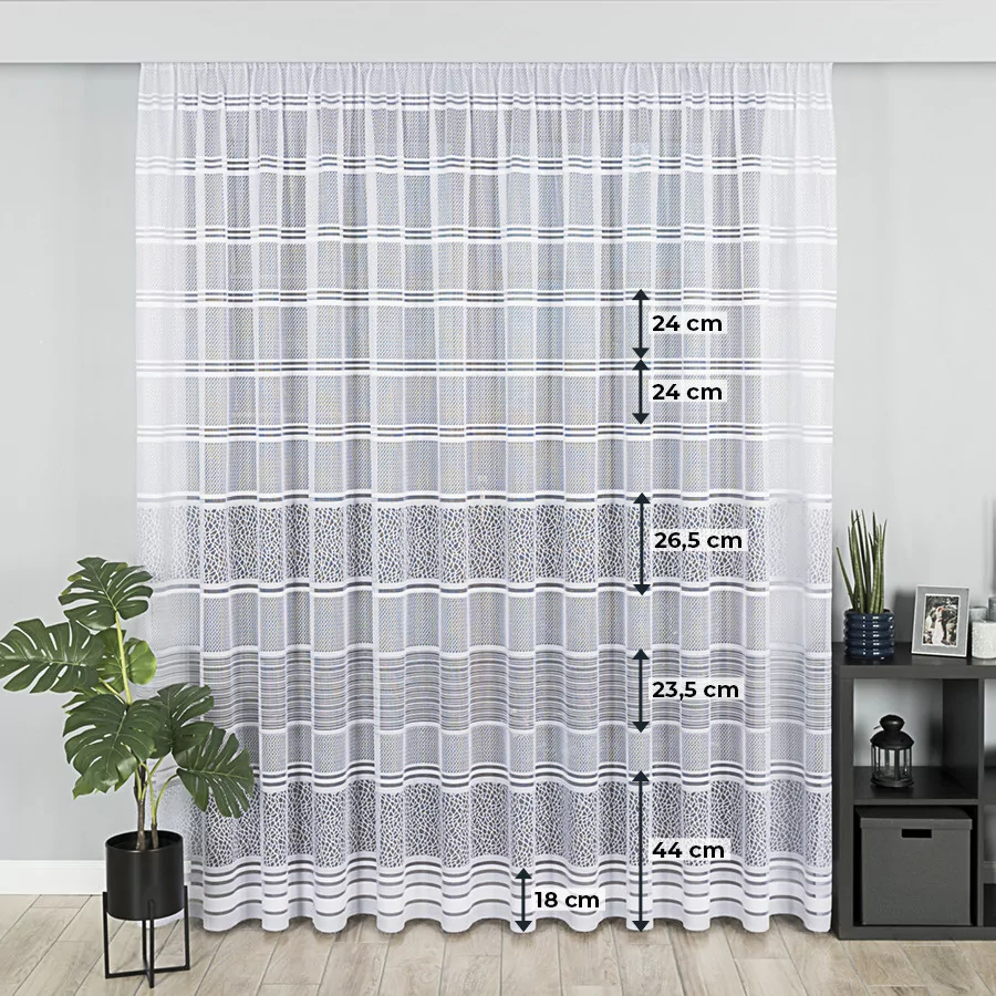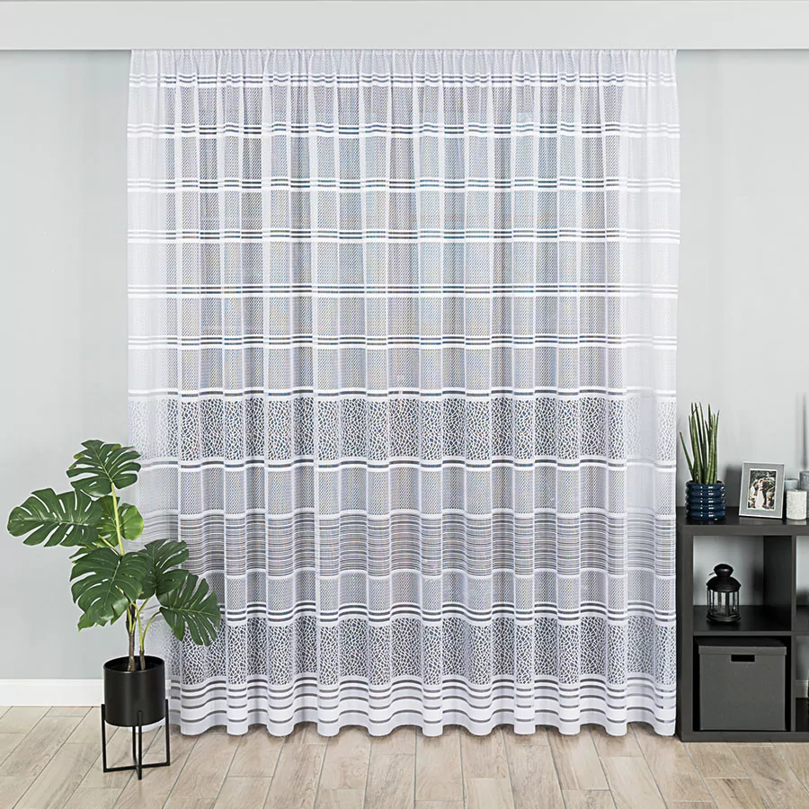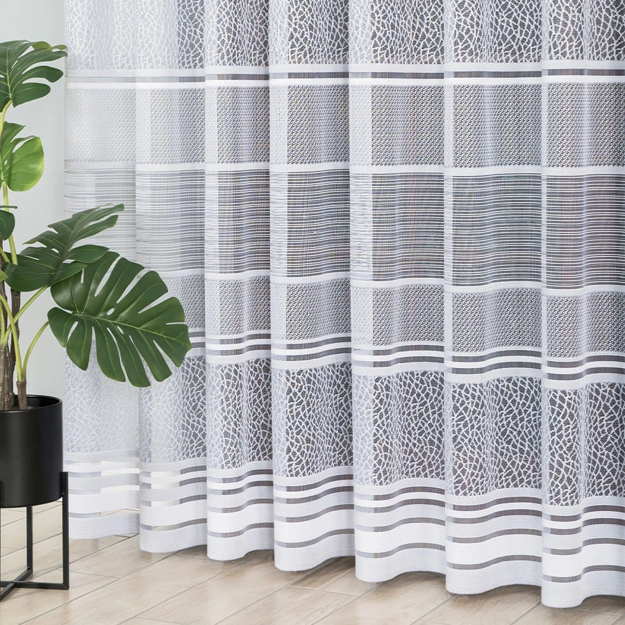 Firanka żakardowa metrażowa, dostępna w trzech wysokościach. Szerokość natomiast jest dowolna, dzięki czemu dopasujesz ją dokładnie do wymiarów swojego okna. Dostępna w dwóch wersjach kolorystycznych: biały ze starym złotem i biały z szarym. Wzór wykonany z najwyższej jakość przędzy żakardowej idealnie wkomponuje się w aranżację wnętrz nowoczesnych jak i tych urządzonych w klasycznym stylu. Firanka pięknie się układa, nie wymaga prasowania i można go prać w pralce w niskiej temperaturze. Cechuje ją dobra przepuszczalność powietrza i promieni słonecznych.