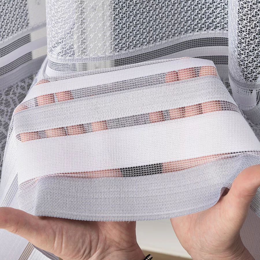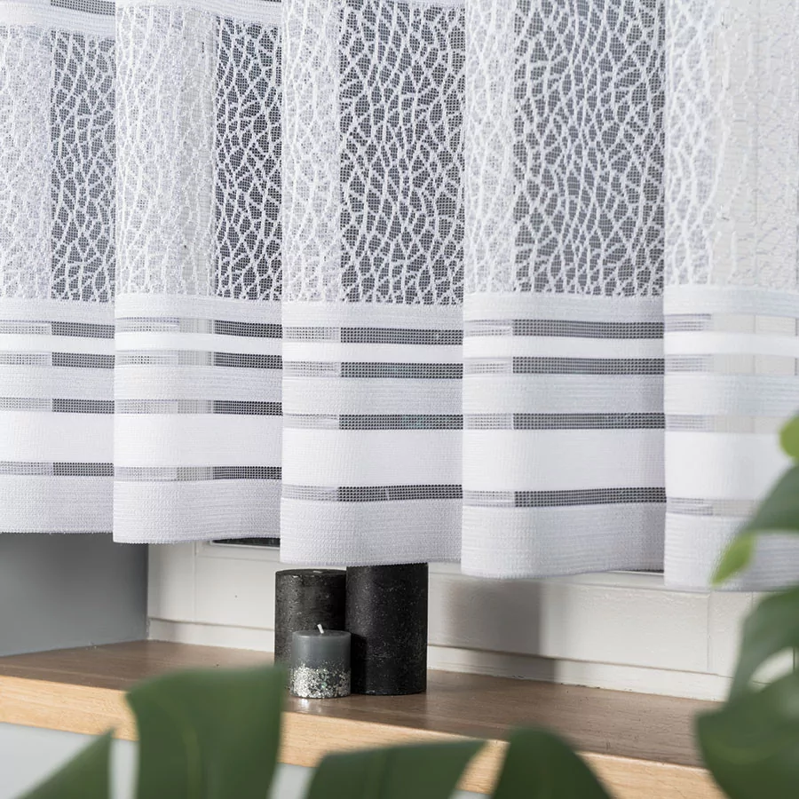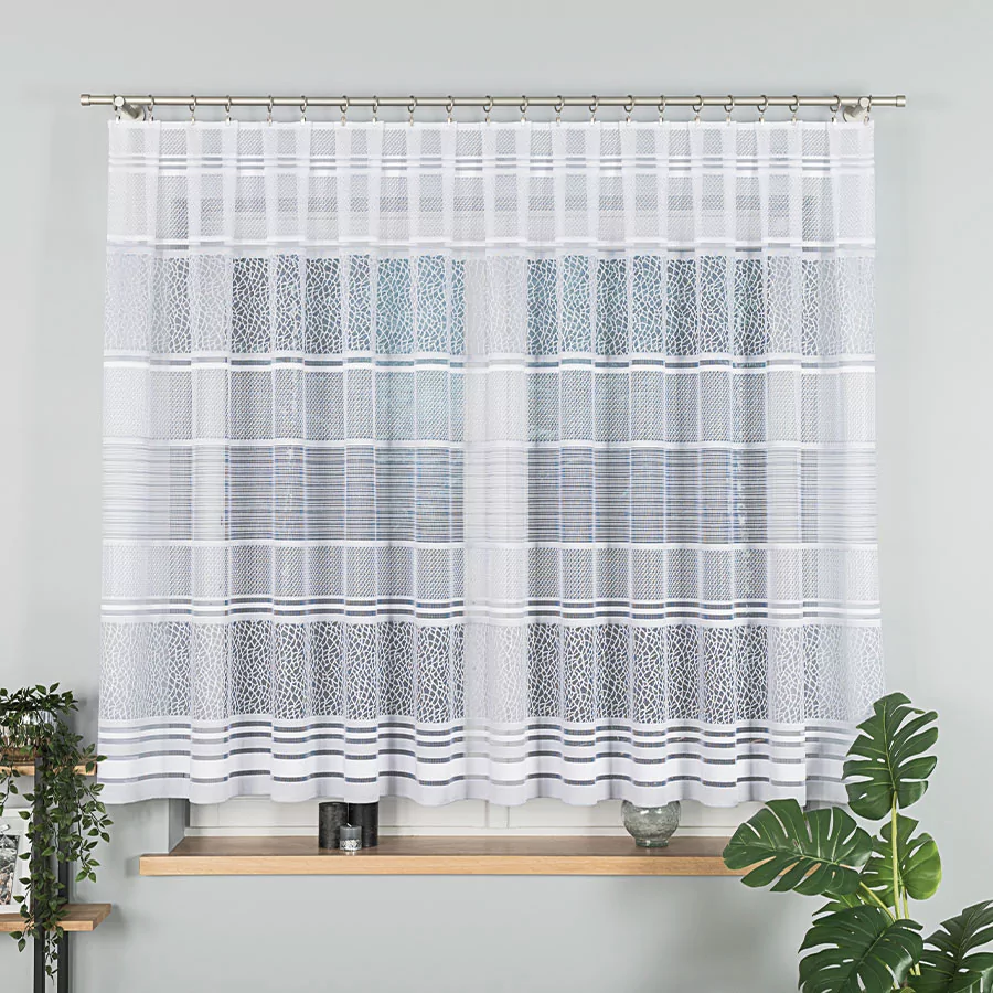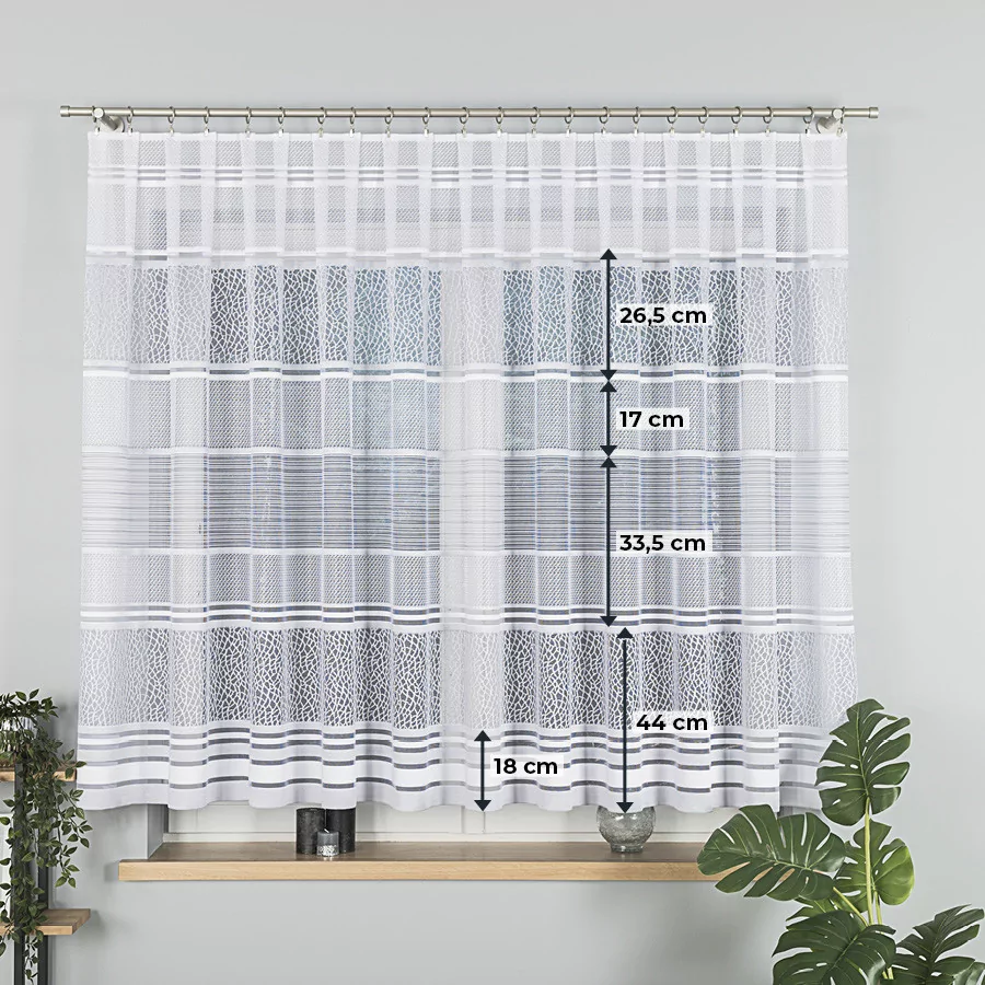 Firanka żakardowa metrażowa, dostępna w trzech wysokościach. Szerokość natomiast jest dowolna, dzięki czemu dopasujesz ją dokładnie do wymiarów swojego okna. Dostępna w dwóch wersjach kolorystycznych: biały ze starym złotem i biały z szarym. Wzór wykonany z najwyższej jakość przędzy żakardowej idealnie wkomponuje się w aranżację wnętrz nowoczesnych jak i tych urządzonych w klasycznym stylu. Firanka pięknie się układa, nie wymaga prasowania i można go prać w pralce w niskiej temperaturze. Cechuje ją dobra przepuszczalność powietrza i promieni słonecznych.