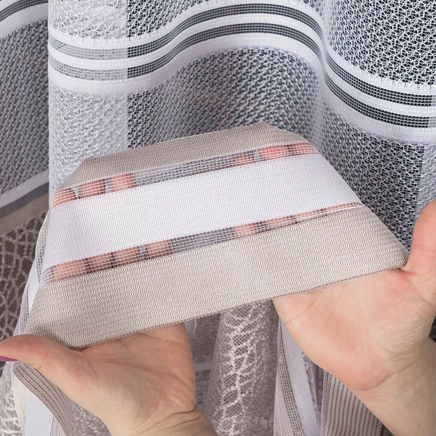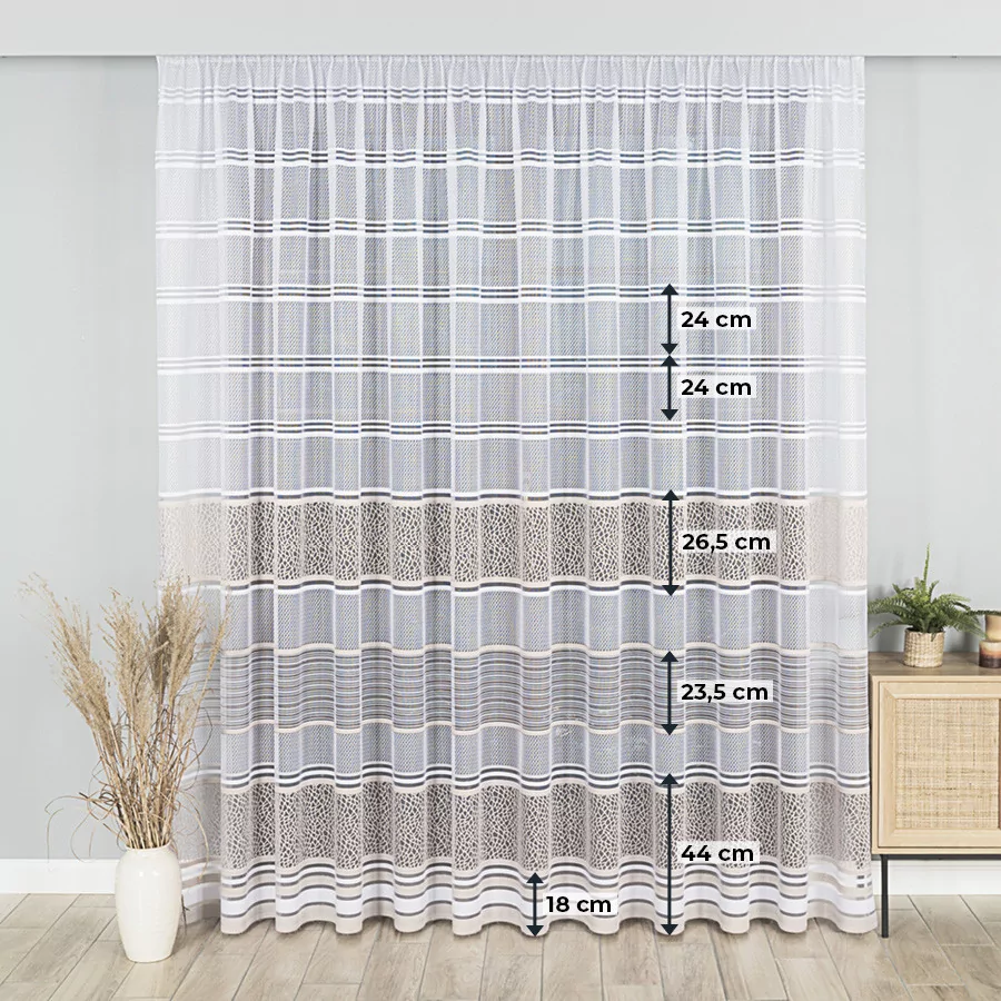 Firanka żakardowa metrażowa, dostępna w trzech wysokościach. Szerokość natomiast jest dowolna, dzięki czemu dopasujesz ją dokładnie do wymiarów swojego okna. Dostępna w dwóch wersjach kolorystycznych: biały ze starym złotem i biały z szarym. Wzór wykonany z najwyższej jakość przędzy żakardowej idealnie wkomponuje się w aranżację wnętrz nowoczesnych jak i tych urządzonych w klasycznym stylu. Firanka pięknie się układa, nie wymaga prasowania i można go prać w pralce w niskiej temperaturze. Cechuje ją dobra przepuszczalność powietrza i promieni słonecznych.
