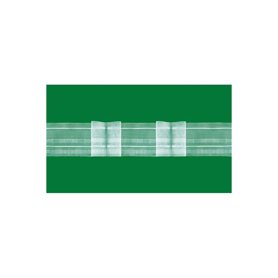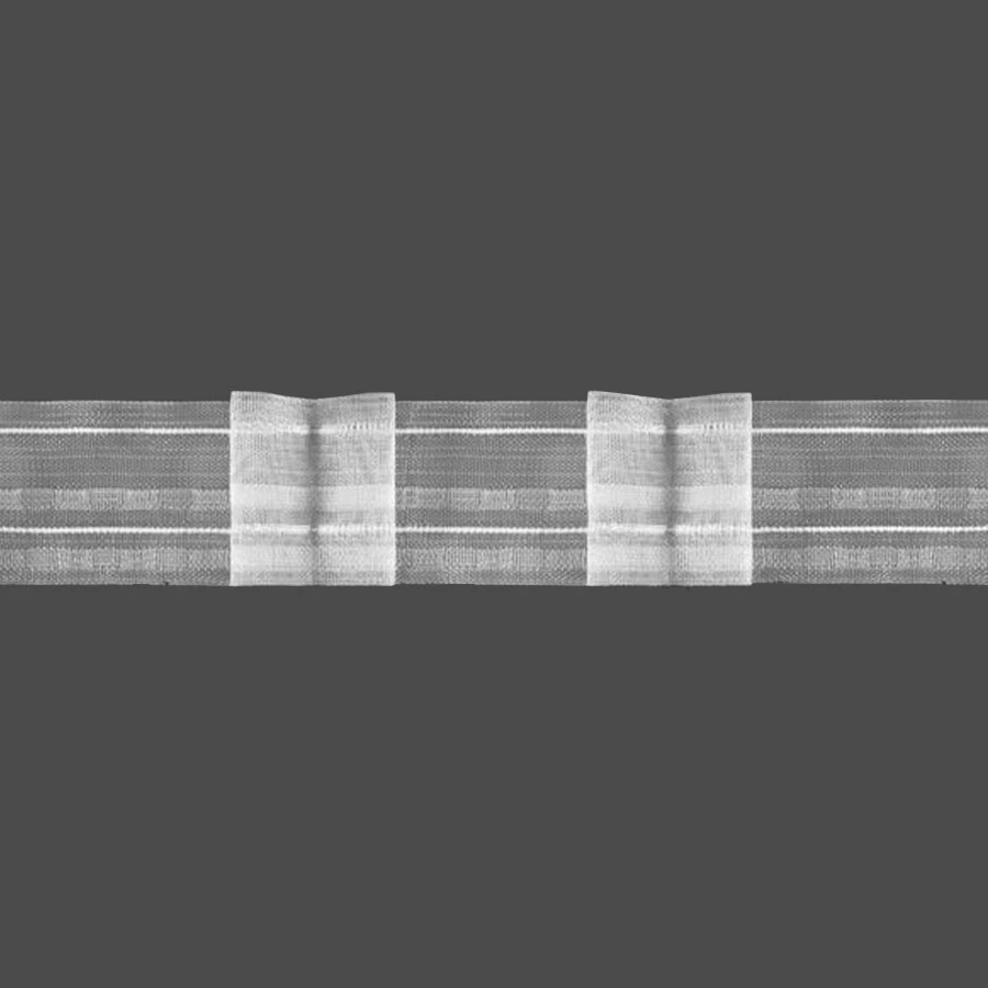 Taśma marszcząca podwójna zakładka, transparentna z białym sznurkiem. Taśma marszcząca ułatwia ułożenie firan, czy zasłon na karniszu. Ma ona uniwersalne mocowanie, na tzw. żabki, agrafki lub haczyki. Taśmę należy wszyć na prosto to firanki lub zasłony, a następnie pociągnąć za sznureczki, aby uzyskać odpowiedni efekt marszczenia. Zalecamy zakupić około 10 cm więcej taśmy niż materiału.