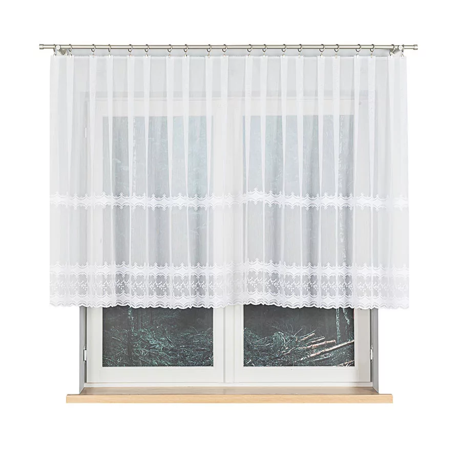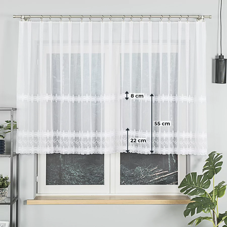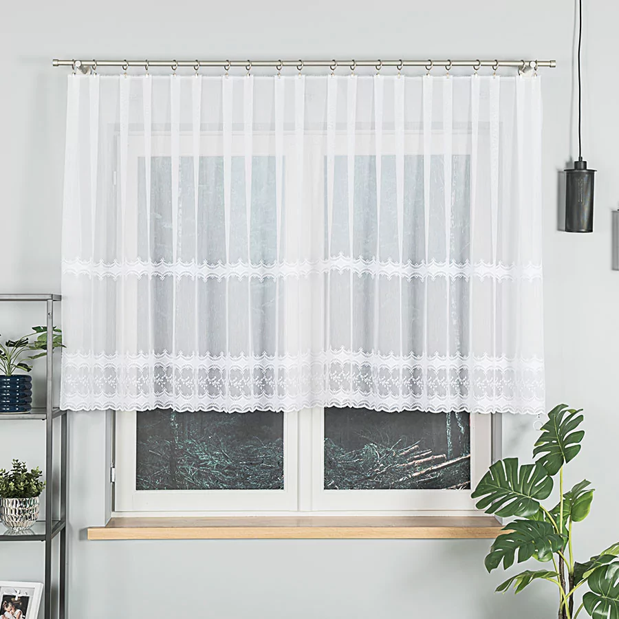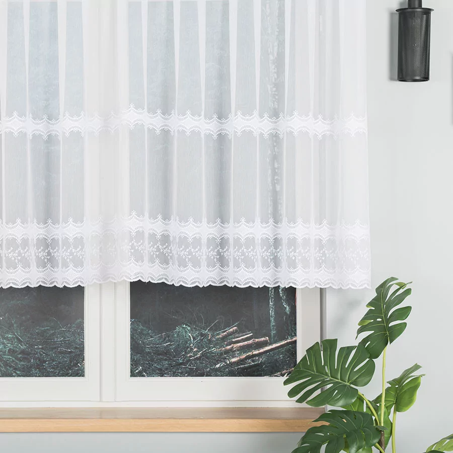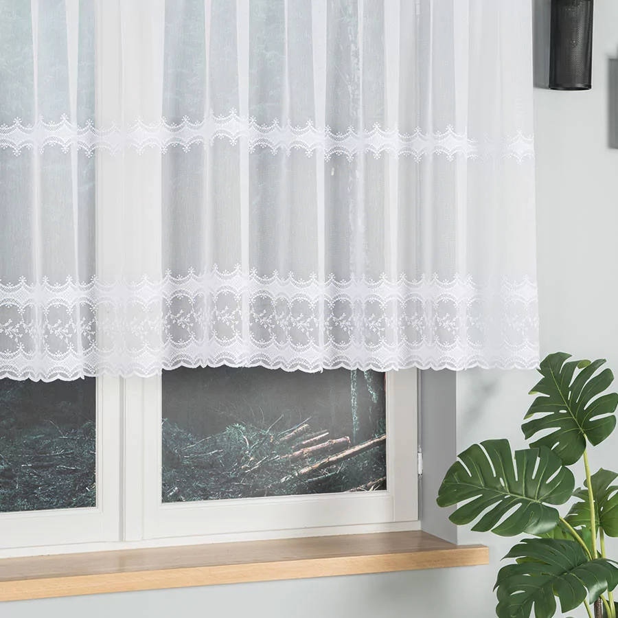 Firana metrażowa haftowana w kolorze białym z błyskiem. Szlakowo rozmieszczony wzór sprawia, że firana świetnie pasuje do wnętrz charakteryzujących się nowoczesną elegancją. Firankę możesz zamówić z usługą szycia w naszej profesjonalnej szwalni - wybierz taśmę lub przelotki, podaj wymiary, a otrzymasz uszytą i gotową do zawieszenia firankę. Bardzo przejrzysta firanka została wykonana na drobnym, delikatnym podkładzie. Siatka, na której wyhaftowany jest wzór tej firanki doskonale przepuszcza powietrze i wpuszcza do pomieszczenia dużo promieni słonecznych. Firanka doskonale się układa i z pewnością będzie idealną ozdobą Twojego okna. Pięknie się układa, można ją prać w pralce w niskiej temperaturze.