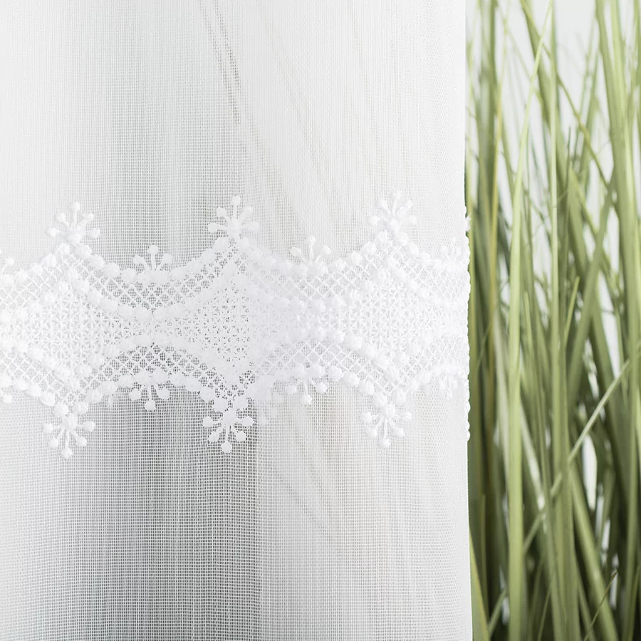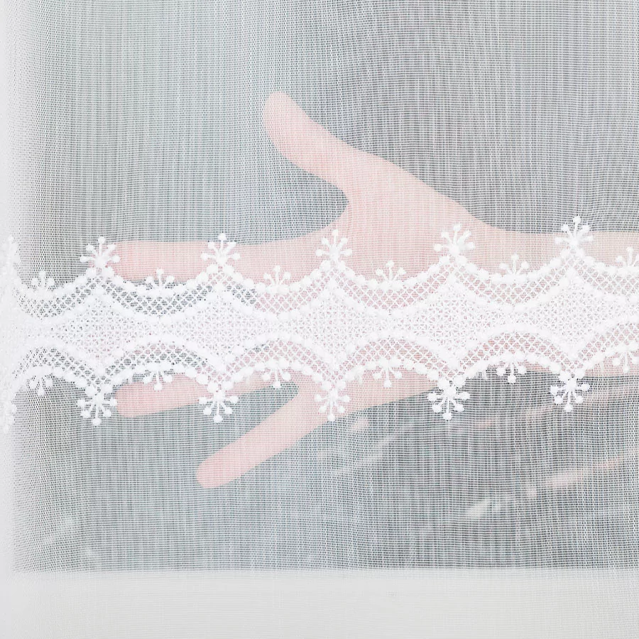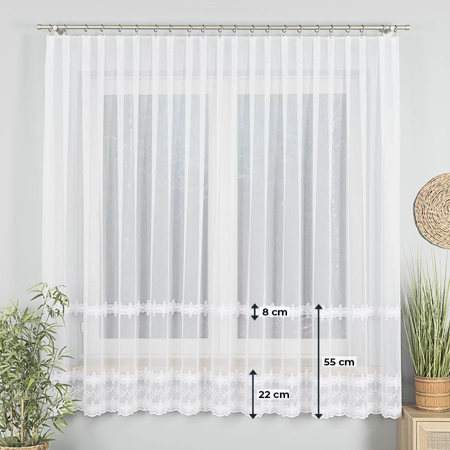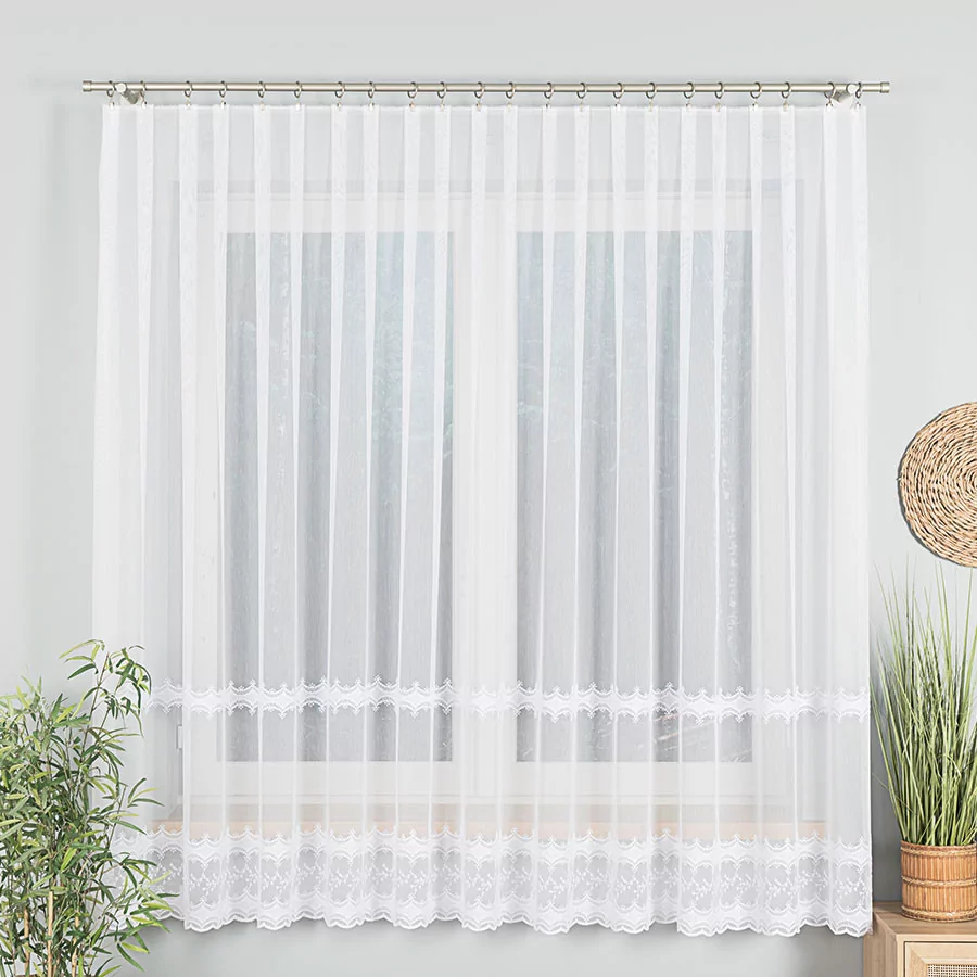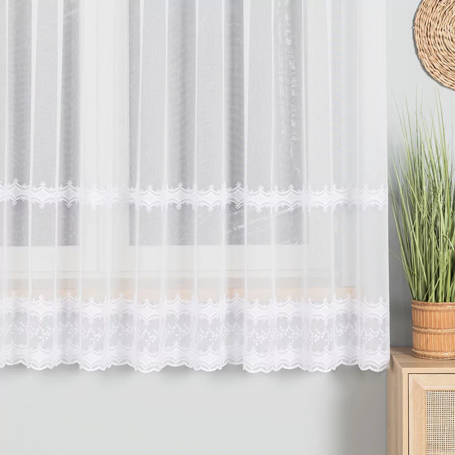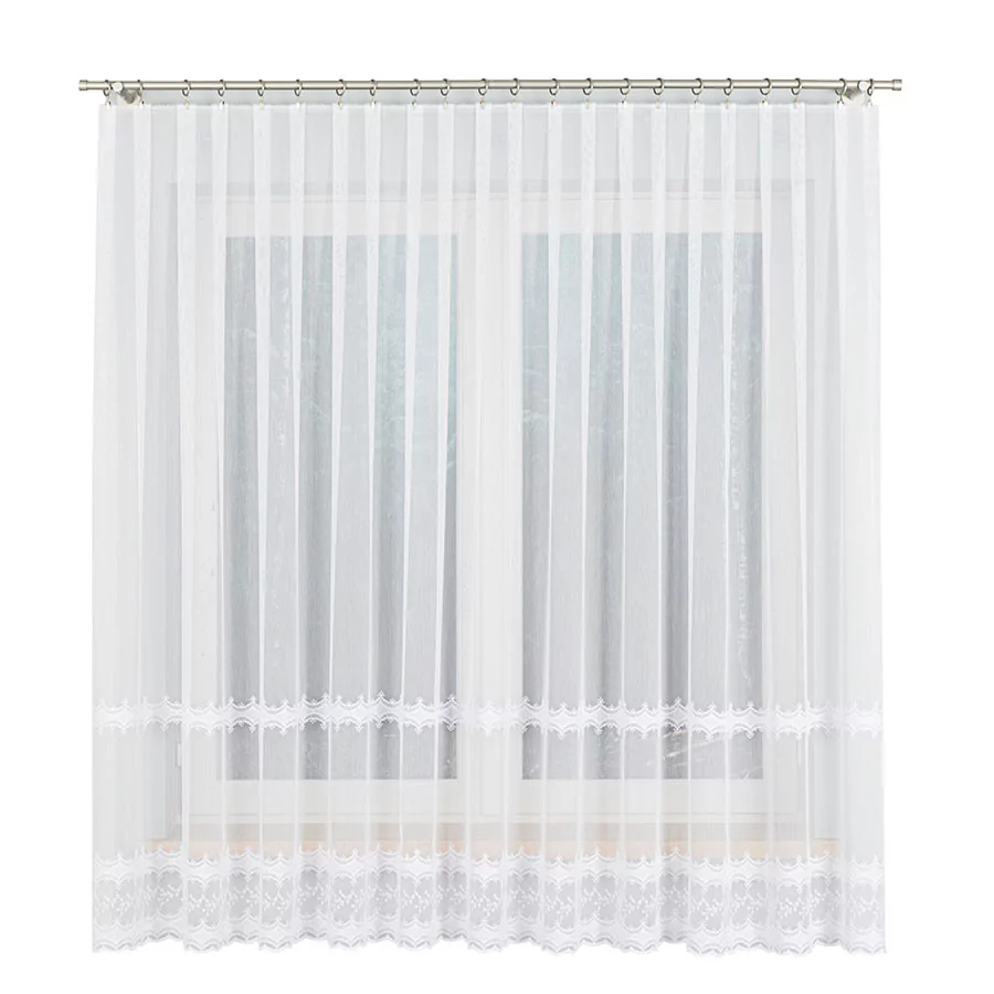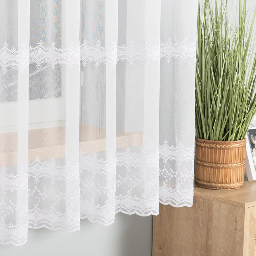 Firana metrażowa haftowana w kolorze białym z błyskiem. Szlakowo rozmieszczony wzór sprawia, że firana świetnie pasuje do wnętrz charakteryzujących się nowoczesną elegancją. Firankę możesz zamówić z usługą szycia w naszej profesjonalnej szwalni - wybierz taśmę lub przelotki, podaj wymiary, a otrzymasz uszytą i gotową do zawieszenia firankę. Bardzo przejrzysta firanka została wykonana na drobnym, delikatnym podkładzie. Siatka, na której wyhaftowany jest wzór tej firanki doskonale przepuszcza powietrze i wpuszcza do pomieszczenia dużo promieni słonecznych. Firanka doskonale się układa i z pewnością będzie idealną ozdobą Twojego okna. Pięknie się układa, można ją prać w pralce w niskiej temperaturze.