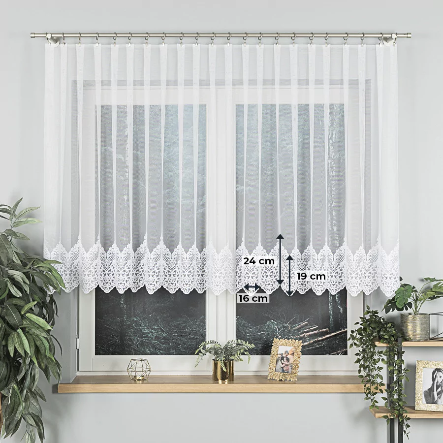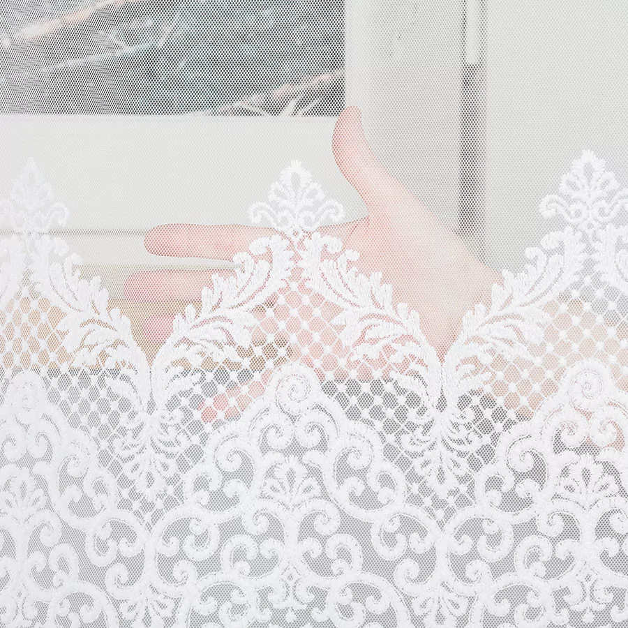 Firana haftowana mieniącą się na różne kolory nitką. Haftowany wzór u samego dołu delikatnego, tiulowego podkładu sprawia, że firana świetnie pasuje do wnętrz charakteryzujących się nowoczesną elegancją. Bardzo przejrzysta firanka została wykonana na drobnym, delikatnym podkładzie. Tiul, na którym wyhaftowany jest wzór tej firanki doskonale przepuszcza powietrze i wpuszcza do pomieszczenia dużo promieni słonecznych. Firanka doskonale się układa i z pewnością będzie idealną ozdobą Twojego okna. Pięknie się układa, można ją prać w pralce w niskiej temperaturze.