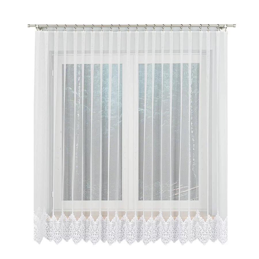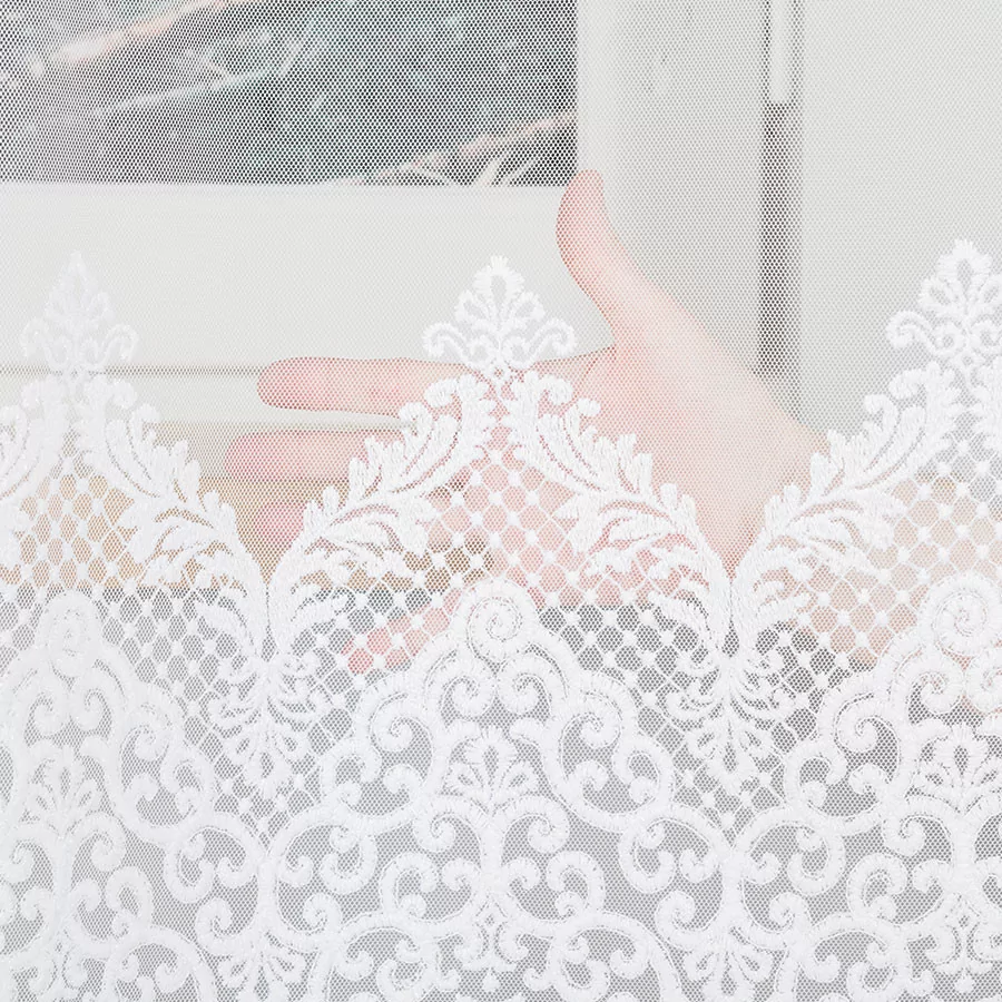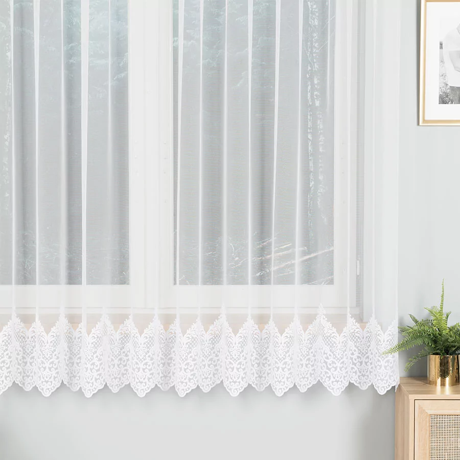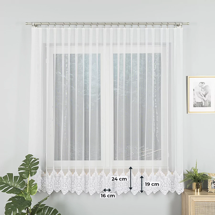 Firana haftowana mieniącą się na różne kolory nitką. Haftowany wzór u samego dołu delikatnego, tiulowego podkładu sprawia, że firana świetnie pasuje do wnętrz charakteryzujących się nowoczesną elegancją. Bardzo przejrzysta firanka została wykonana na drobnym, delikatnym podkładzie. Tiul, na którym wyhaftowany jest wzór tej firanki doskonale przepuszcza powietrze i wpuszcza do pomieszczenia dużo promieni słonecznych. Firanka doskonale się układa i z pewnością będzie idealną ozdobą Twojego okna. Pięknie się układa, można ją prać w pralce w niskiej temperaturze.