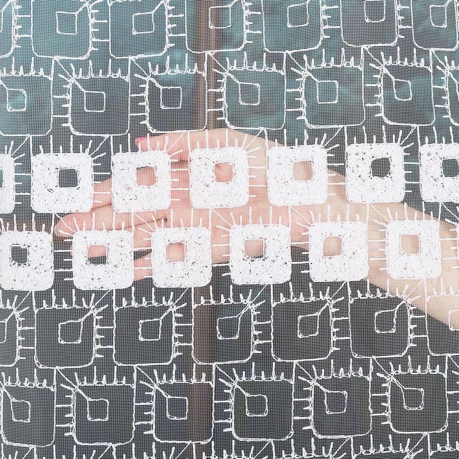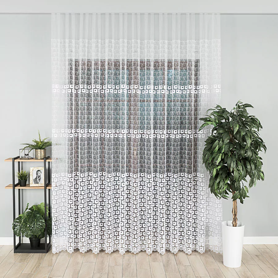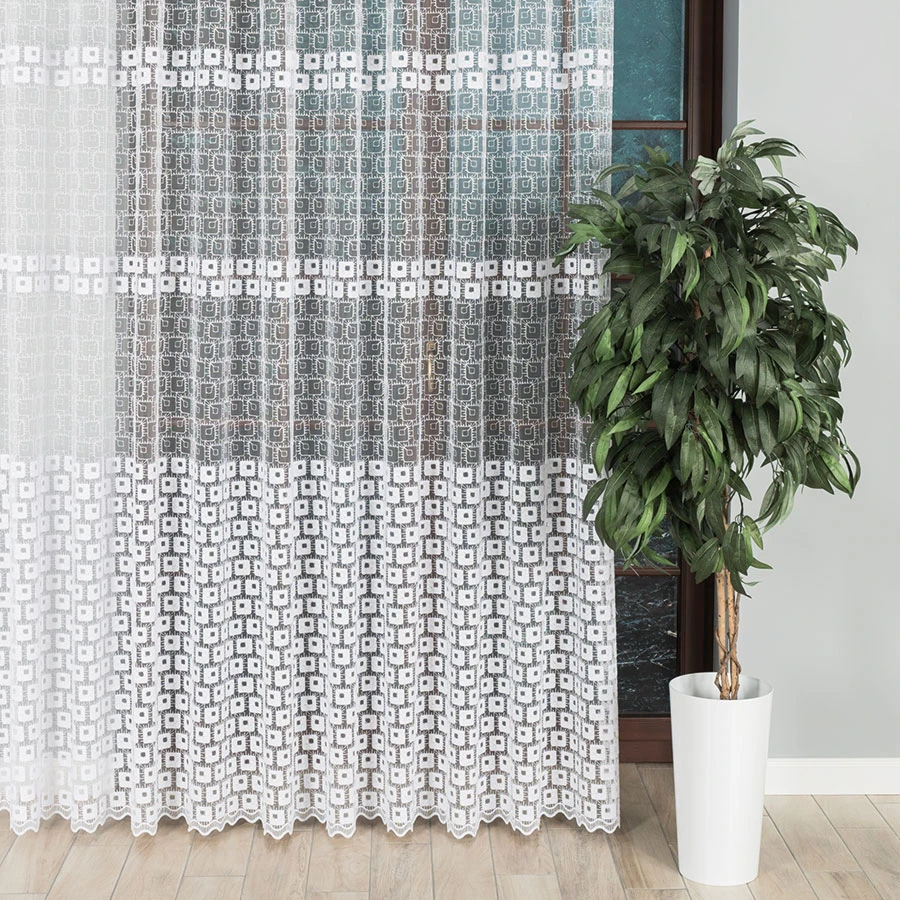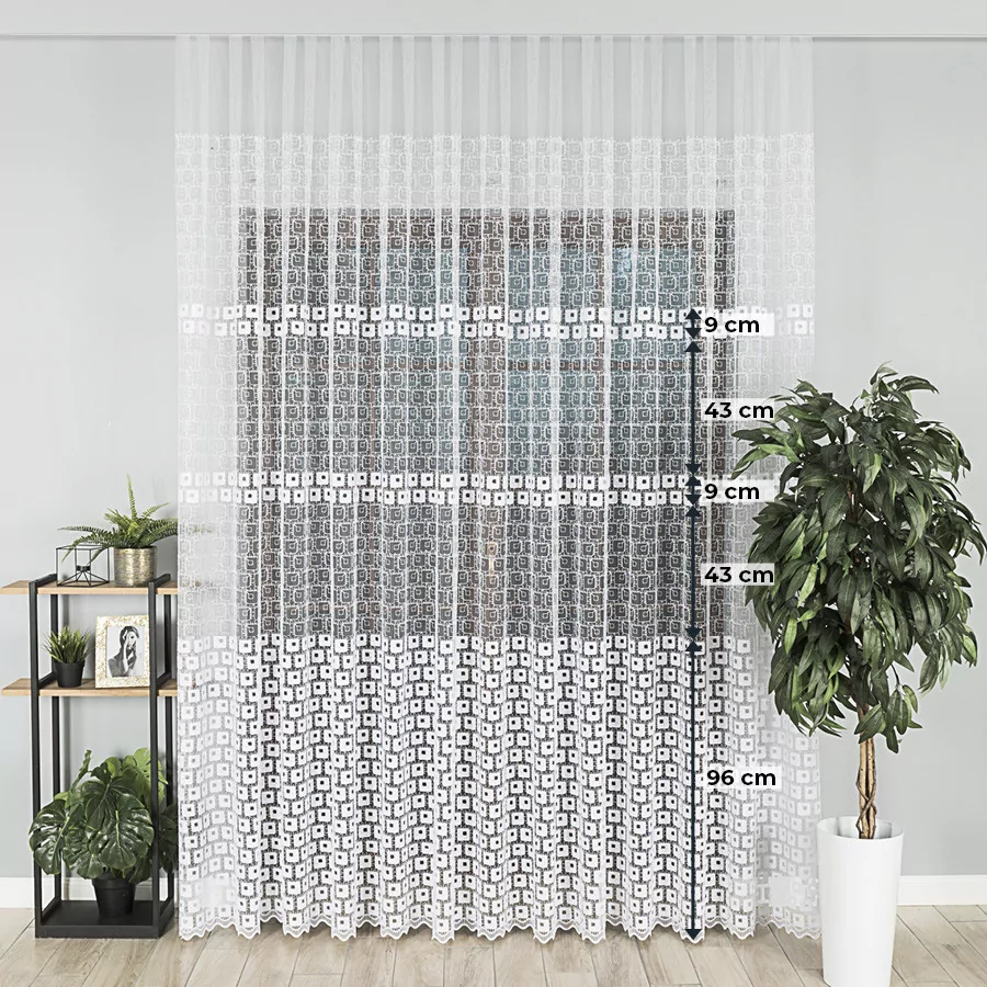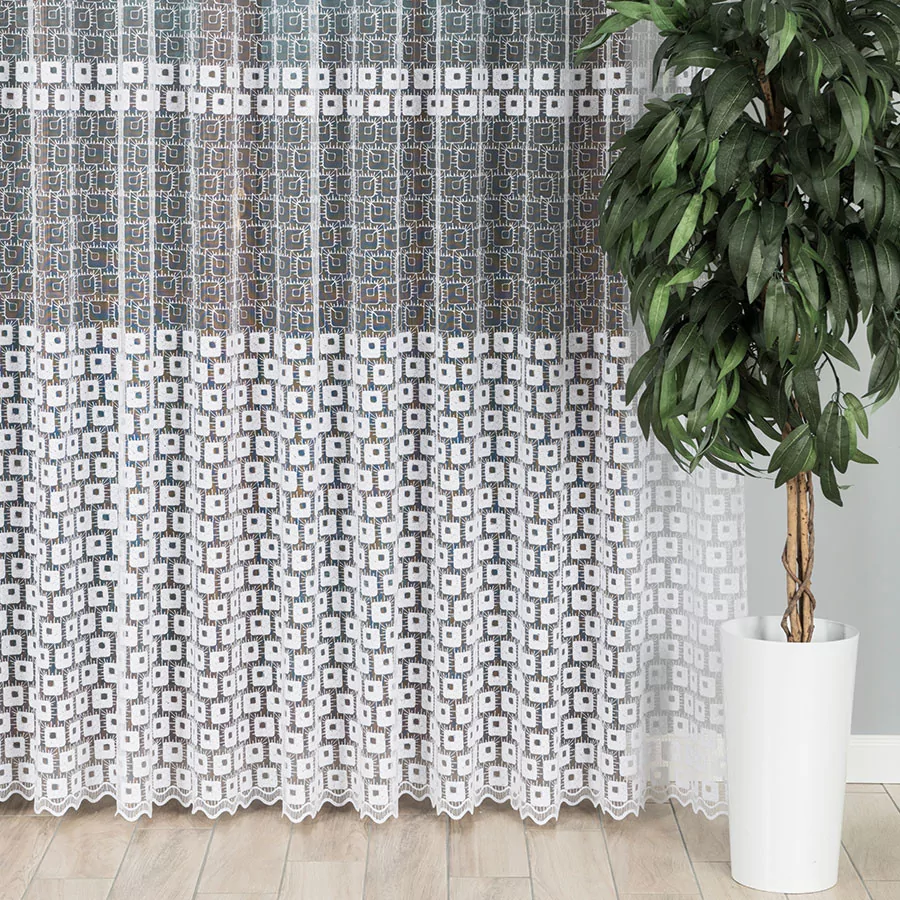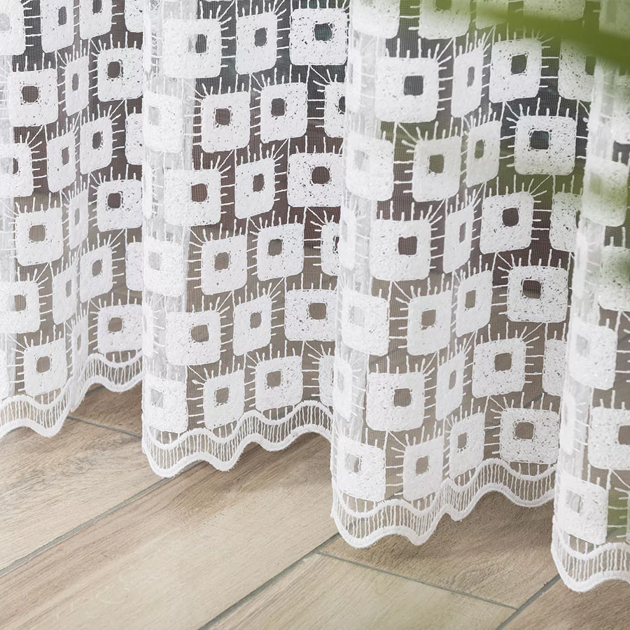 Firana haftowana mieniącą się na różne kolory nitką. Haftowany geometryczny wzór na całej powierzchni delikatnego, siateczkowego podkładu sprawia, że firana świetnie pasuje do wnętrz charakteryzujących się nowoczesną elegancją. Bardzo przejrzysta firanka została wykonana na drobnym, delikatnym podkładzie. Siatka, na której wyhaftowany jest wzór tej firanki doskonale przepuszcza powietrze i wpuszcza do pomieszczenia dużo promieni słonecznych. Firanka doskonale się układa i z pewnością będzie idealną ozdobą Twojego okna. Firankę możesz zamówić z usługą szycia w naszej profesjonalnej szwalni - wybierz taśmę lub przelotki, podaj wymiary, a otrzymasz uszytą i gotową do zawieszenia firankę.
