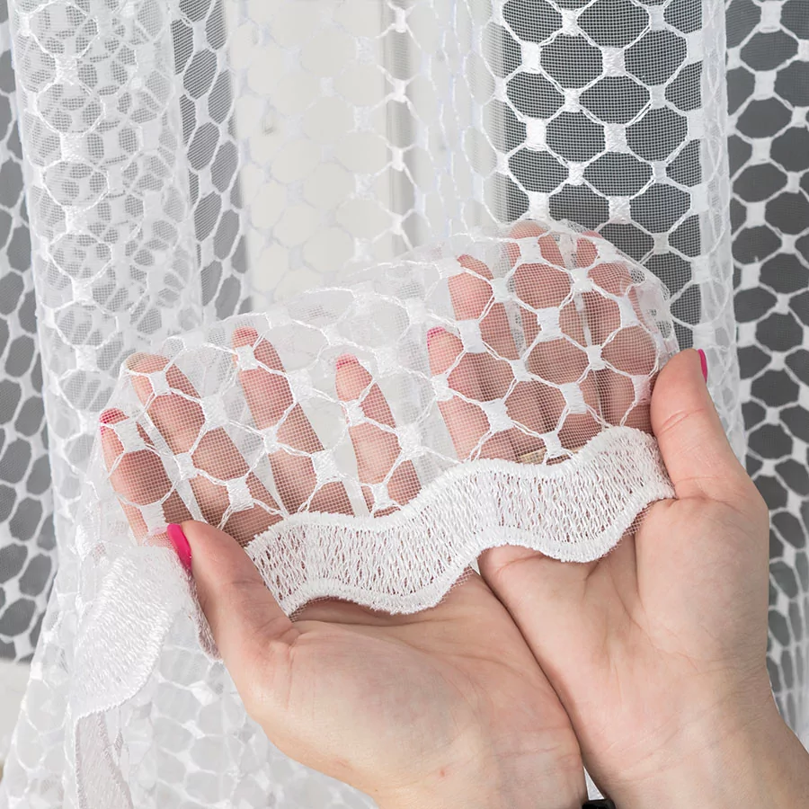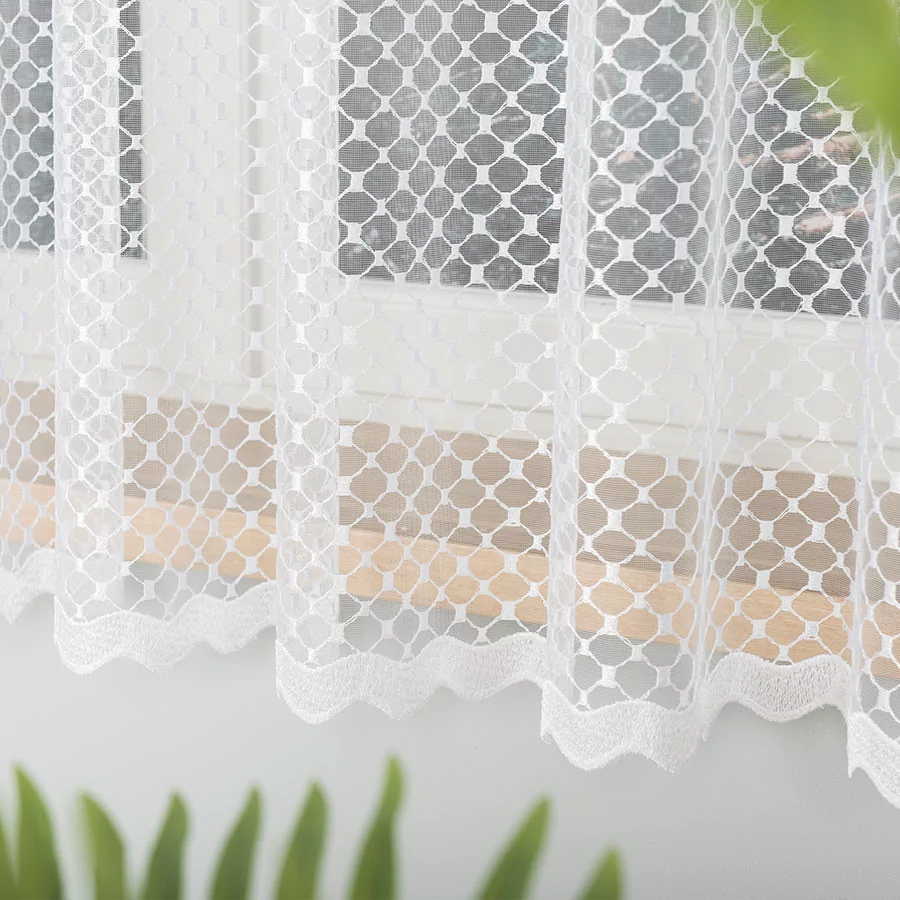 Przepiękny, gęsty aczkolwiek delikatny haft na podkładzie z drobnej siateczki to nasza propozycja firany dostępnej w metrażu w kolorze białym. Firanki haftowane, w zależności od wzoru, będą doskonałą dekoracją okna w każdym pomieszczeniu. Haft kojarzy się zwykle z luksusem i elegancją, ale różnorodne formy haftu będą doskonale komponować się w modernistycznych wnętrzach. Bardzo przejrzysta firanka została wykonana na drobnym, siateczkowym podkładzie. Siateczka, na której wyhaftowany jest wzór tej firanki doskonale przepuszcza powietrze i wpuszcza do pomieszczenia dużo promieni słonecznych. Firanka doskonale się układa i z pewnością będzie idealną ozdobą Twojego okna.