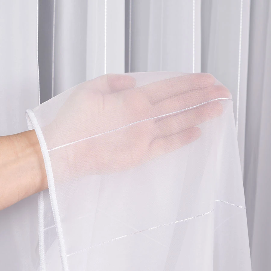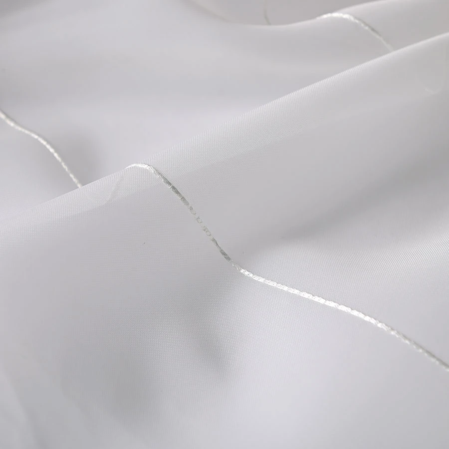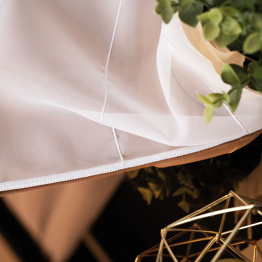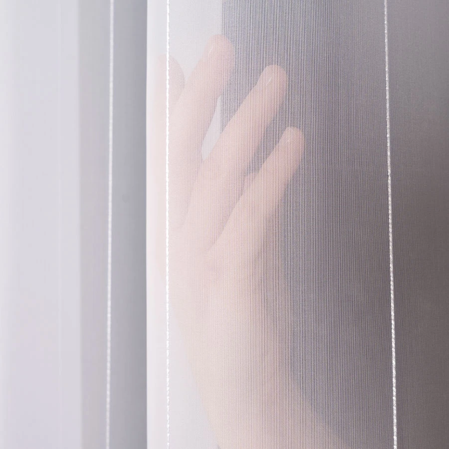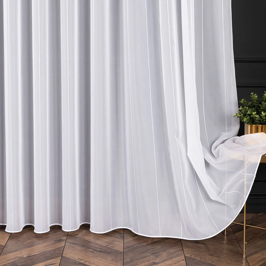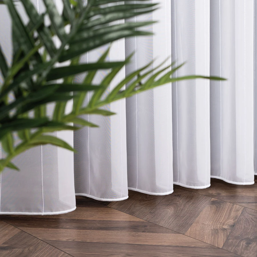 Gładka firana z pionowymi, błyszczącymi przeszyciami, wykonana na miękkim i lejącym podkładzie woalowym. Dostępna w kolorze białym i kremowym.