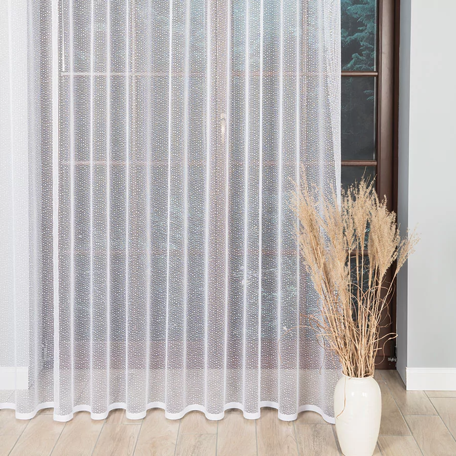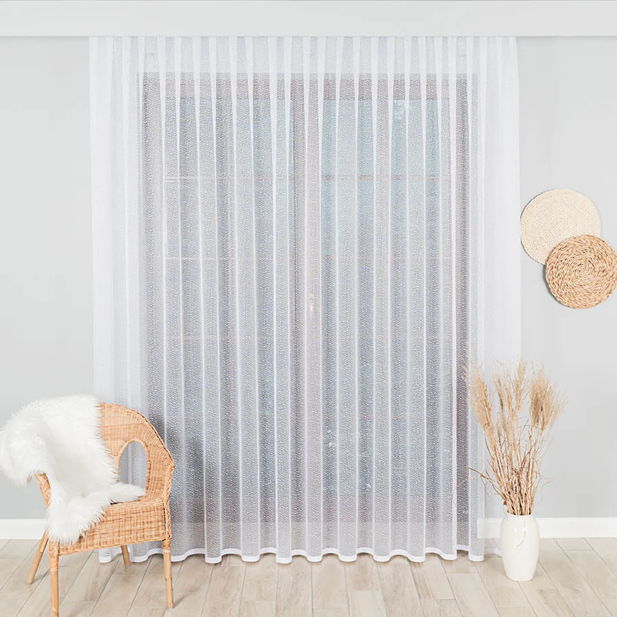 Firanka żakardowa metrażowa, dostępna w kilku wysokościach. Szerokość natomiast jest dowolna, dzięki czemu dopasujesz ją dokładnie do wymiarów swojego okna. Najwyższa jakość przędzy żakardowej idealnie wkomponuje się w aranżację wnętrz nowoczesnych jak i tych urządzonych w klasycznym stylu. Firanka pięknie się układa, nie wymaga prasowania i można ją prać w pralce w niskiej temperaturze. Cechuje ją dobra przepuszczalność powietrza i promieni słonecznych.