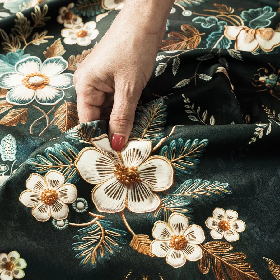Dla wszystkich miłośników gęstych, dużych wzorów w mocno nasyconej kolorystyce mamy coś, co na pewno przypadnie do gustu. Przedstawiamy miękką i miłą w dotyku tkaninę dekoracyjną EMBRA VELVET. Pasuje do wnętrz nowoczesnych, jak i tych urządzonych w klasycznym stylu. Wysoka gramatura i gęstość materiału gwarantuje dość mocne zasłonięcie okna. Dzięki niej możemy osłonić się przed wścibskim wzrokiem sąsiadów lub przechodniów. Ponadto, przyczynia się do stworzenia bardziej przytulnego wnętrza, w którym chętnie spędzimy czas z całą rodziną. Materiał idealny na zasłony, poszewki lub narzuty.
