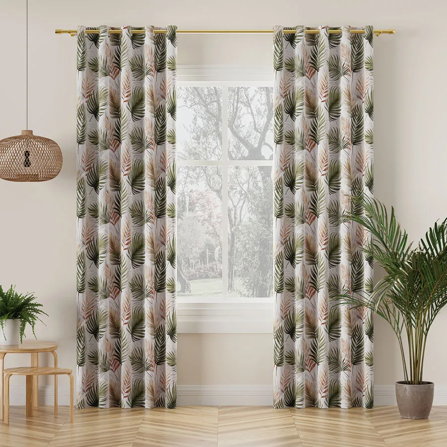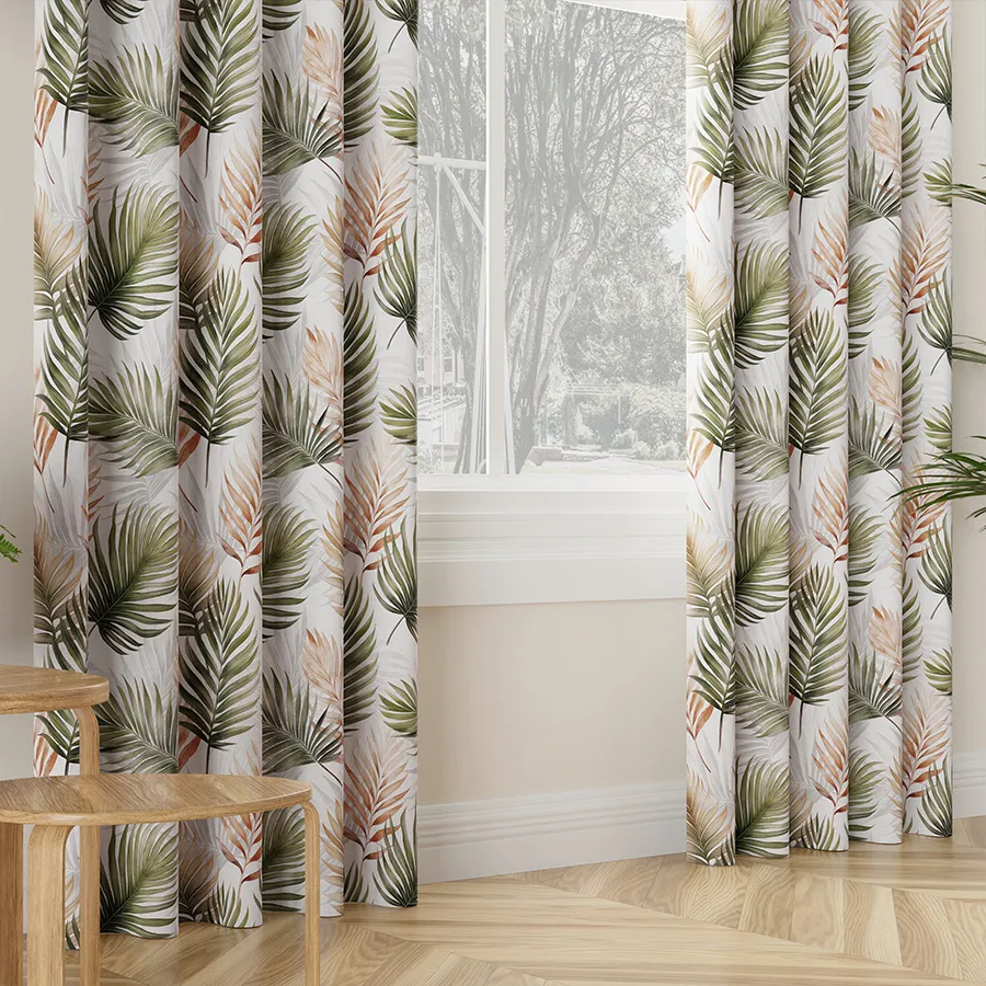 PALMA - tkanina dekoracyjna typu MILAS. Gładki, półzaciemniający materiał z pięknym motywem roślinnym w różnych odcieniach brązu i zieleni. Wysoka gramatura i gęstość materiału gwarantują dość mocne zaciemnienie. Materiał jest miękki i "lejący", dzięki czemu wspaniale się układa, tworząc piękną dekorację. Materiał idealny na zasłony, poszewki lub narzuty.