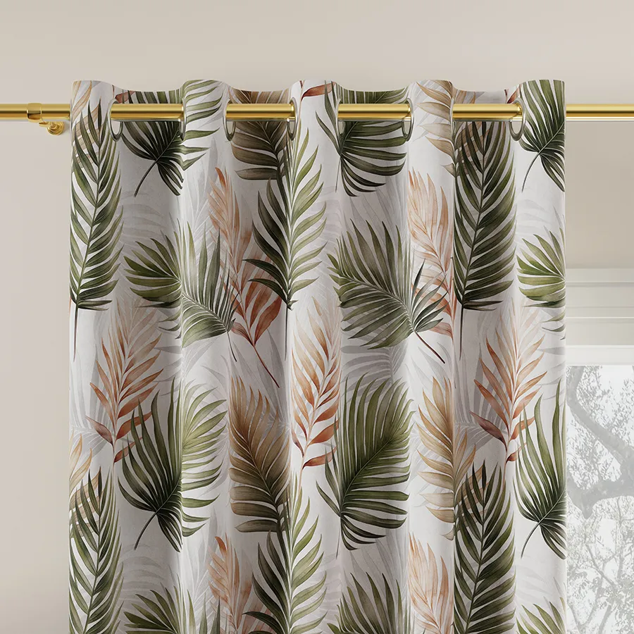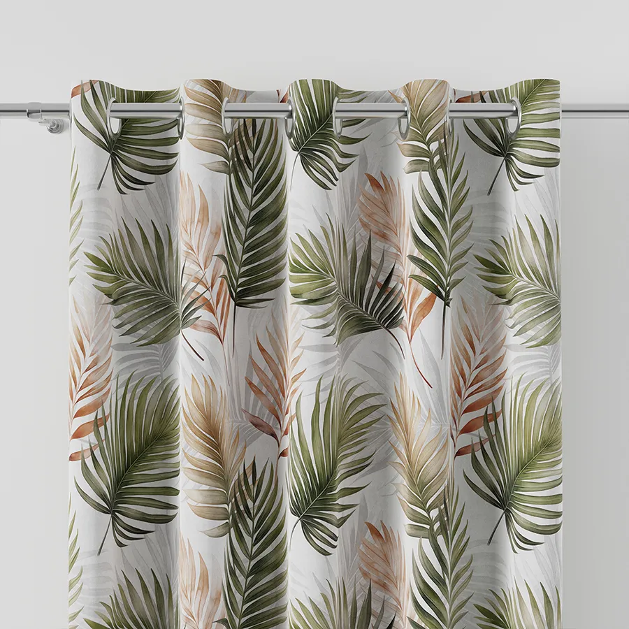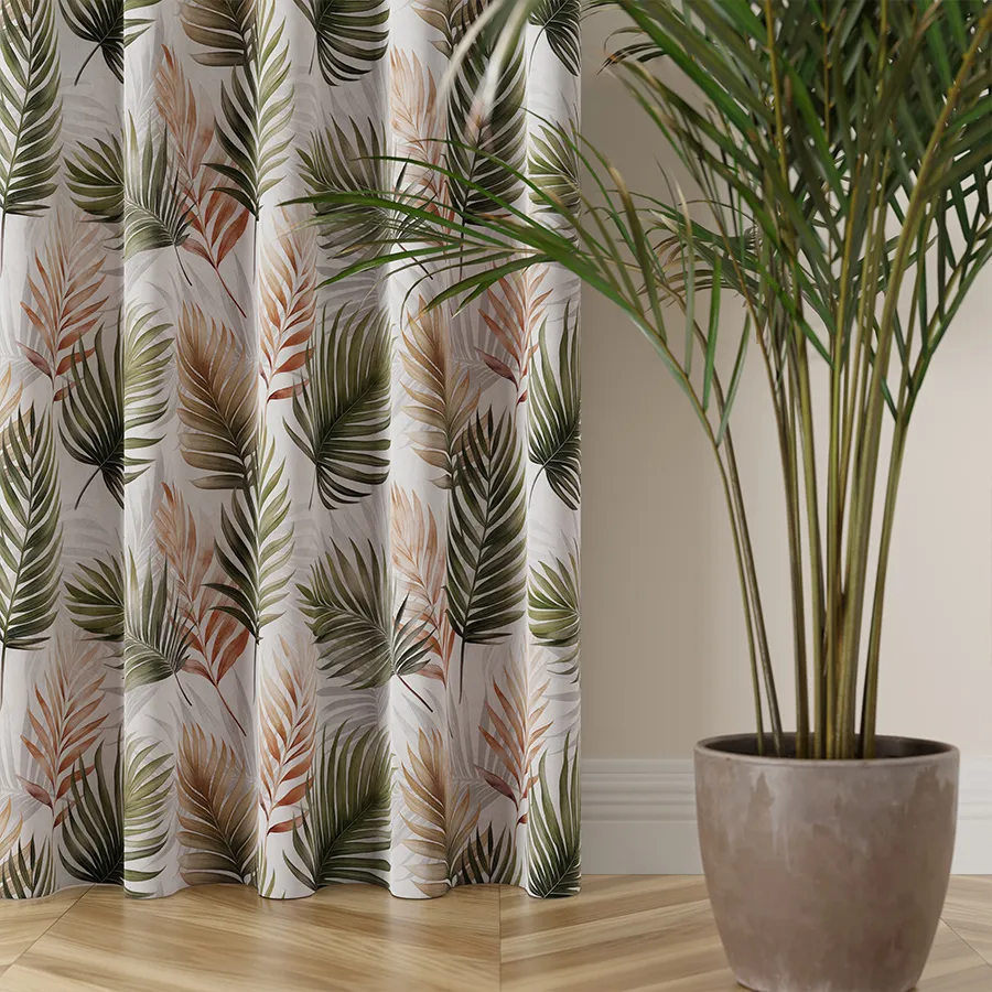 PALMA - tkanina dekoracyjna typu MILAS. Gładki, półzaciemniający materiał z pięknym motywem roślinnym w różnych odcieniach brązu i zieleni.