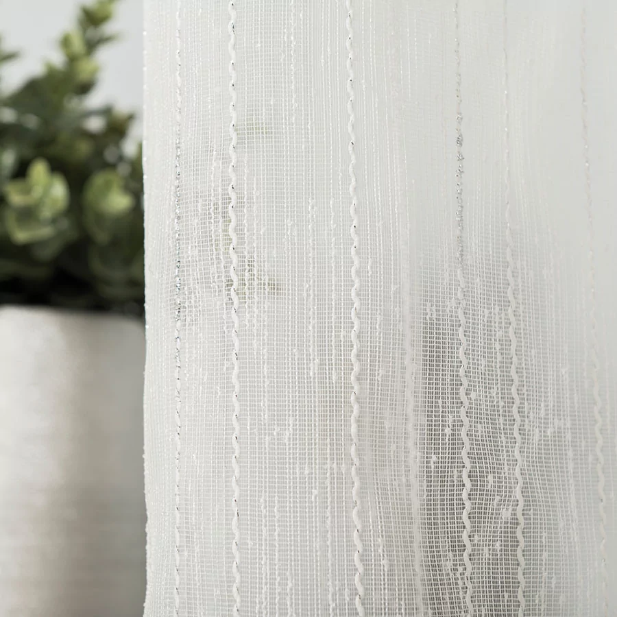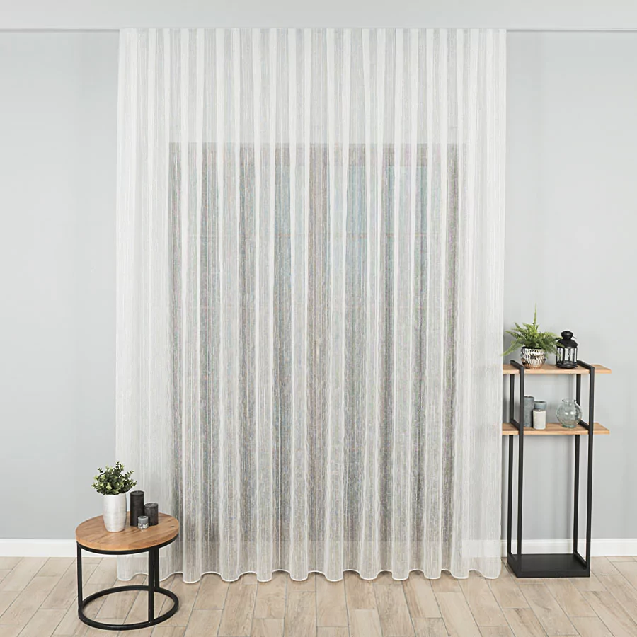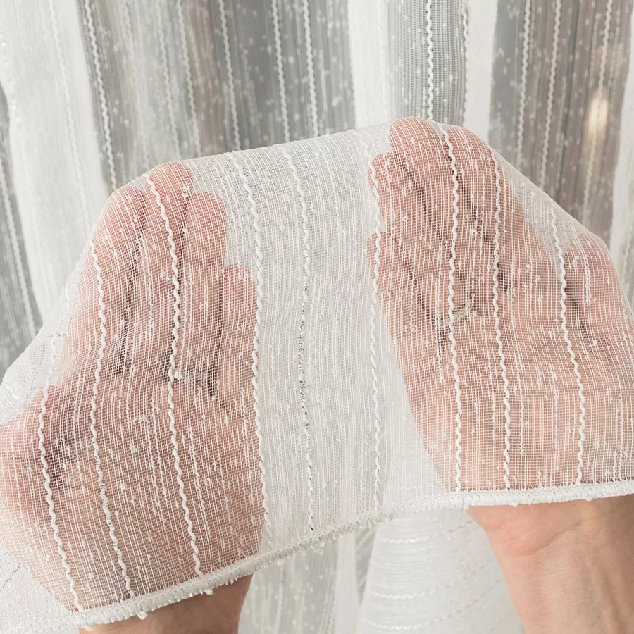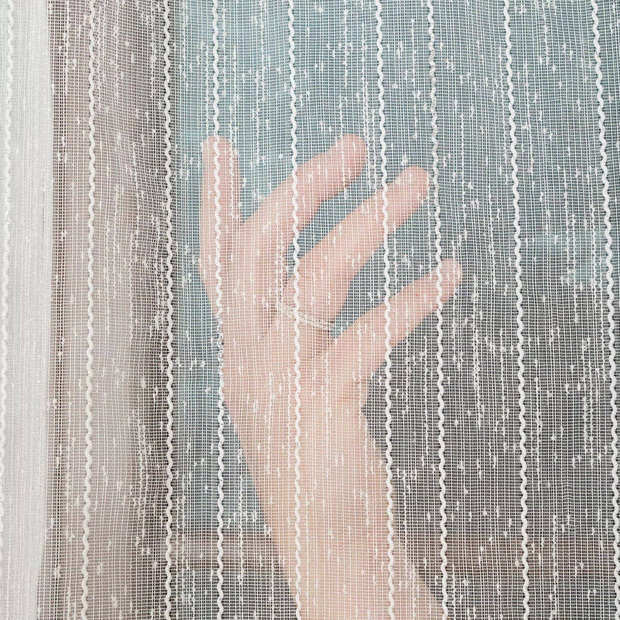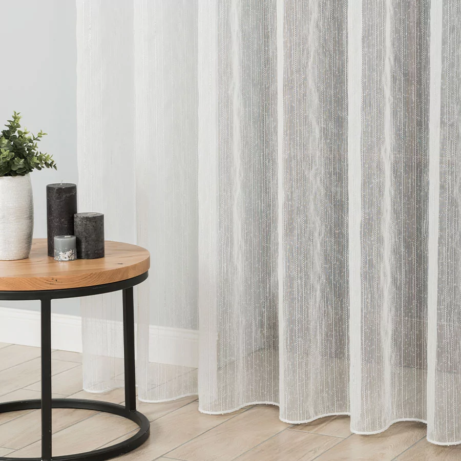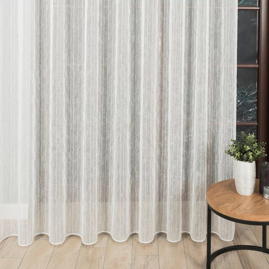 Fantazyjna firana na podkładzie z mięciutkiej siatki, wykończona oryginalnym zdobieniem w postaci grubszych przeszyć i delikatnego efektu deszczyku.