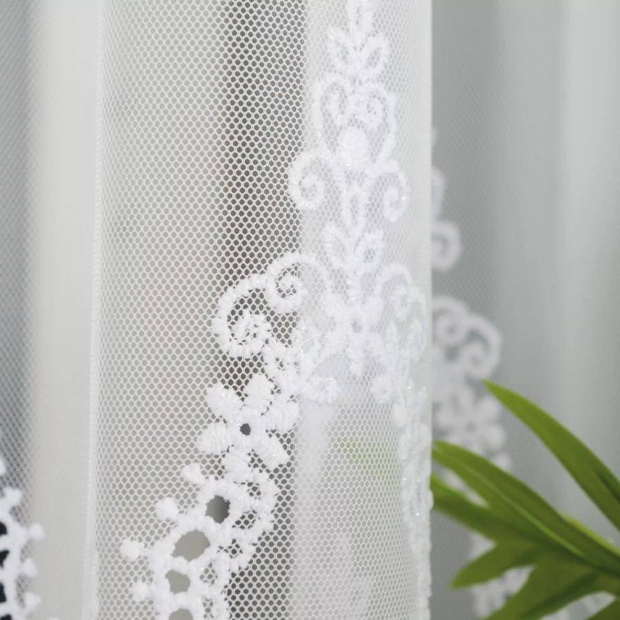 Stwórz magiczną atmosferę w swoim domu dzięki naszej haftowanej firance na tiulu. Przez całość wzoru światło delikatnie przenika do Twojego wnętrza, tworząc niepowtarzalny efekt. Lekka i przewiewna tkanina idealnie się układa, dodając elegancji i wyrafinowania każdemu pomieszczeniu.