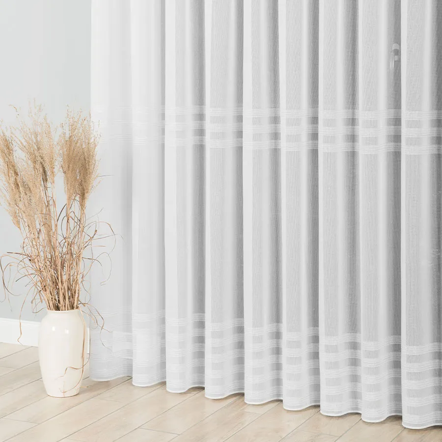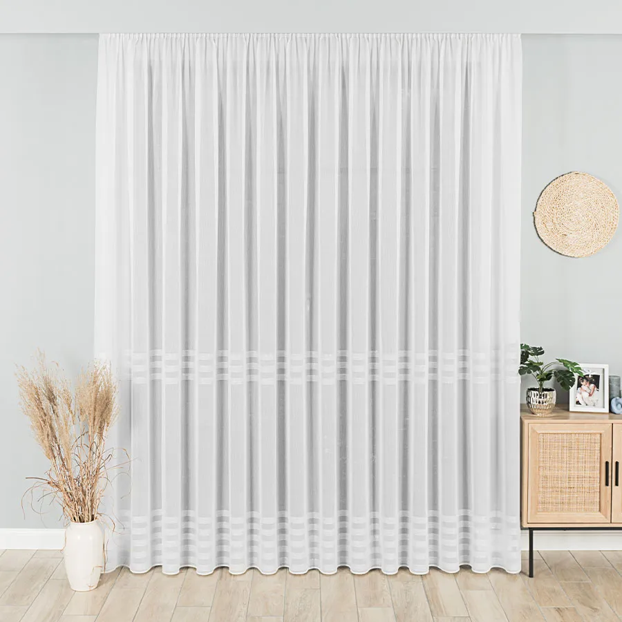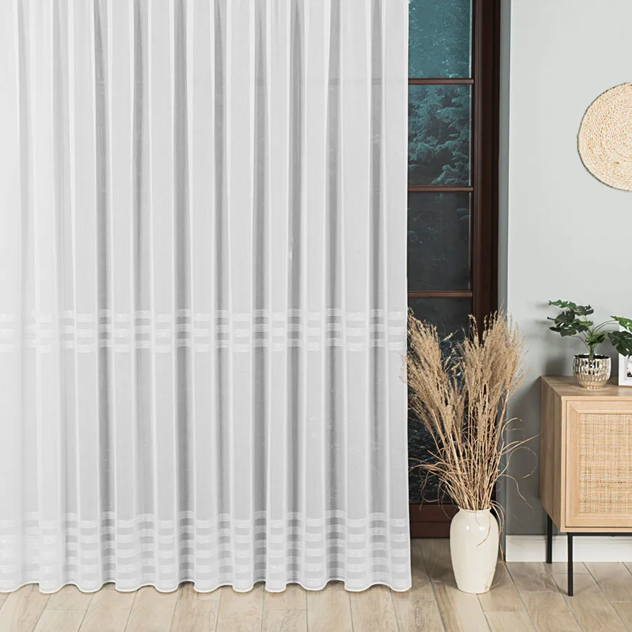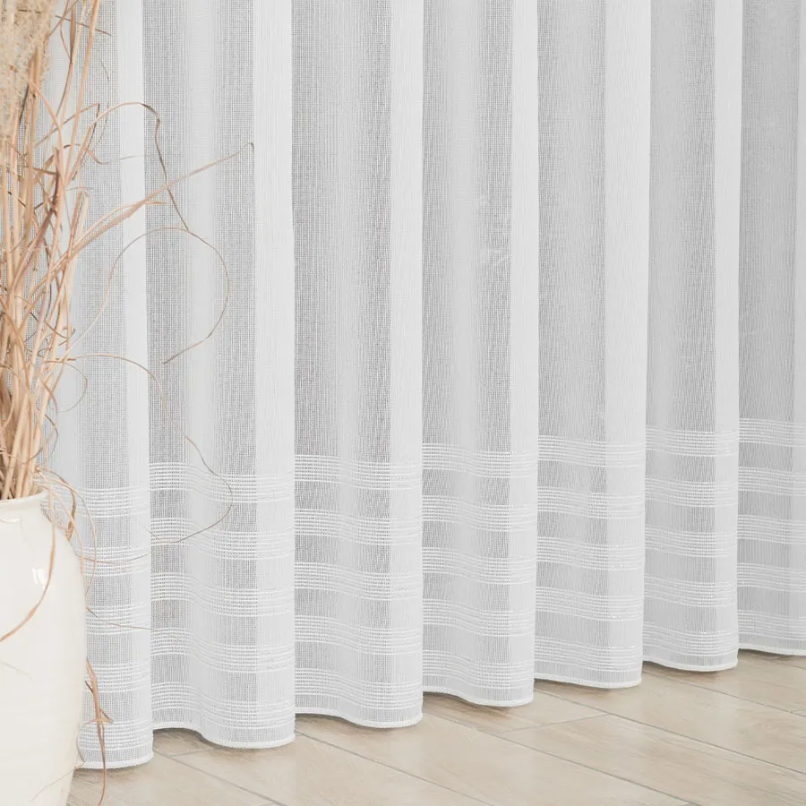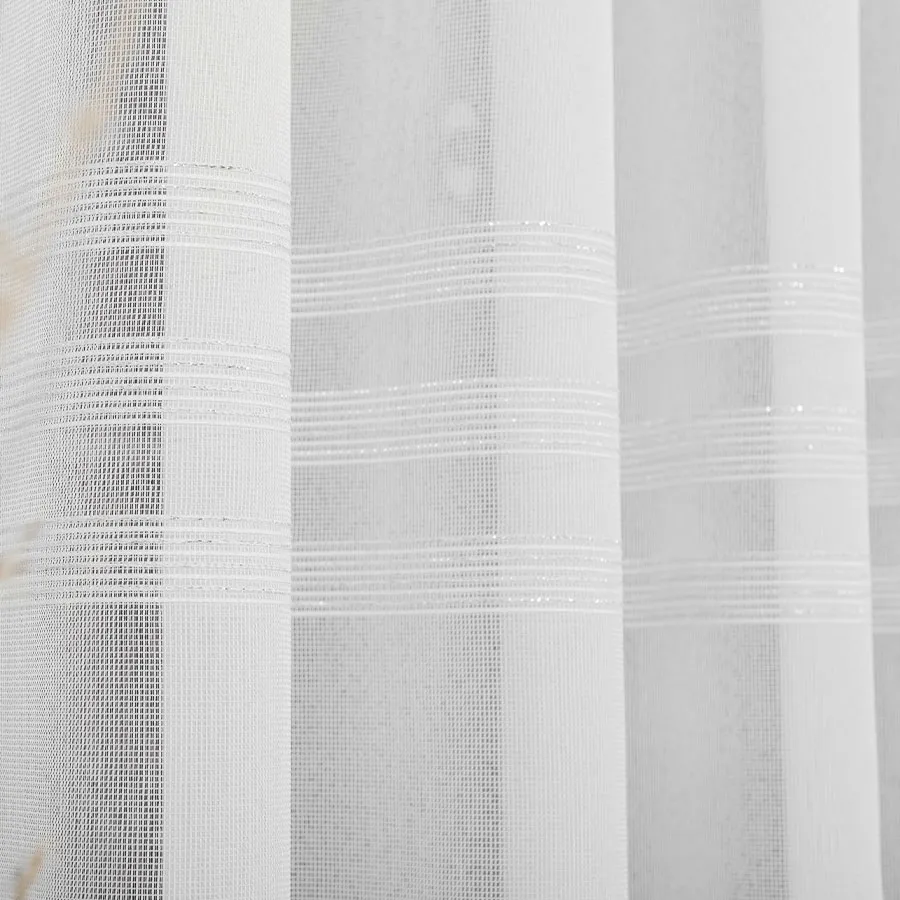 Pięknie układająca się gotowa firanka z poziomymi pasami. Dostępna w kolorze białym lub biało-szarym. Dodatek srebrnej, błyszczącej nici pięknie zdobi całą powierzchnię firany. Bardzo dobrze przepuszcza powietrze i promienie słoneczne. Firanka uszyta na taśmie marszczącej typu "smok".