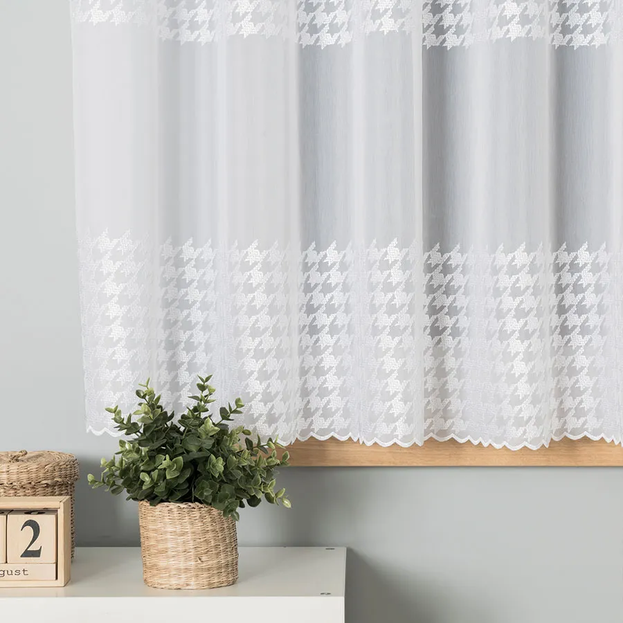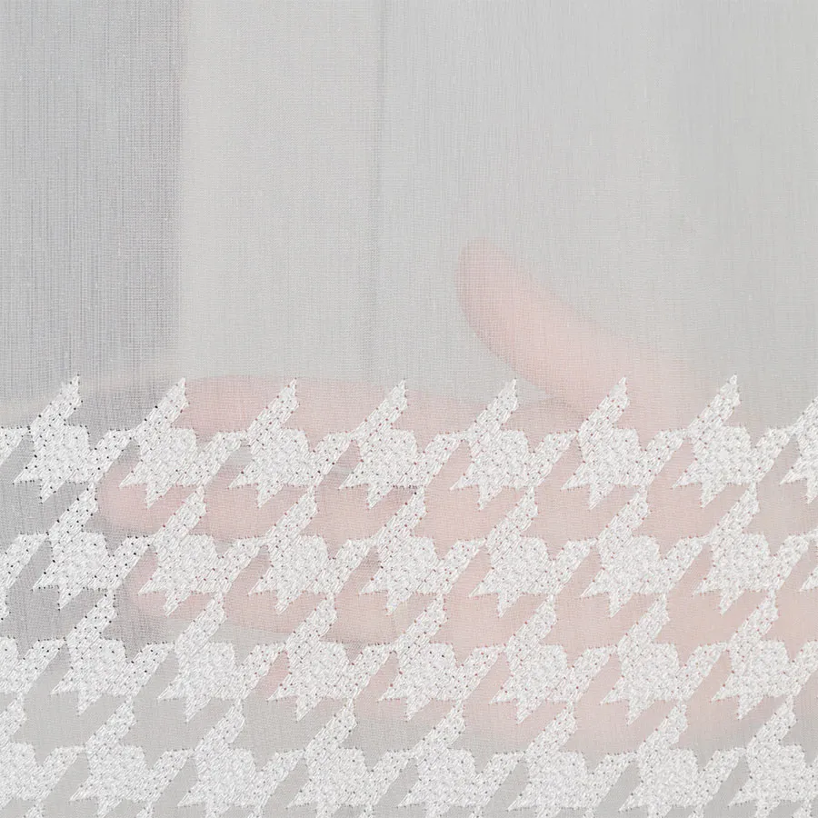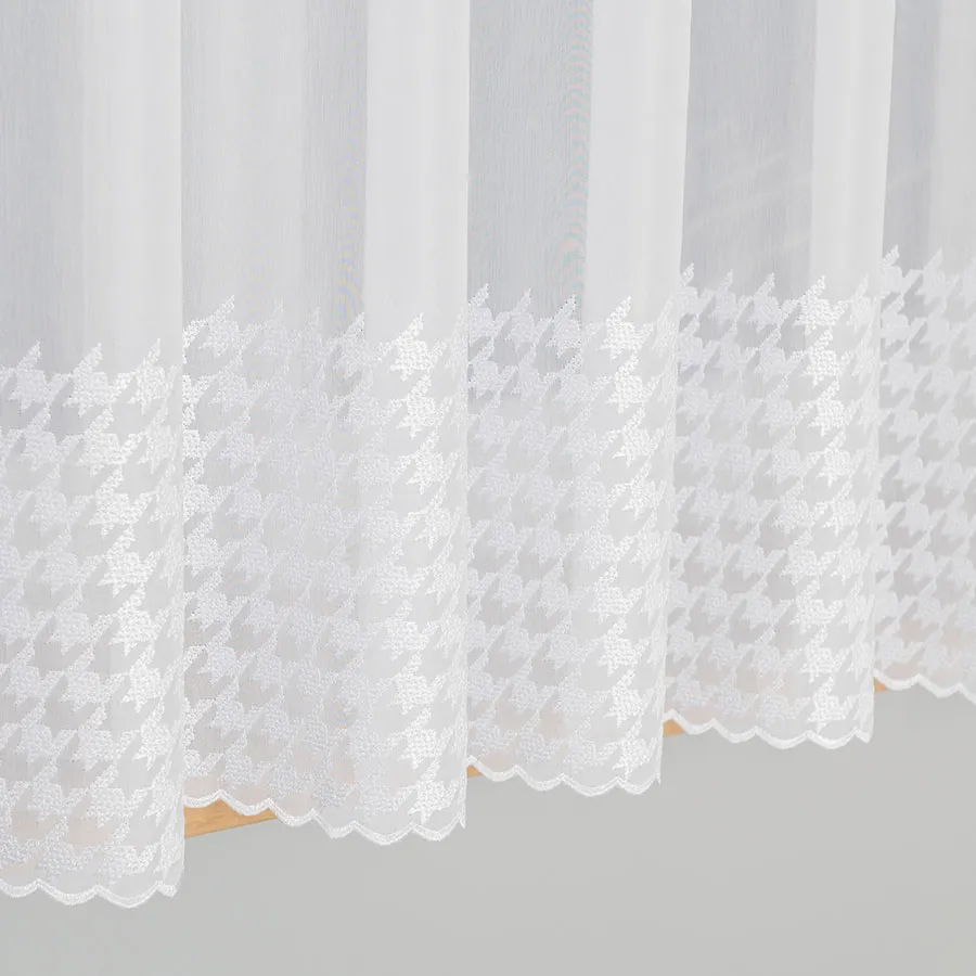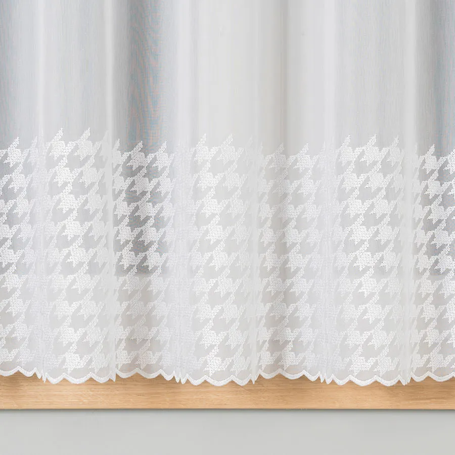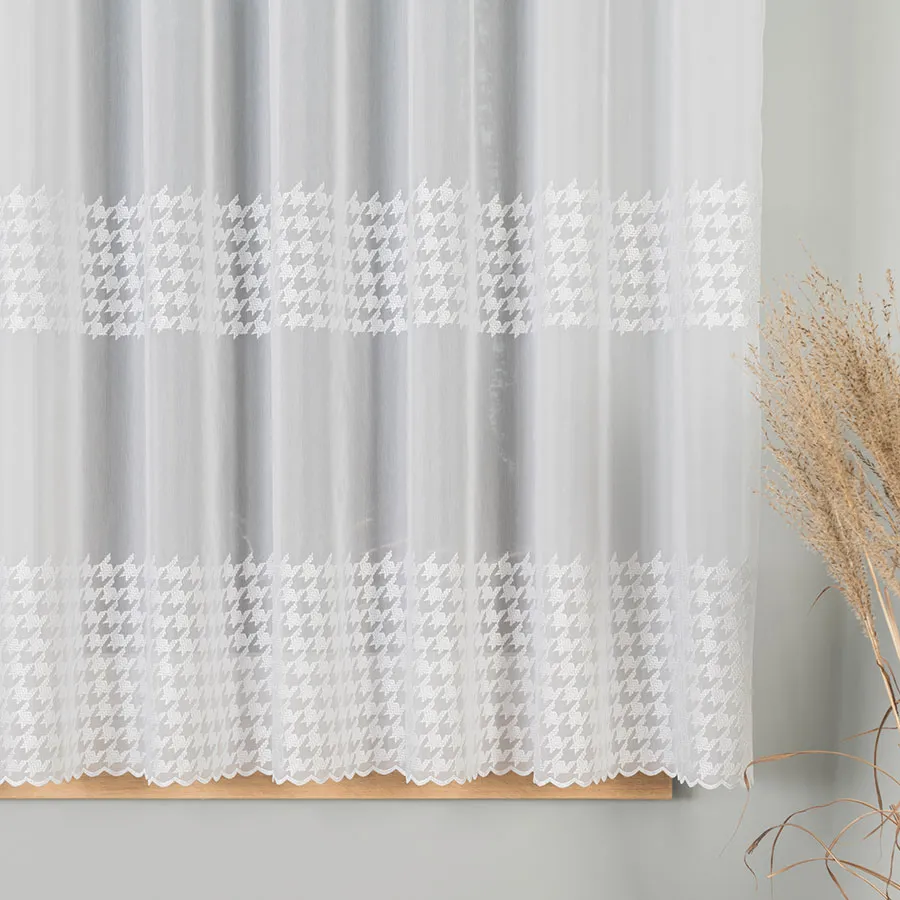 Firanka PEPITKA to efektowna dekoracja okienna w nowoczesnym stylu. Należy do grupy tekstyliów o subtelnej fakturze batystu i etaminy – jest delikatna i półprzezroczysta, idealnie nadaje się zatem do wszelkich pokojów dziennych, kuchni lub sypialni. Haftowana aplikacja – wzór pepitki – na dole firanki dodaje stylizacji okiennej szyku i niewymuszonej elegancji.