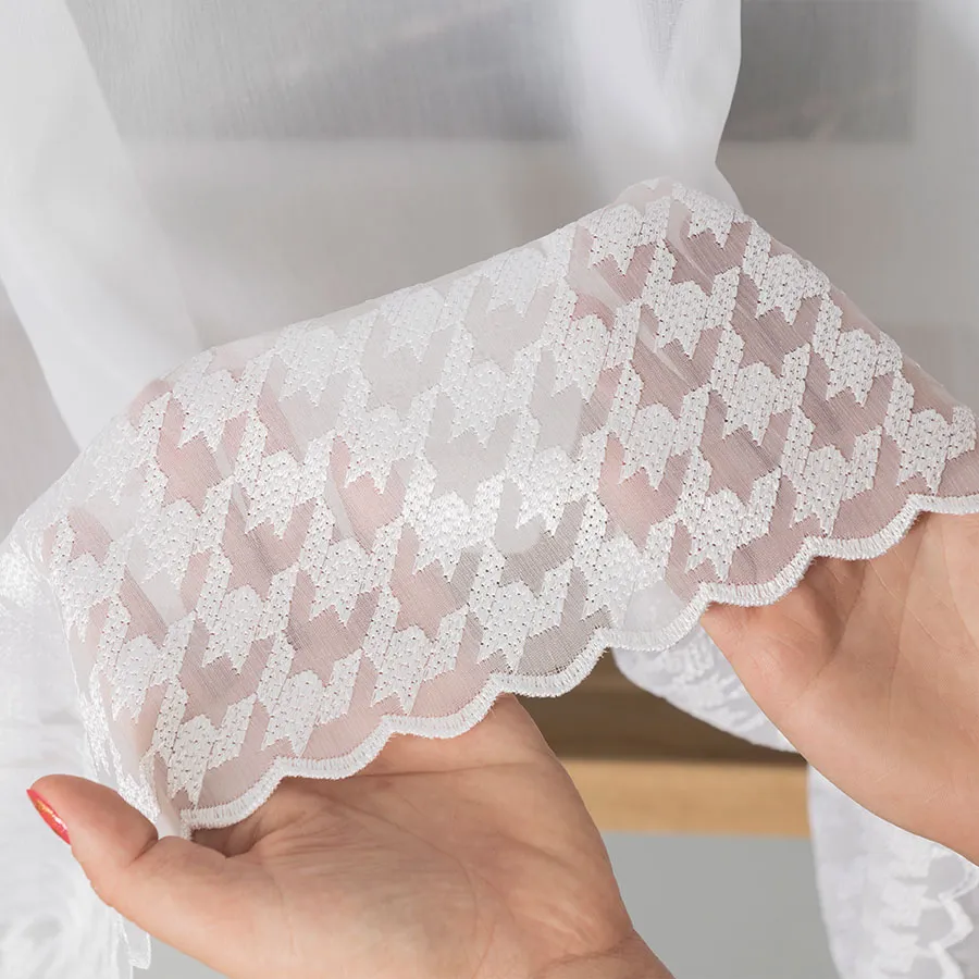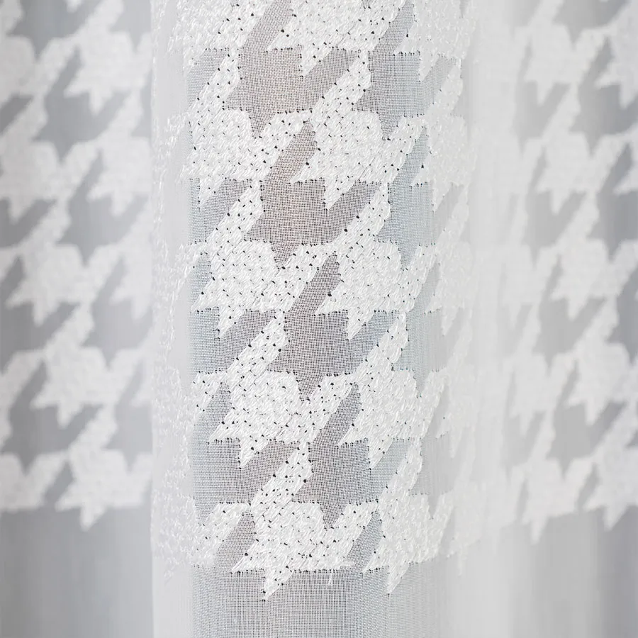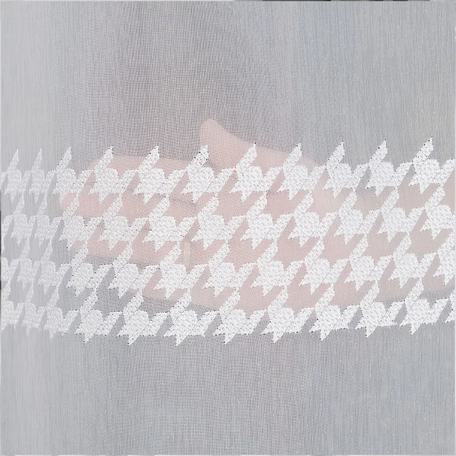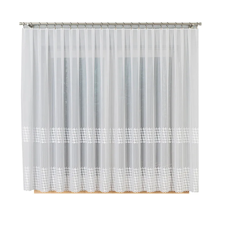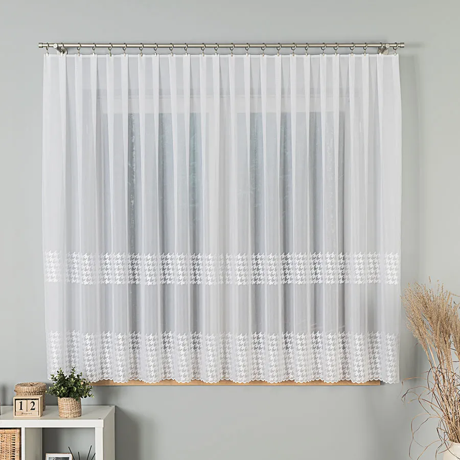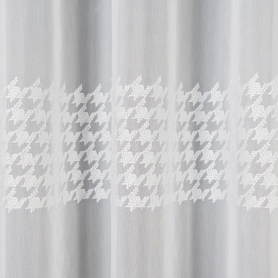 Firanka PEPITKA to efektowna dekoracja okienna w nowoczesnym stylu. Należy do grupy tekstyliów o subtelnej fakturze batystu i etaminy – jest delikatna i półprzezroczysta, idealnie nadaje się zatem do wszelkich pokojów dziennych, kuchni lub sypialni. Haftowana aplikacja – wzór pepitki – na dole firanki dodaje stylizacji okiennej szyku i niewymuszonej elegancji.