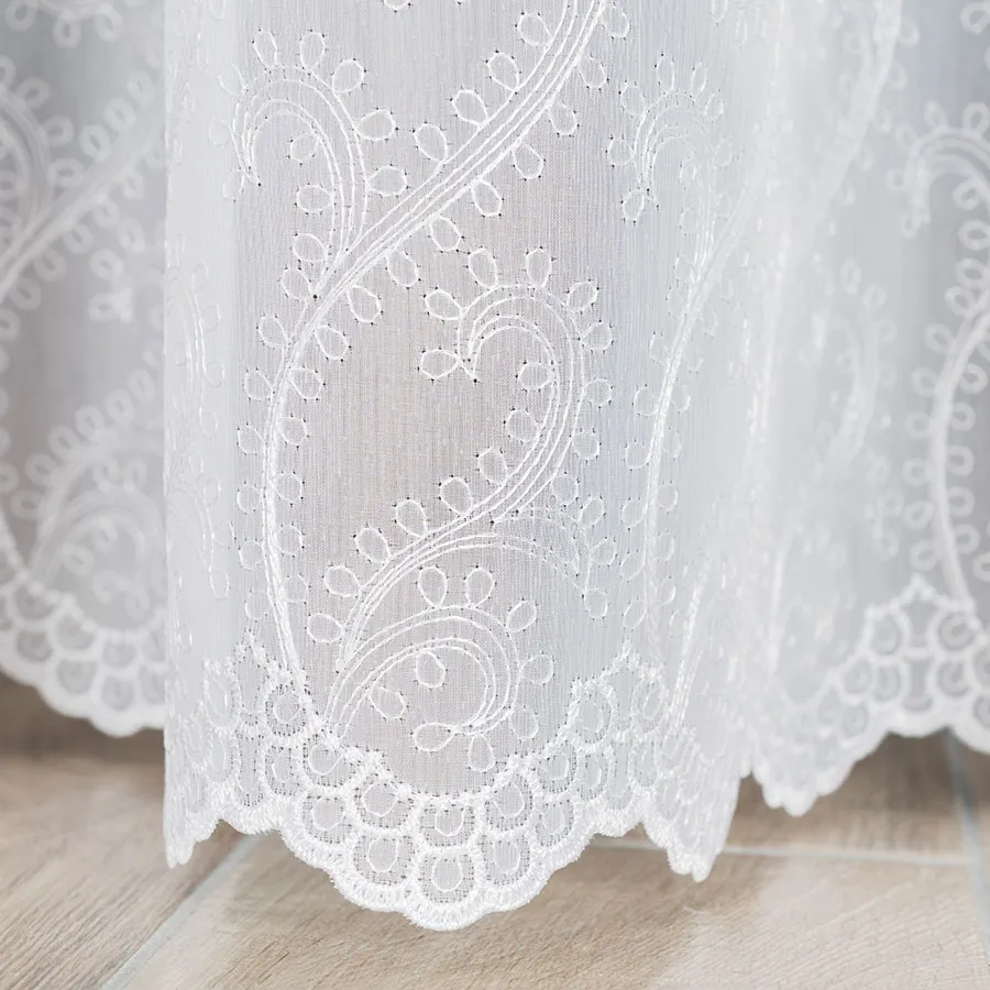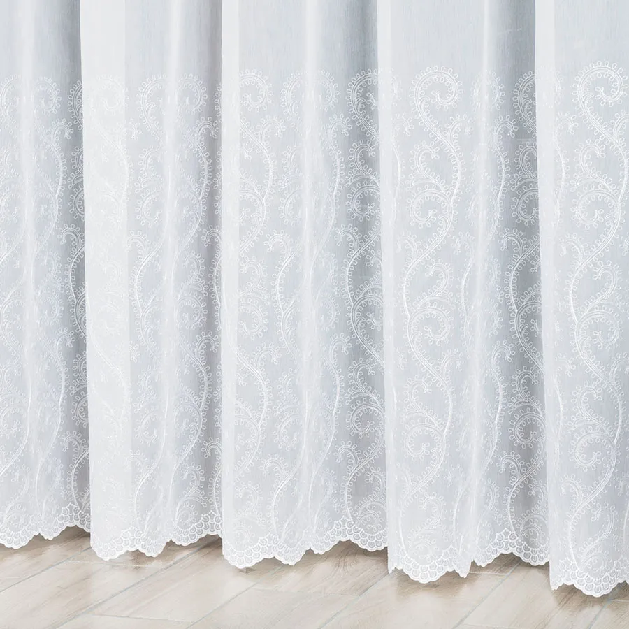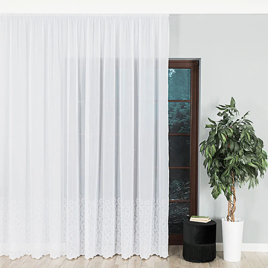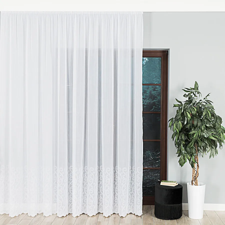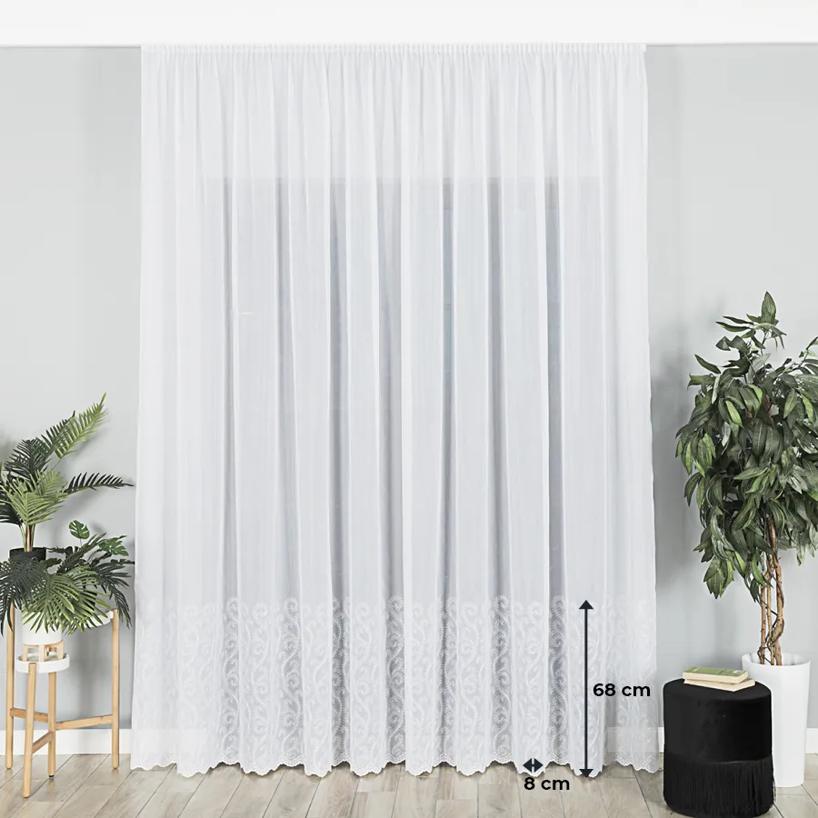 Firanka gotowa Gatitos z taśmą marszczącą to przykład eleganckiej, ponadczasowej dekoracji okna. Uszyta z delikatnego batystu z domieszką etaminy jest delikatna w dotyku i niezwykłe plastyczna. Subtelny połysk i jedwabista miękkość tkaniny sprawiają, że okno z firanką Gatitos jest ozdobą każdego pomieszczenia. Szlachetny materiał i świetnie dobrana taśma sprawiają, że firana układa się w idealnie równe fałdy. Jej zaletą jest również elegancka haftowana bordiura w formie poprzecznego szlaku na dole firany. Wzór bordiury to delikatny deseń roślinny, poprowadzony w poprzek na dole firany. Dolny brzeg ma formę haftowanej falbany, która jest zarazem zakończeniem wzoru. Górna część firany jest gładka, przez co całość zyskuje elegancki wygląd bez nadmiaru wzorów.