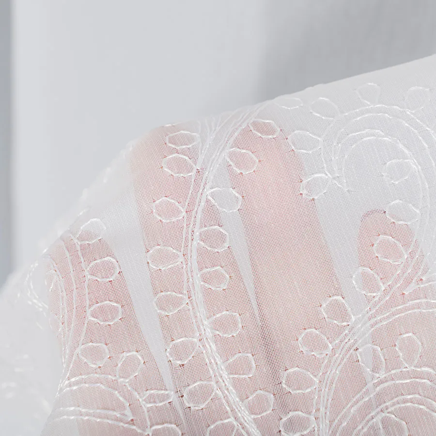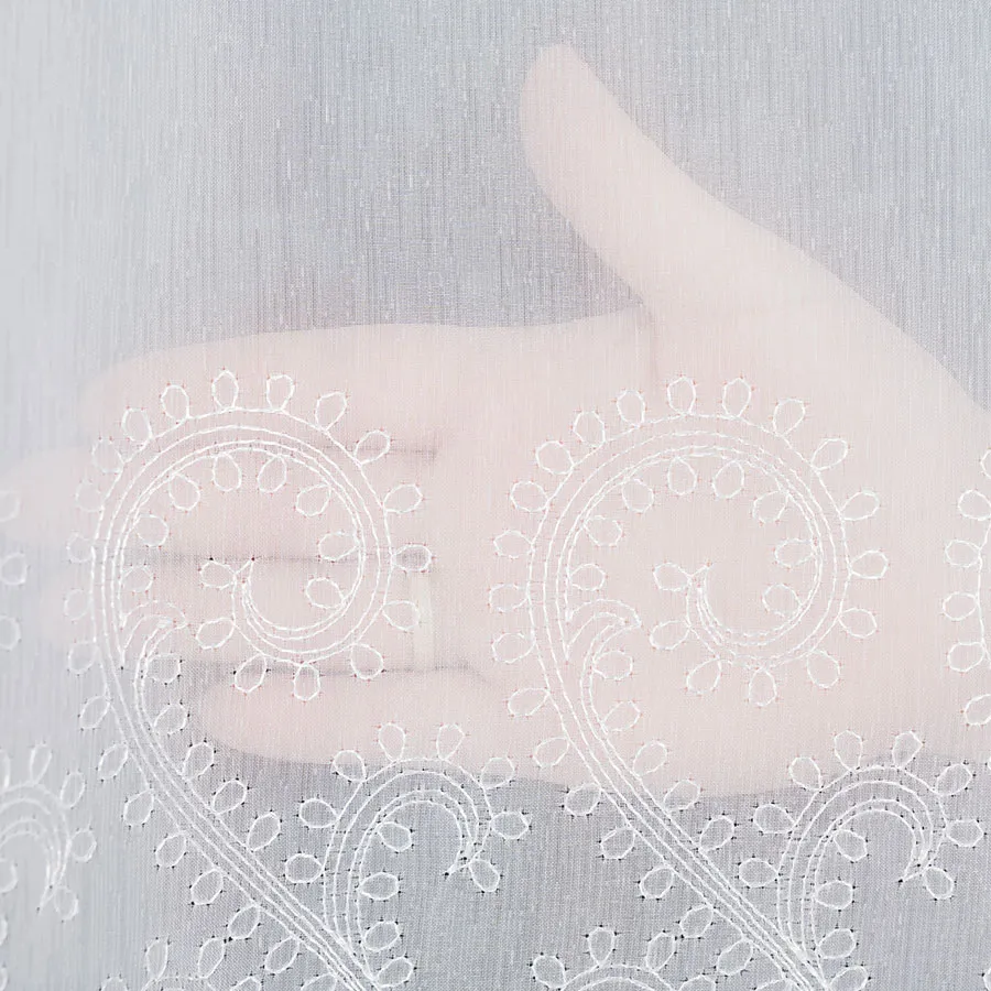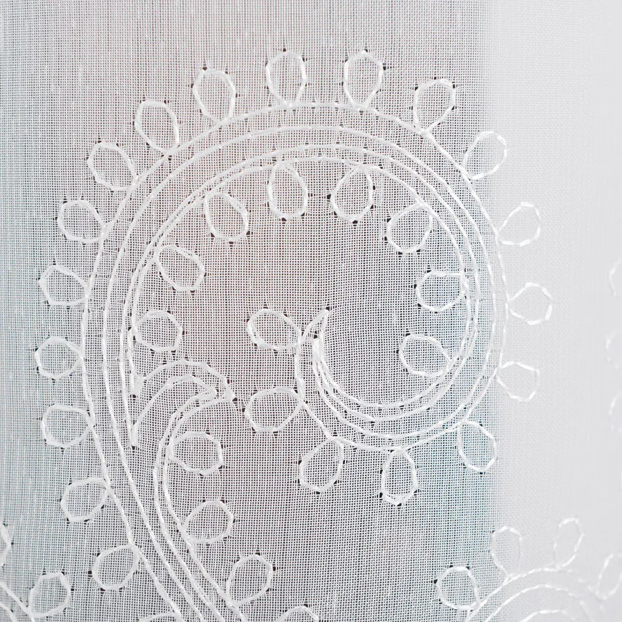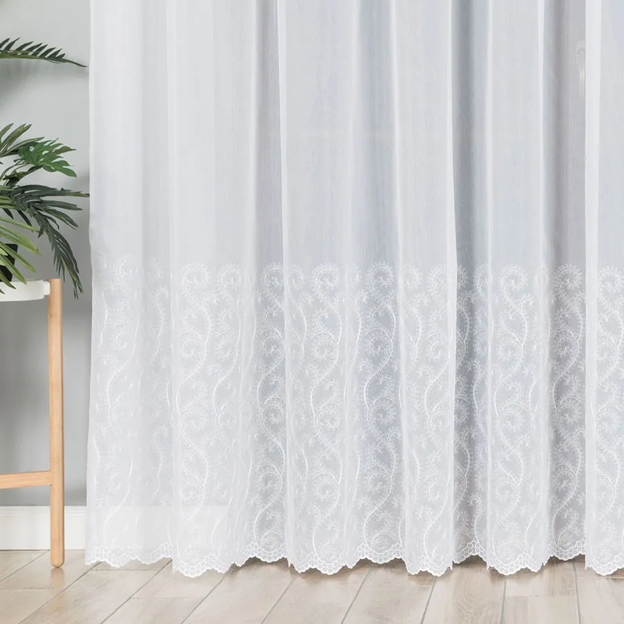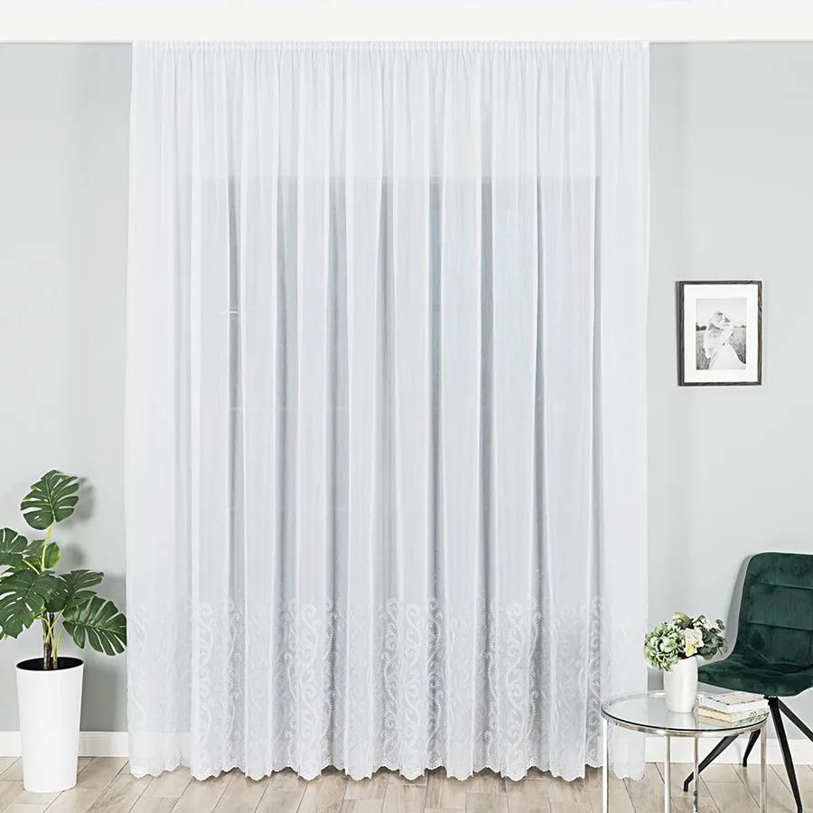 Firanka gotowa Gatitos z taśmą marszczącą to przykład eleganckiej, ponadczasowej dekoracji okna. Uszyta z delikatnego batystu z domieszką etaminy jest delikatna w dotyku i niezwykłe plastyczna. Subtelny połysk i jedwabista miękkość tkaniny sprawiają, że okno z firanką Gatitos jest ozdobą każdego pomieszczenia. Szlachetny materiał i świetnie dobrana taśma sprawiają, że firana układa się w idealnie równe fałdy. Jej zaletą jest również elegancka haftowana bordiura w formie poprzecznego szlaku na dole firany. Wzór bordiury to delikatny deseń roślinny, poprowadzony w poprzek na dole firany. Dolny brzeg ma formę haftowanej falbany, która jest zarazem zakończeniem wzoru. Górna część firany jest gładka, przez co całość zyskuje elegancki wygląd bez nadmiaru wzorów.