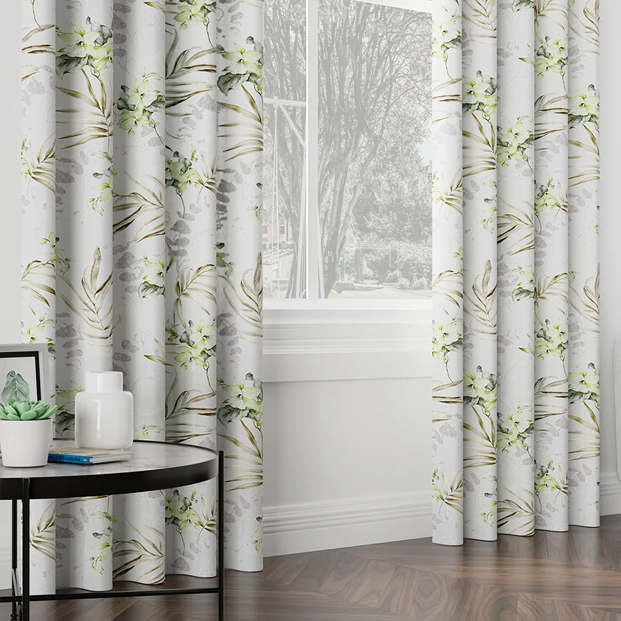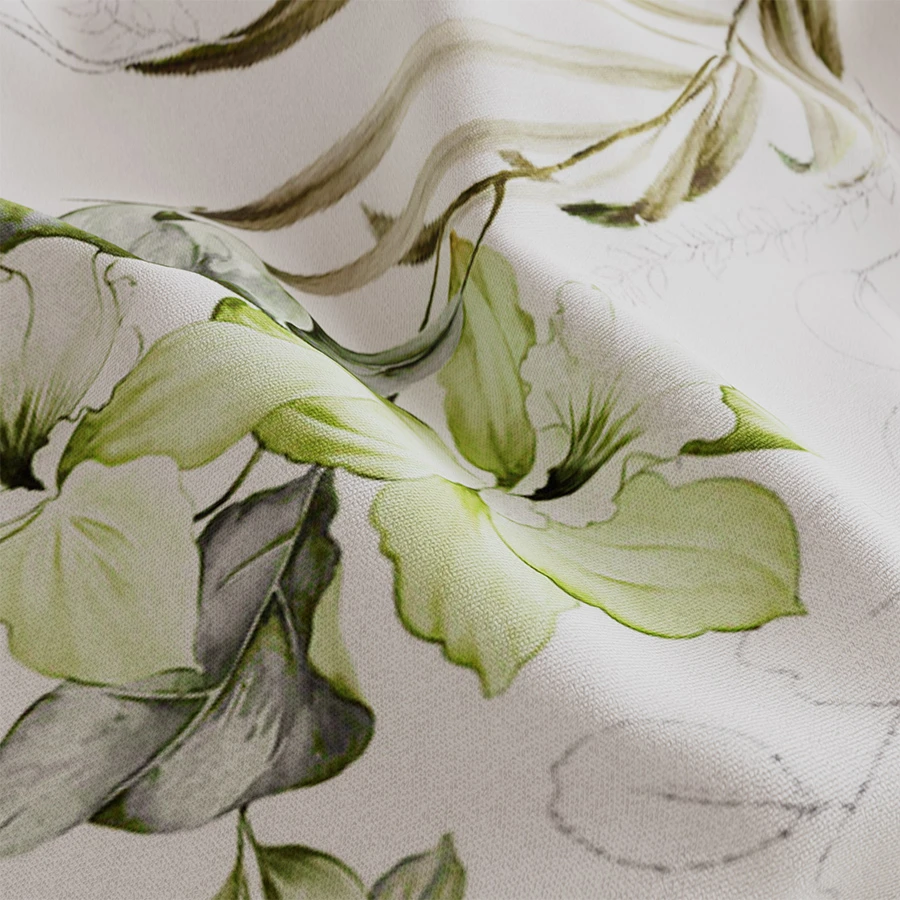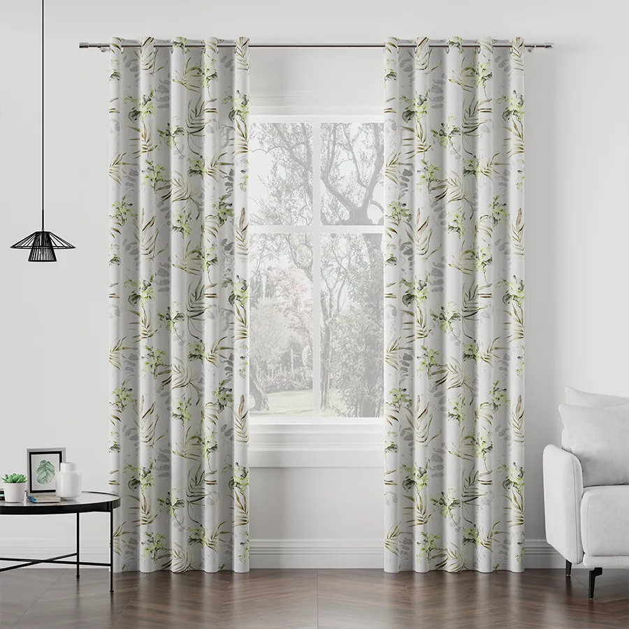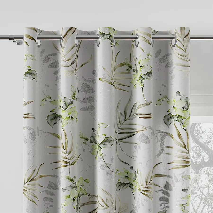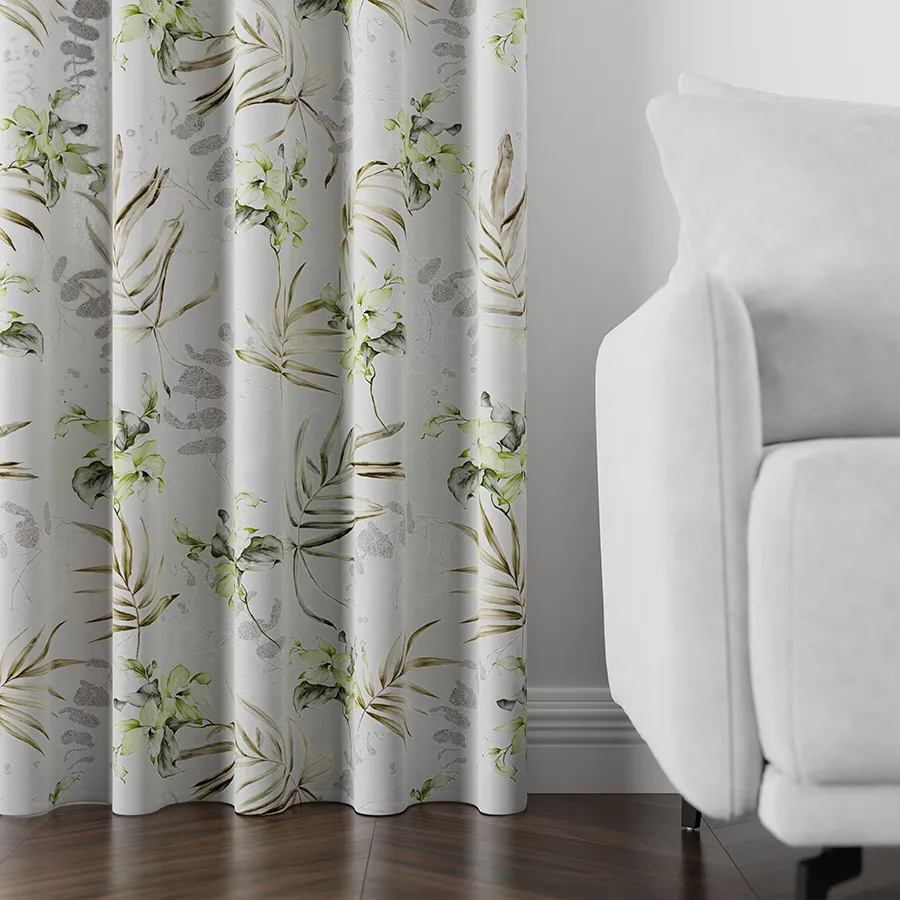 Gładki, półzaciemniający materiał z pięknym motywem roślinnym, dostępny w czterech pastelowych wersjach kolorystycznych. Wysoka gramatura i gęstość materiału gwarantują dość mocne zaciemnienie. Materiał jest miękki i "lejący", dzięki czemu wspaniale się układa, tworząc piękną dekorację. Materiał idealny na zasłony, poszewki lub narzuty.