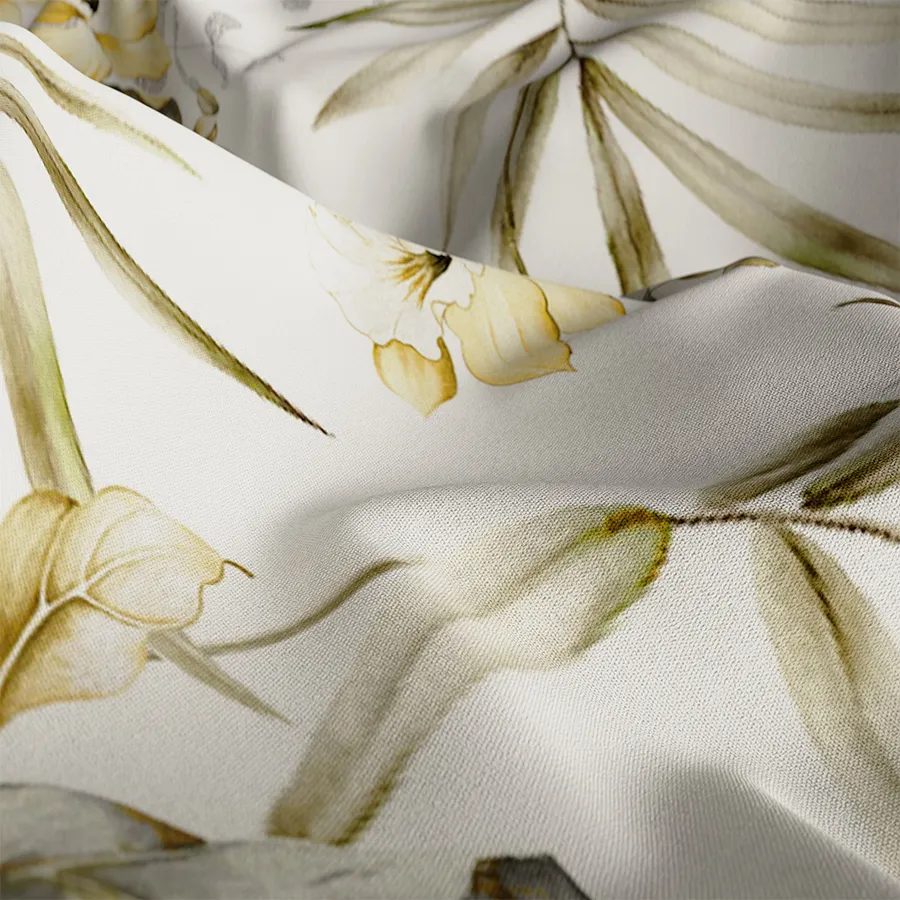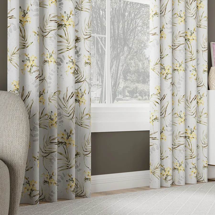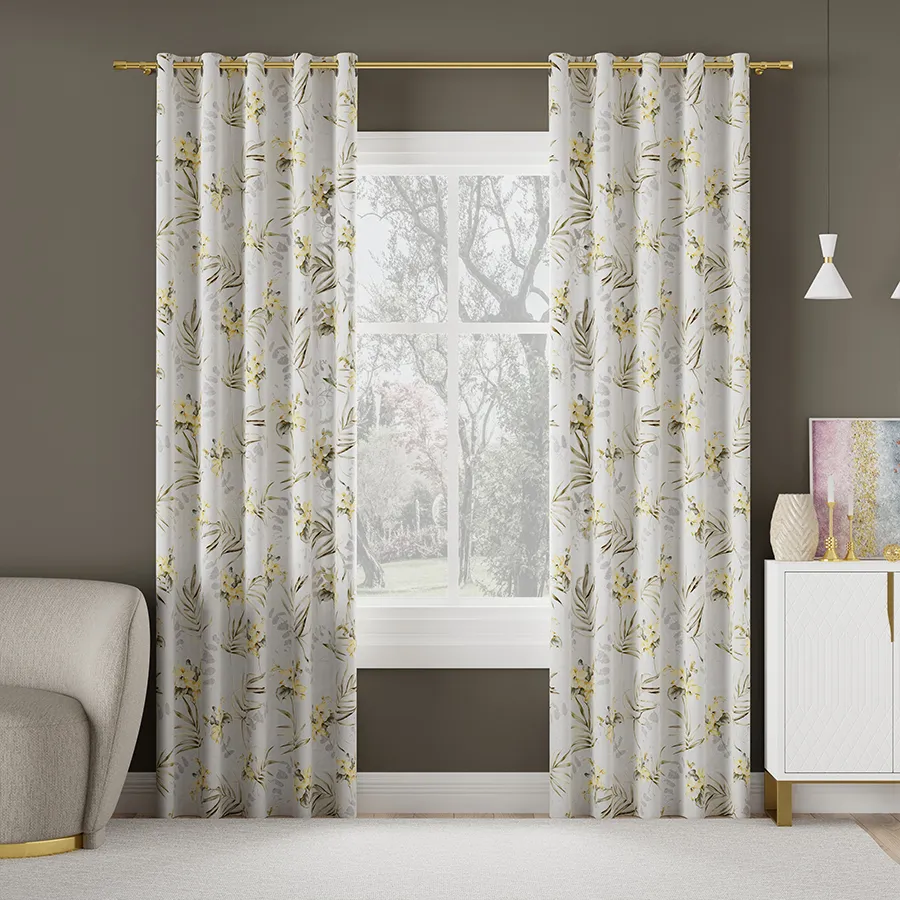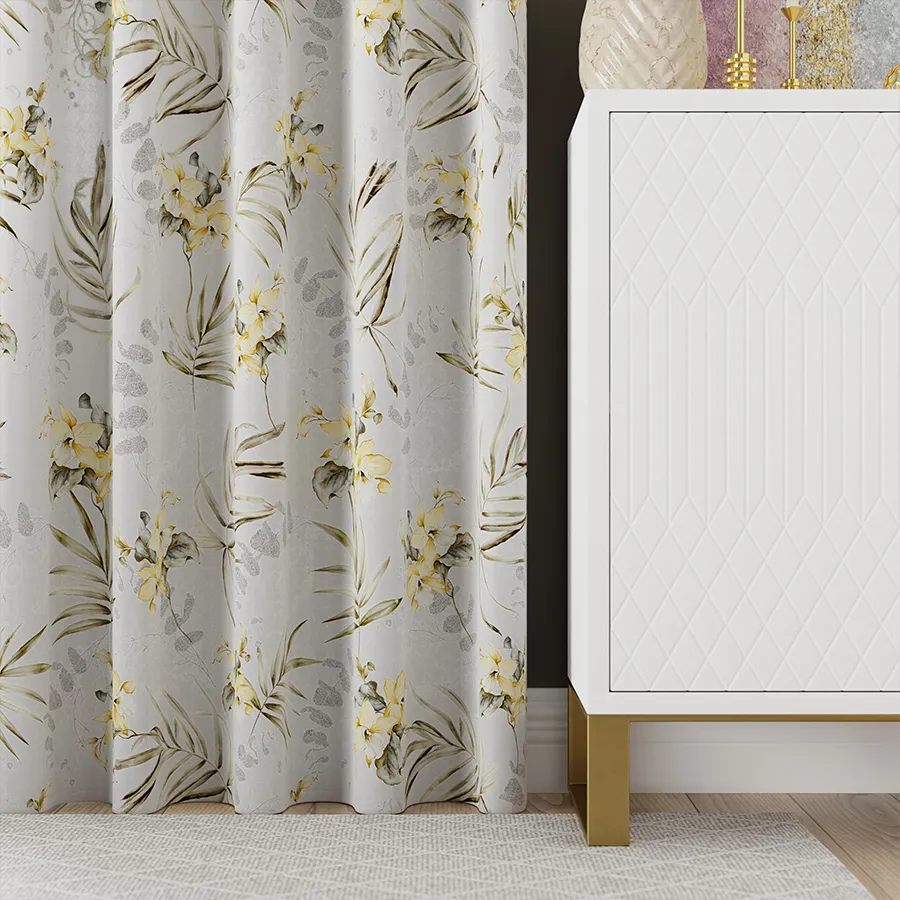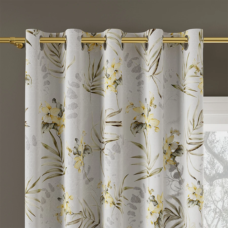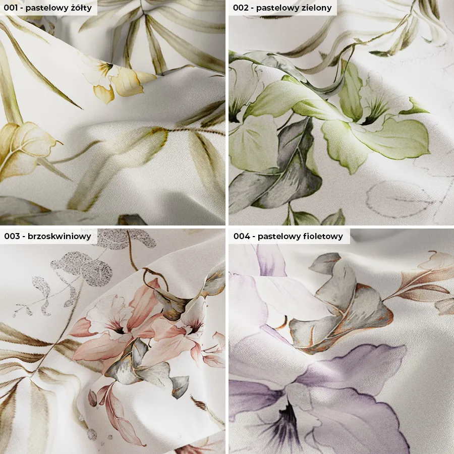 Gładki, półzaciemniający materiał z pięknym motywem roślinnym, dostępny w czterech pastelowych wersjach kolorystycznych. Wysoka gramatura i gęstość materiału gwarantują dość mocne zaciemnienie. Materiał jest miękki i "lejący", dzięki czemu wspaniale się układa, tworząc piękną dekorację. Materiał idealny na zasłony, poszewki lub narzuty.