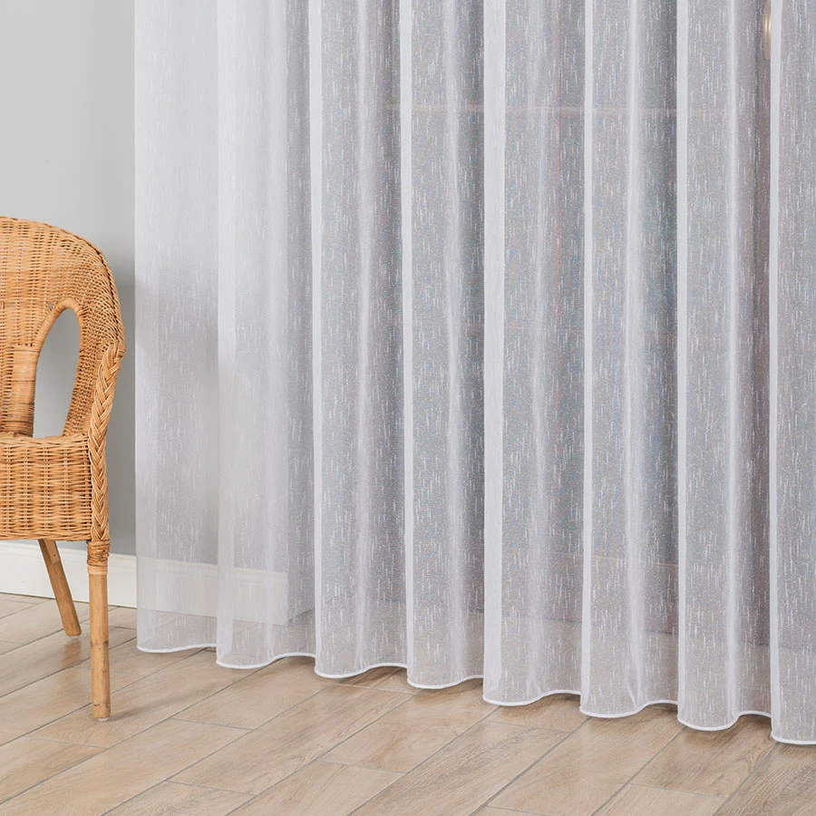 Odkryj lekką i stylową firanę gotową wykonaną z wysokiej jakości siatki w kolorze białym. Dolna krawędź została wykończona ołowianką, dzięki czemu firana pięknie się układa i zachowuje swój kształt. Idealna do nowoczesnych i klasycznych wnętrz, zapewniająca subtelny efekt dekoracyjny i delikatne przepuszczanie światła.