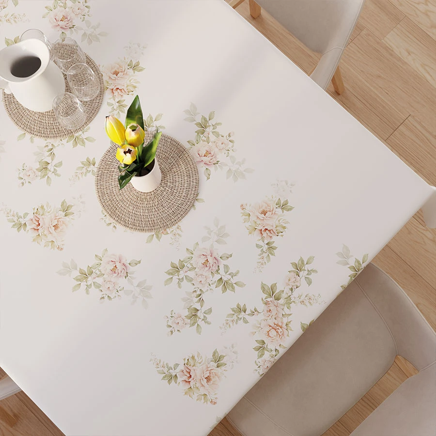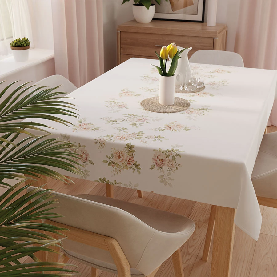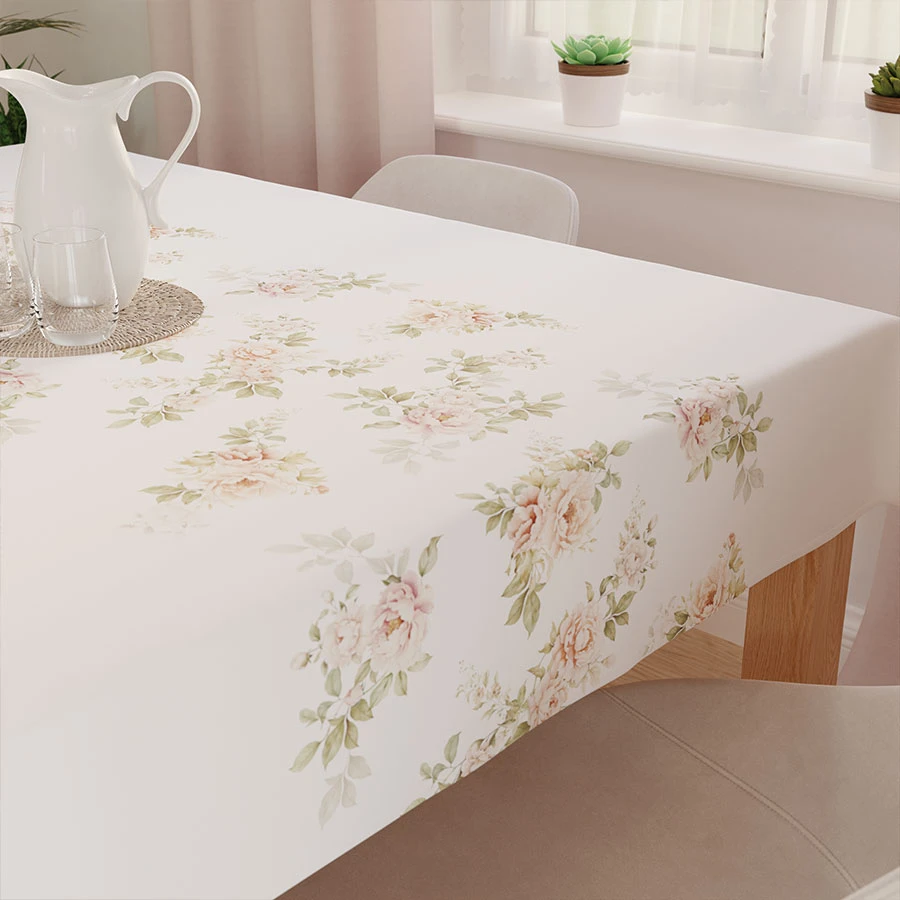 Tkanina doskonale sprawdzi się w salonie, jadalni czy kuchni, nadając wnętrzu lekkości i elegancji. Jej kwiatowy wzór sprawia, że stół staje się prawdziwą ozdobą pomieszczenia.