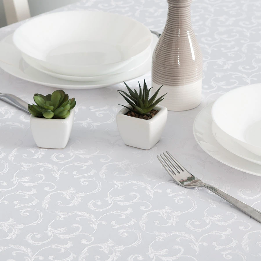 Wodoodporna tkanina z ornamentowym wzorem i błyszczącą przędzą. Trwała, elegancka i łatwa w pielęgnacji – idealna na obrusy i dekoracje.